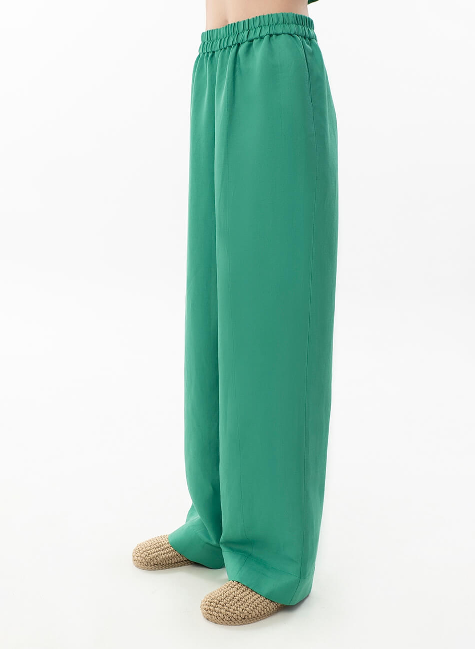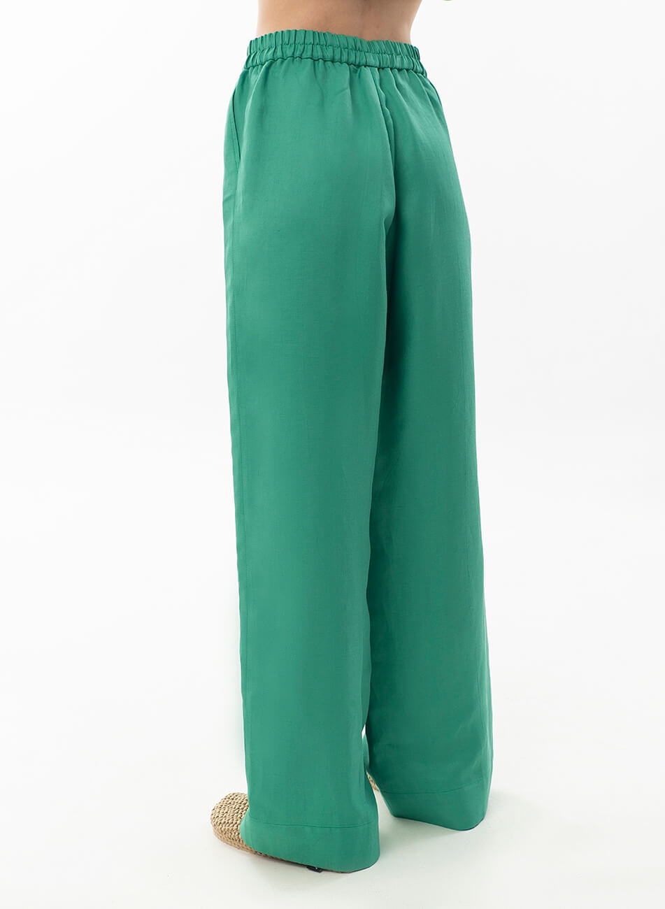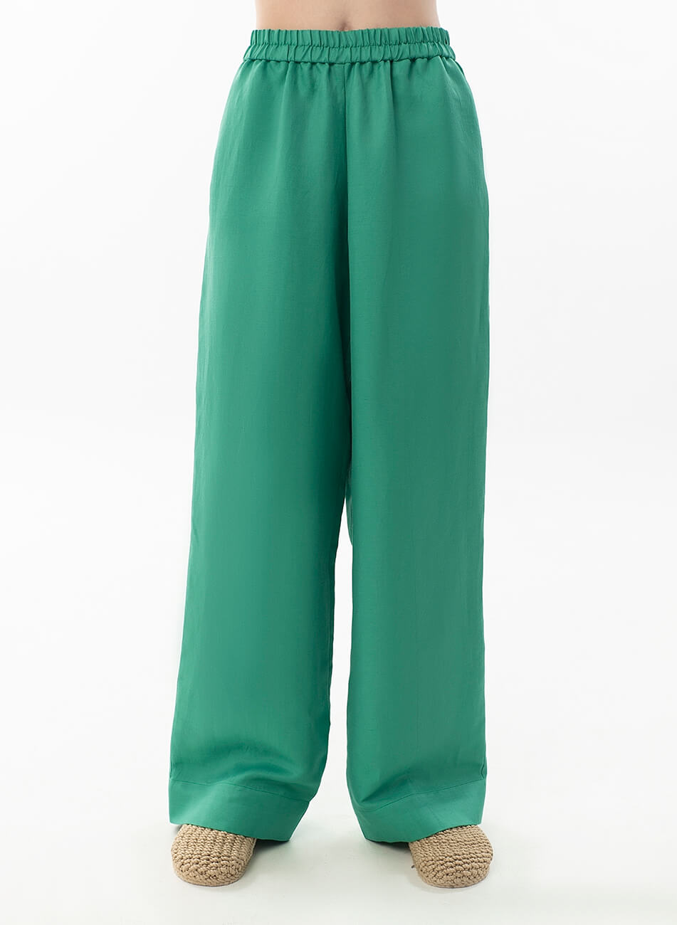 Лляні штани вільного крою. Пояс штанів – гумка. Модель з кишенями та широкими манжетами. Штани можливо доповнити лляними піджаком або сорочкою з колекції Summer 2022.