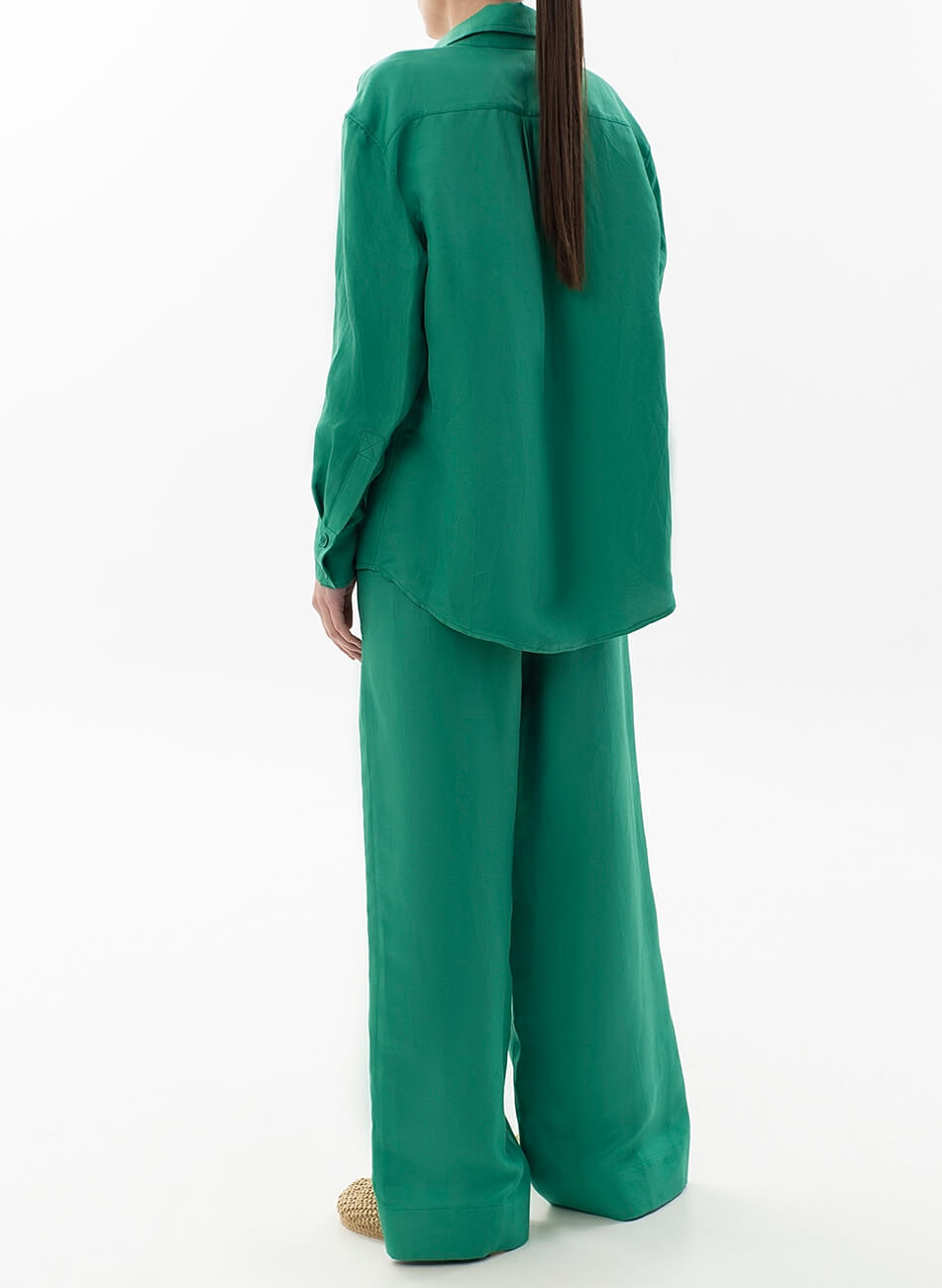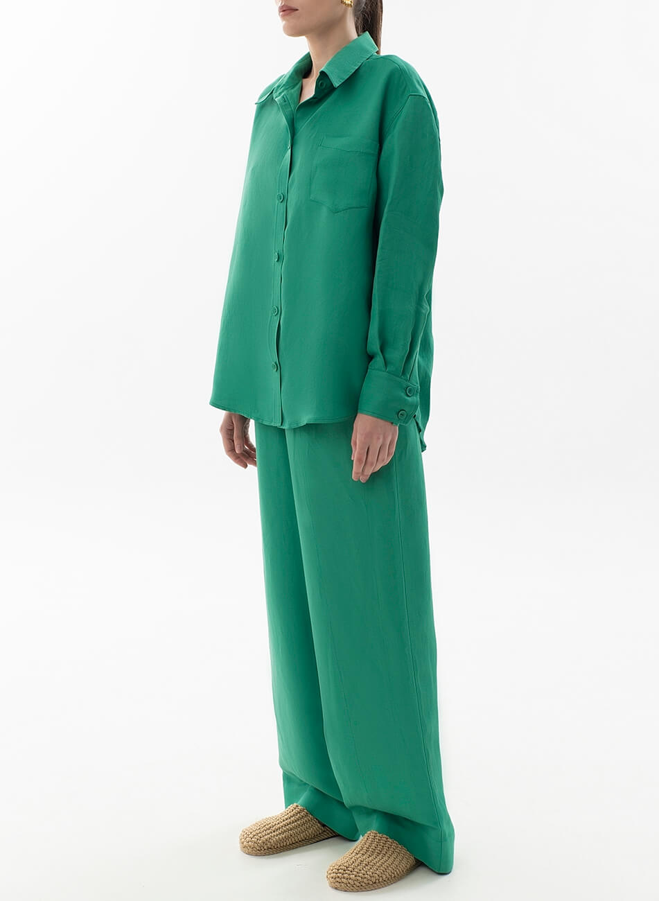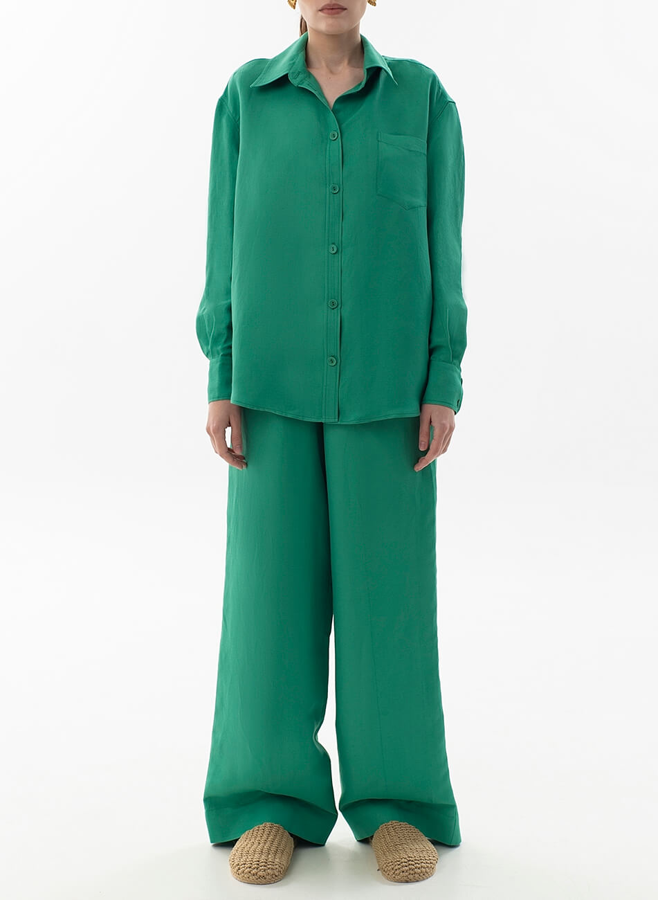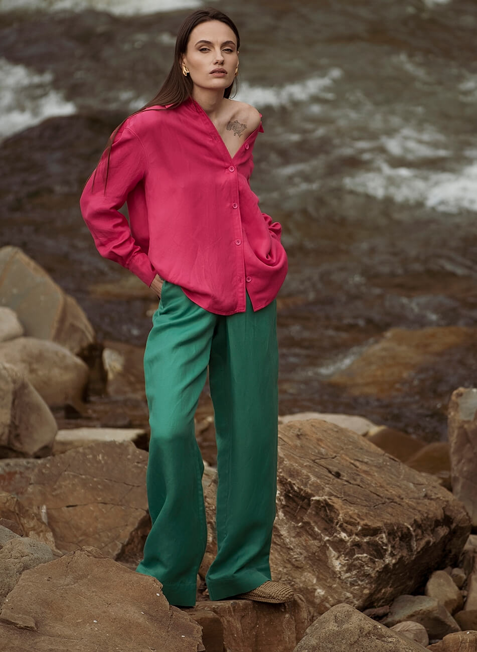 Лляні штани вільного крою. Пояс штанів – гумка. Модель з кишенями та широкими манжетами. Штани можливо доповнити лляними піджаком або сорочкою з колекції Summer 2022.