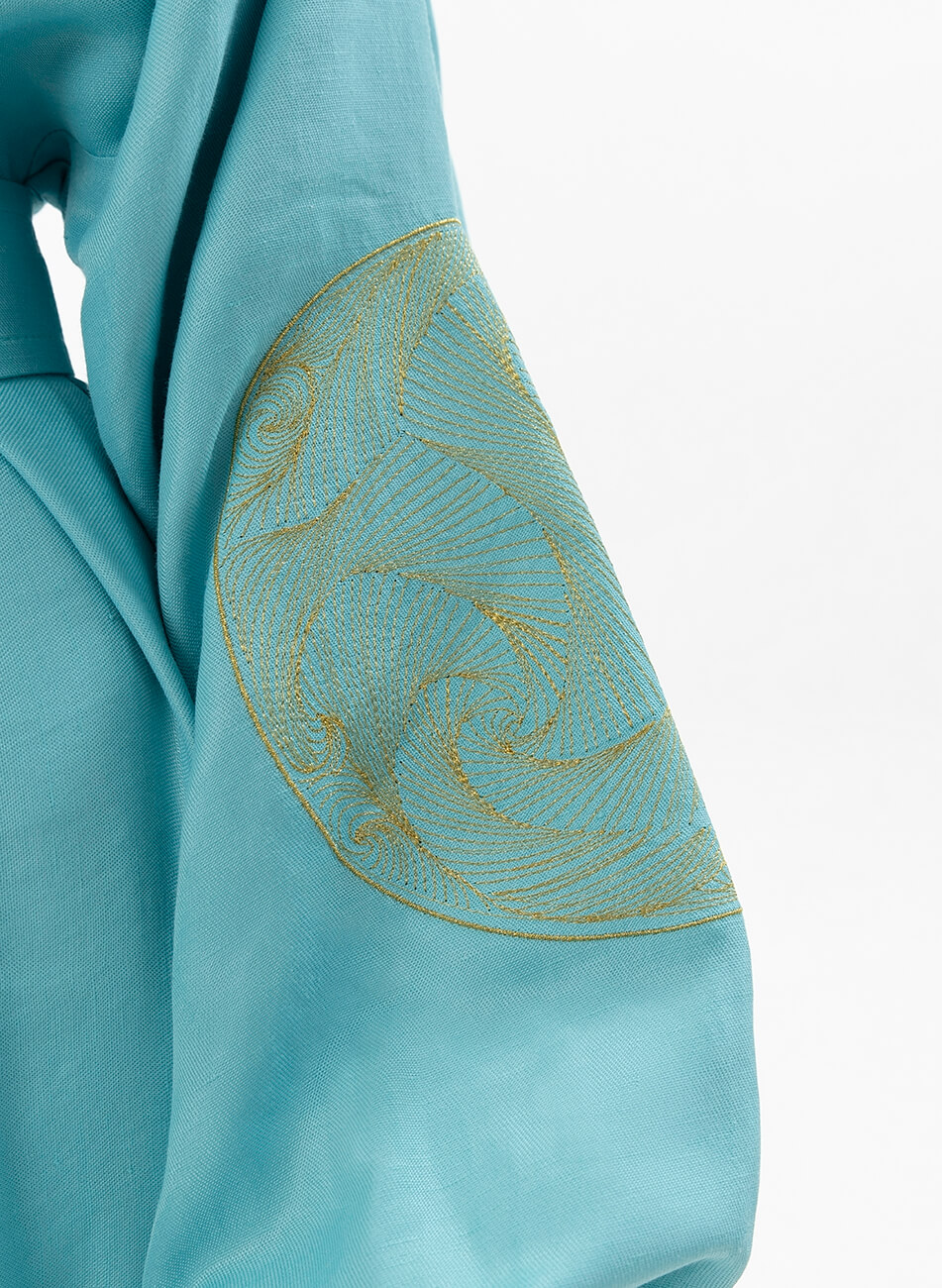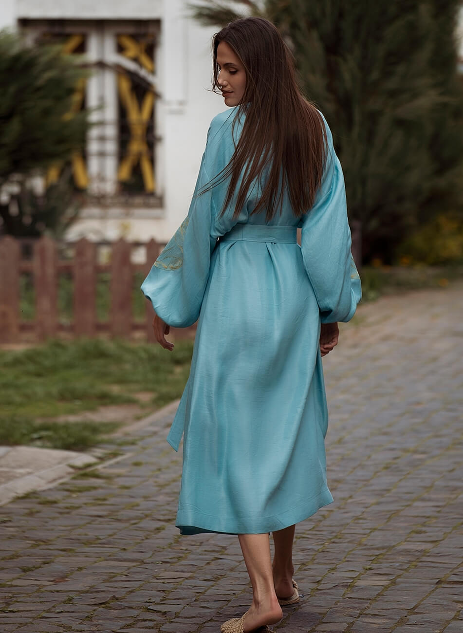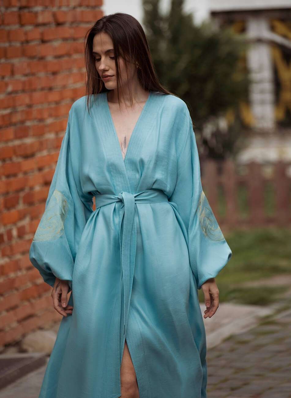 Лляне кімоно прямого крою з вишитими металізованими нитками рукавами. Вишивка на рукавах – символ української ідентичності, а також частина ДНК-бренду. У комплекті до кімоно пояс.