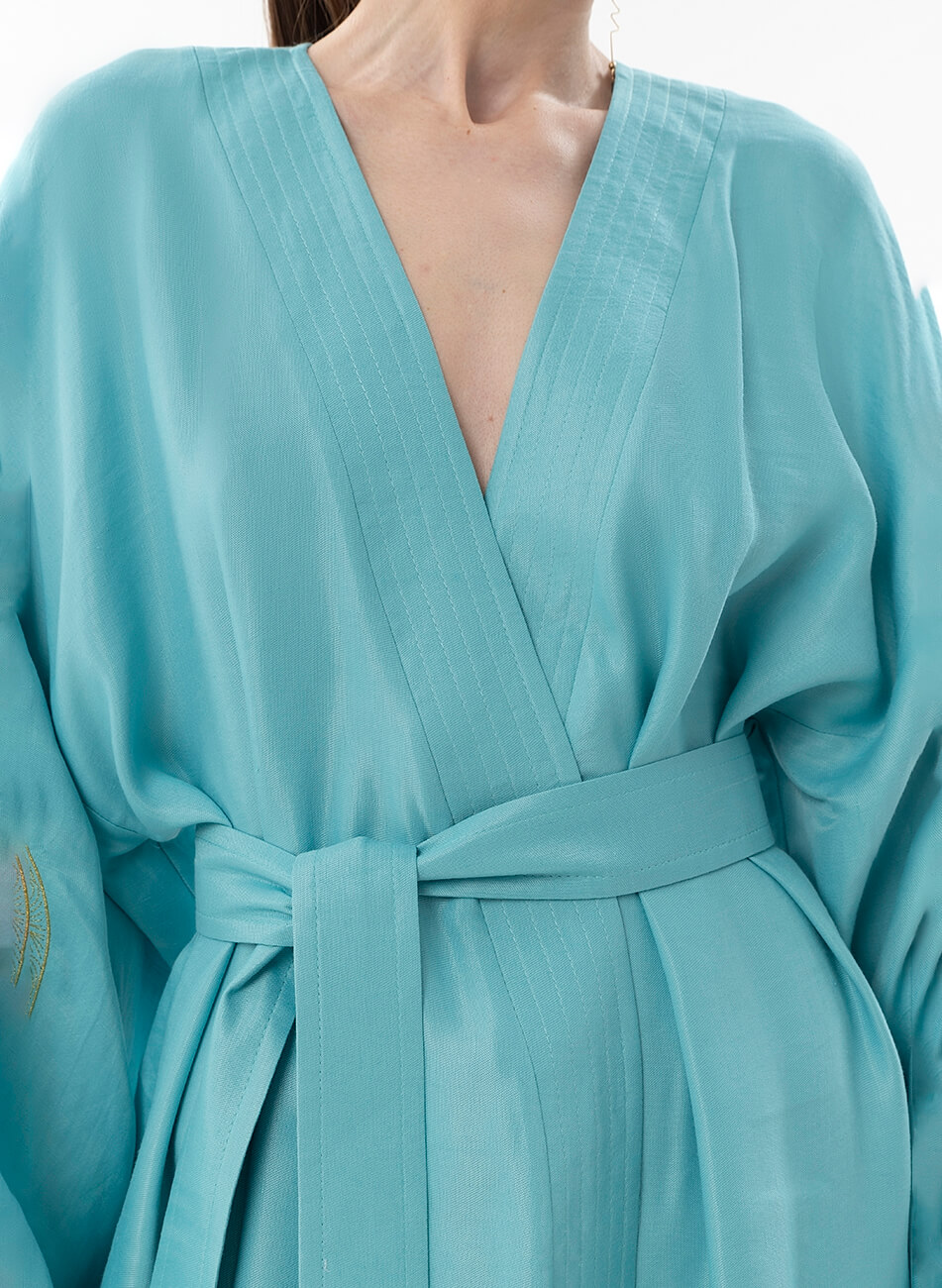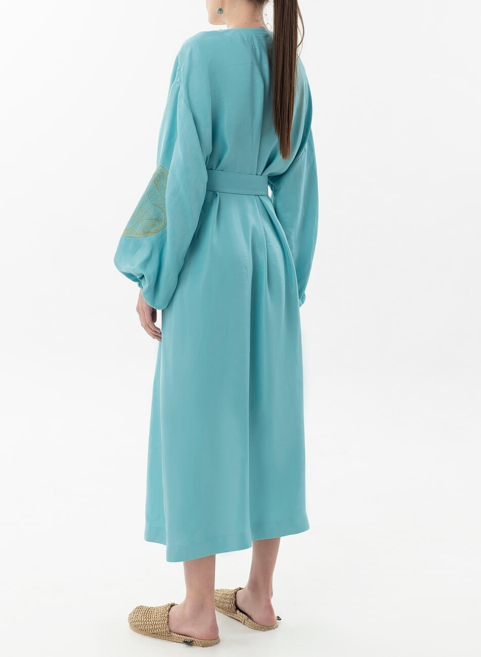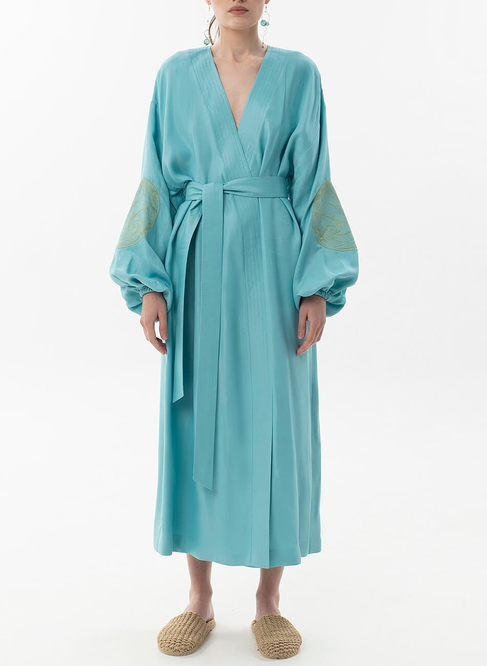 Лляне кімоно прямого крою з вишитими металізованими нитками рукавами. Вишивка на рукавах – символ української ідентичності, а також частина ДНК-бренду. У комплекті до кімоно пояс.