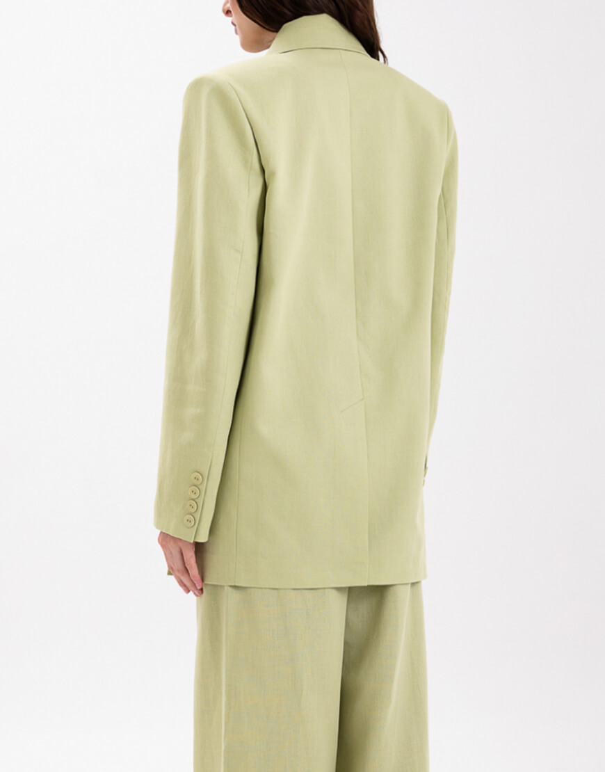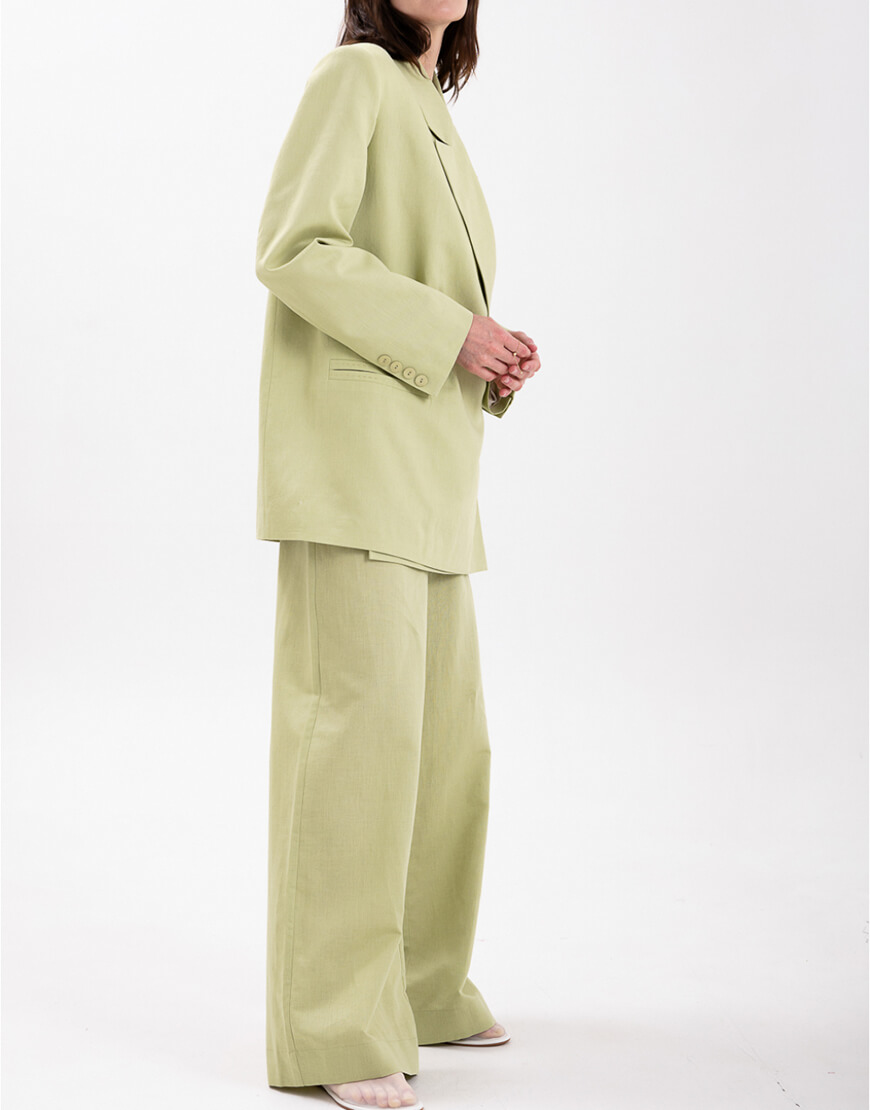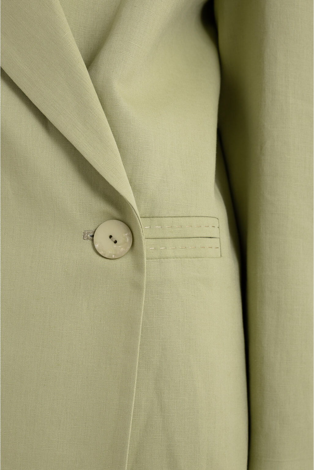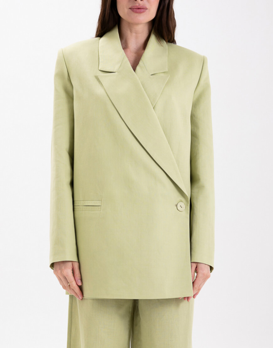 Жакет з іспанського льону з додаванням бавовни. Пола жакета має глибокий запах, який перекриває половину кишені та фіксується на ґудзик. У розстебнутому вигляді ґудзик ховається в кишені.