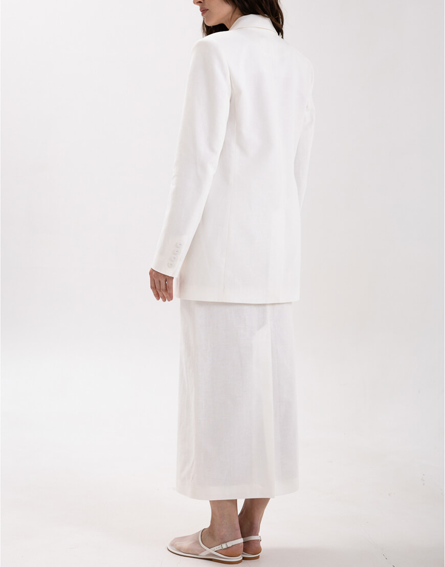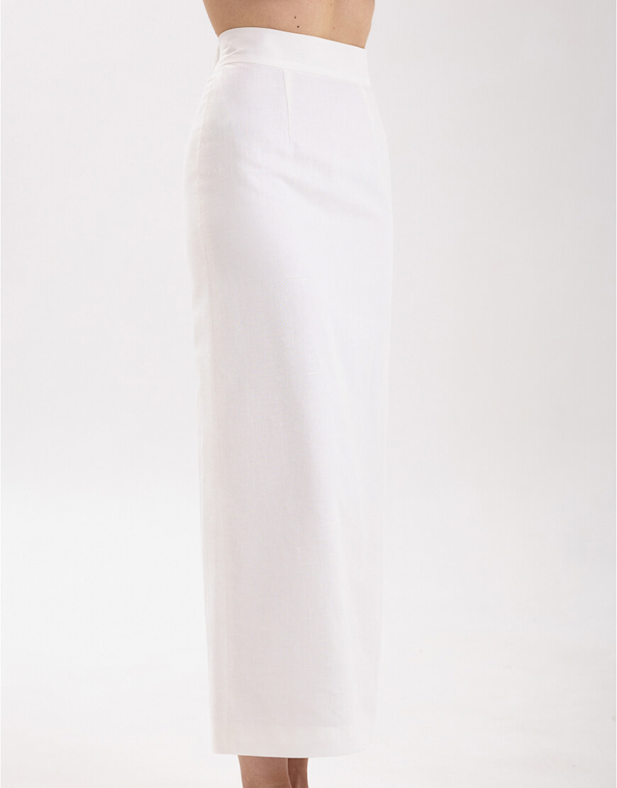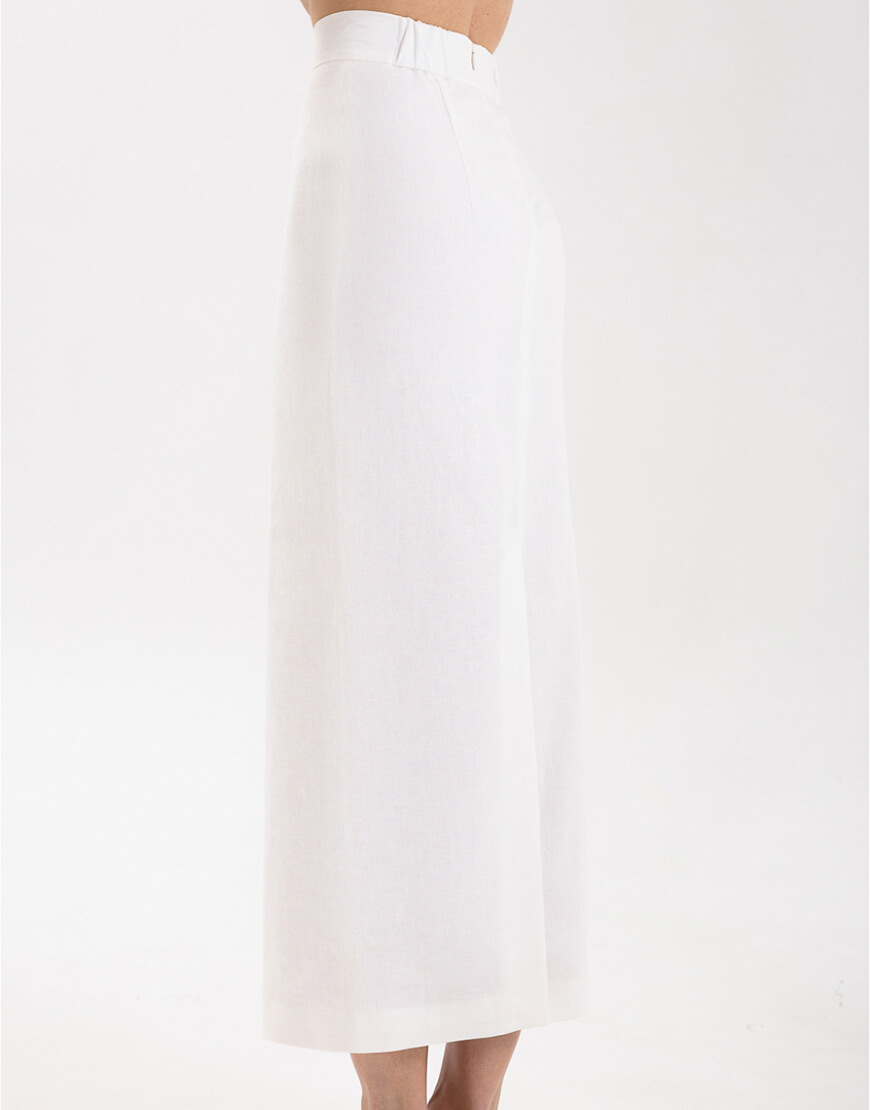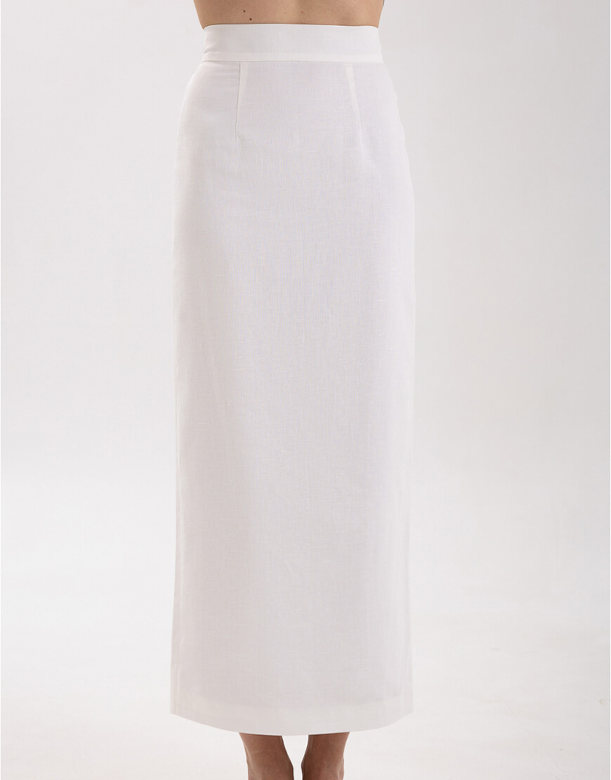 Міді-спідниця з іспанського льону з додаванням бавовни прямого крою зі шліцею. Спідниця має підкладку.