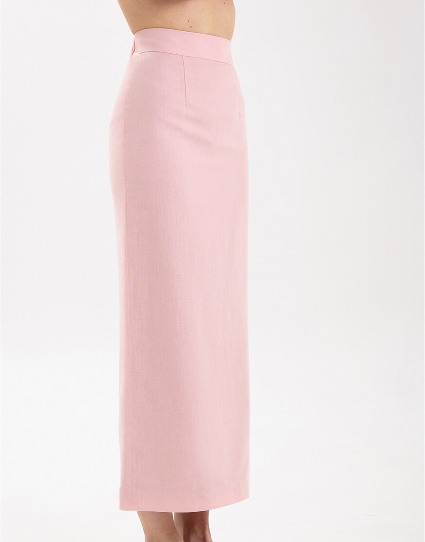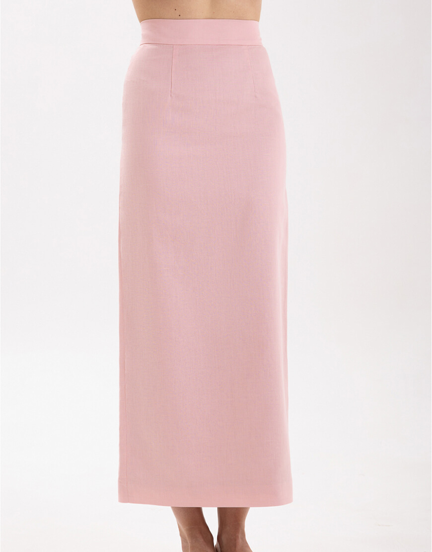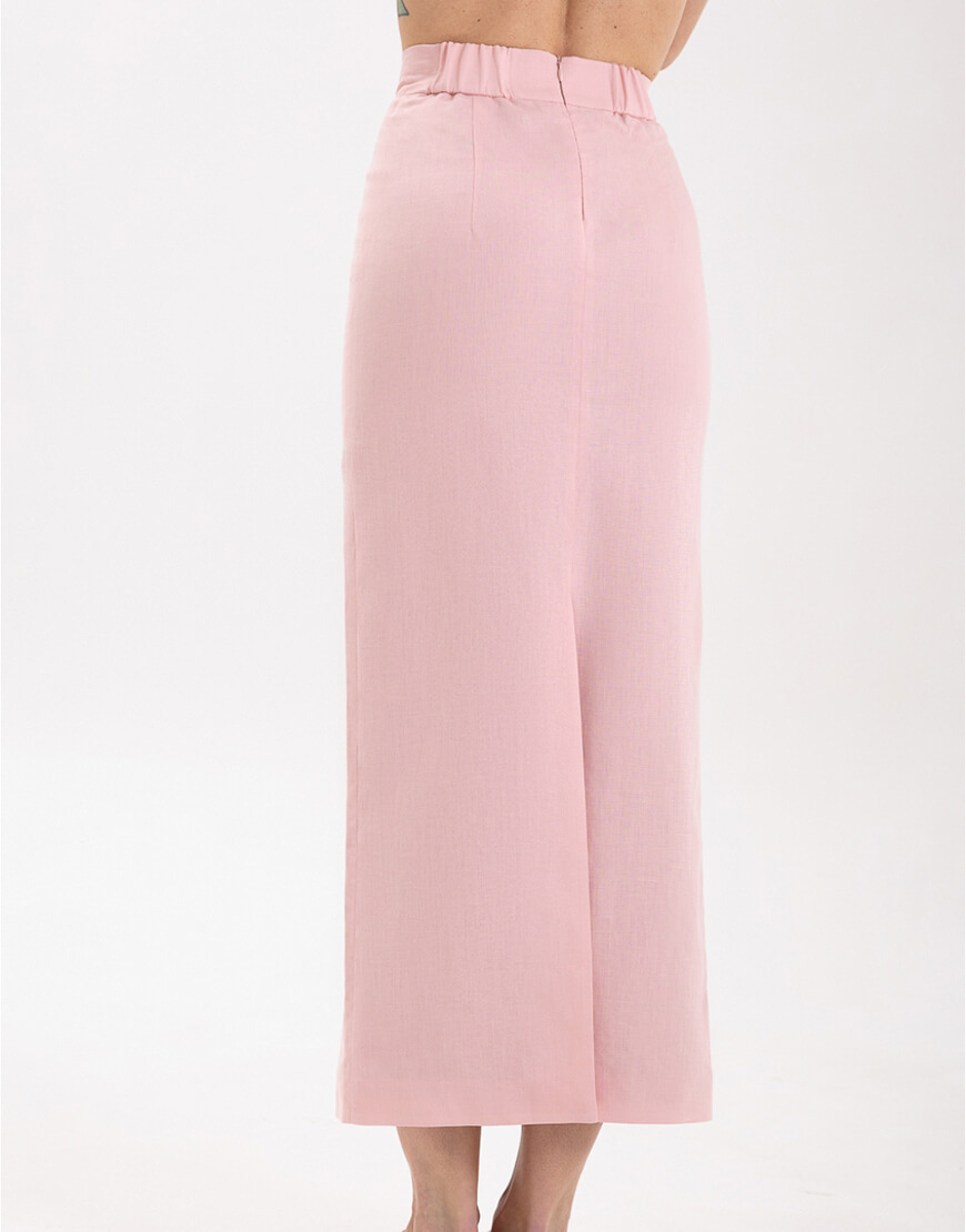 Міді-спідниця з іспанського льону з додаванням бавовни прямого крою зі шліцею. Спідниця має підкладку.