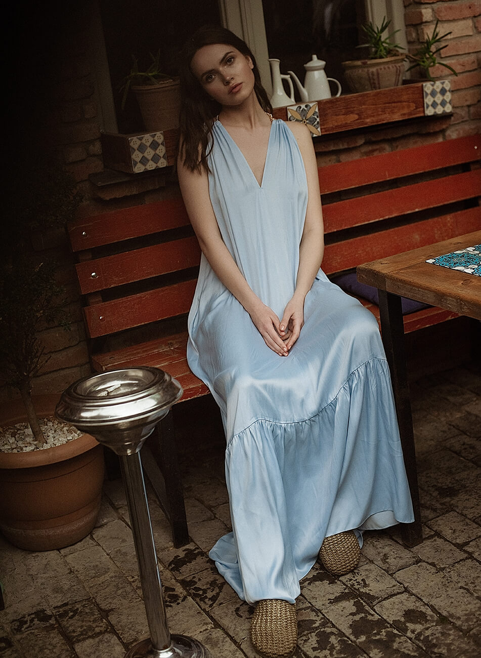 Пляжний сарафан-трансформер із ланцюгом. Перед і спинка виробу можуть мінятися своїми місцями, також може змінюватися фіксувальний елемент: ланцюг або стрічка з основної тканини.