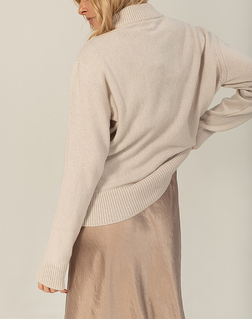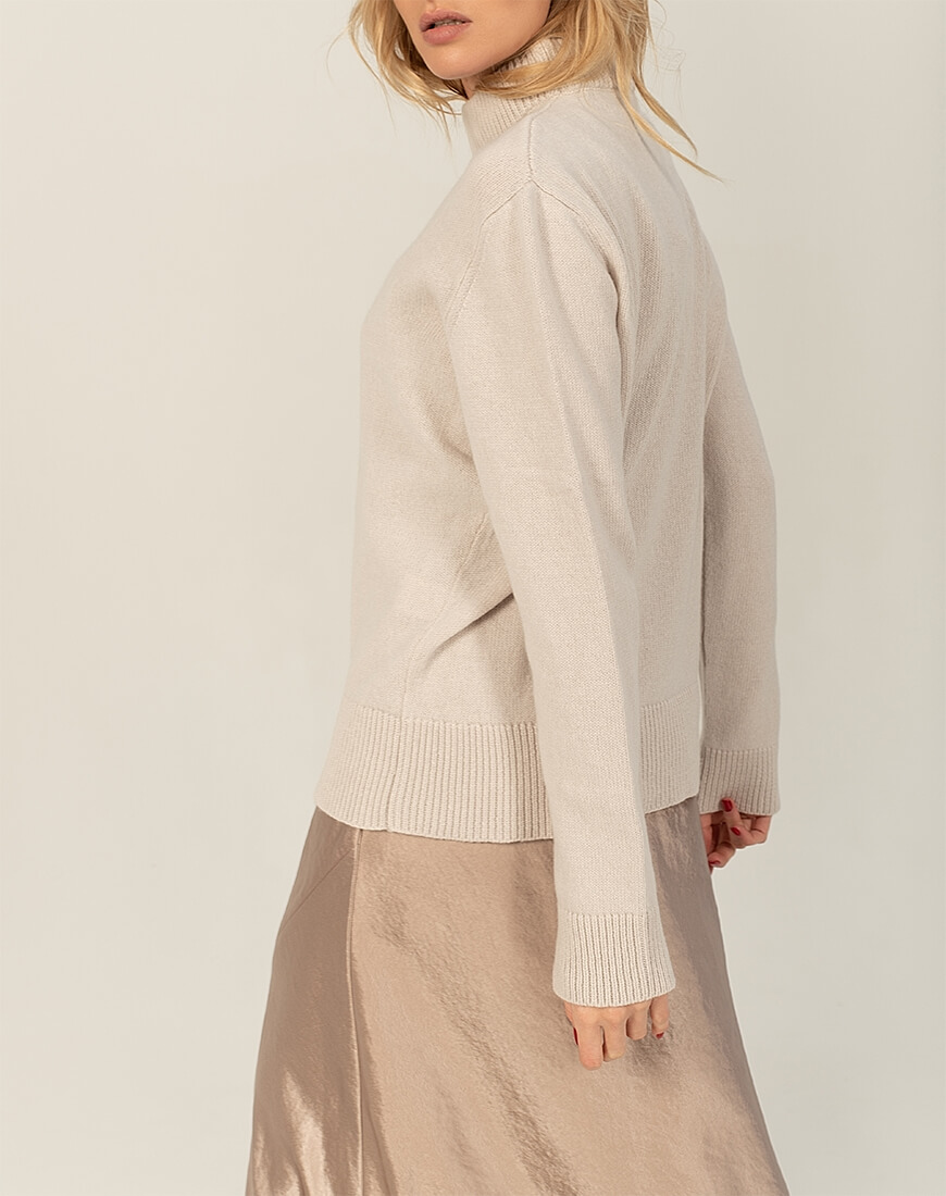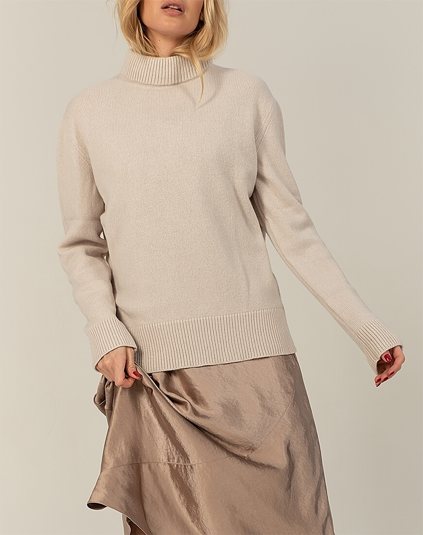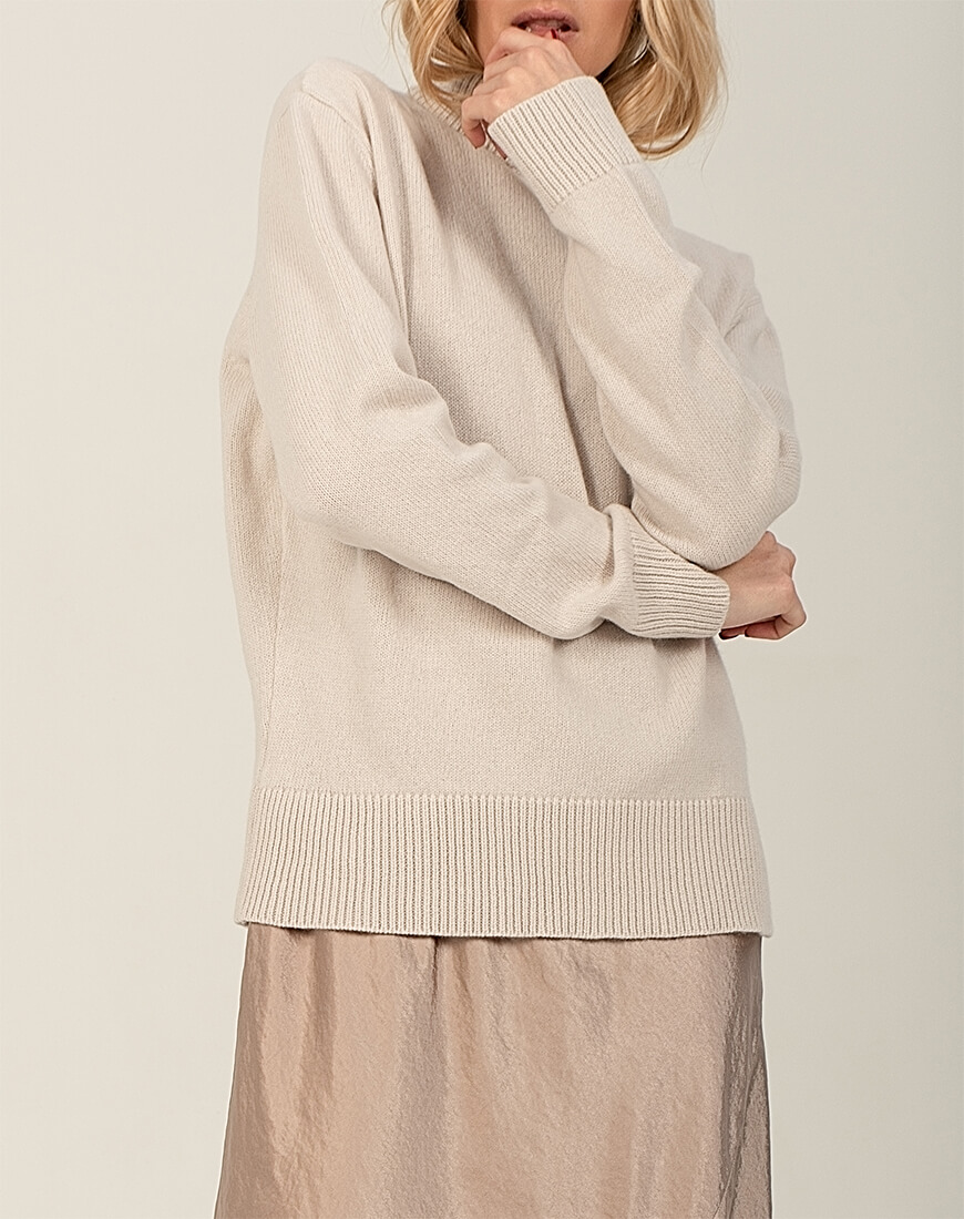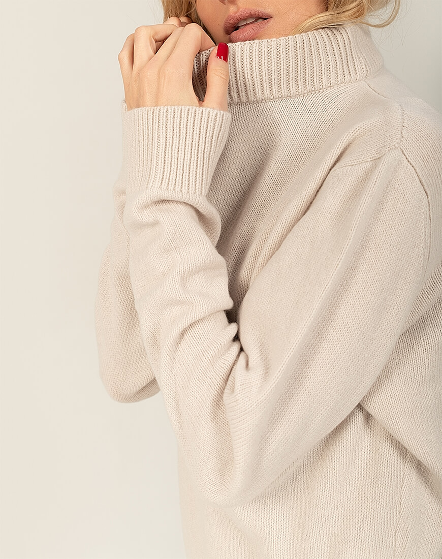 Інструкція з догляду: рекомендується суха хімчистка виробу; допустиме ручне прання в прохолодній воді зі спеціальними засобами для прання кашеміру, зверніть увагу, що під час прання “ковтуни” (якщо вони з’являться) розчиняться у воді; не допускається викручування, лише дбайливе віджимання в махровому рушнику; сушіння винятково в горизонтальному положенні; випрямляння (відпарювання) в горизонтальному положенні. Рекомендуємо зберігати вироби з кашеміру в складеному вигляді на поличці, не на плічках.