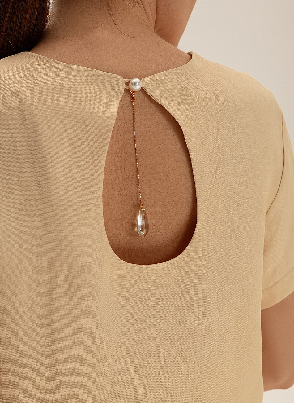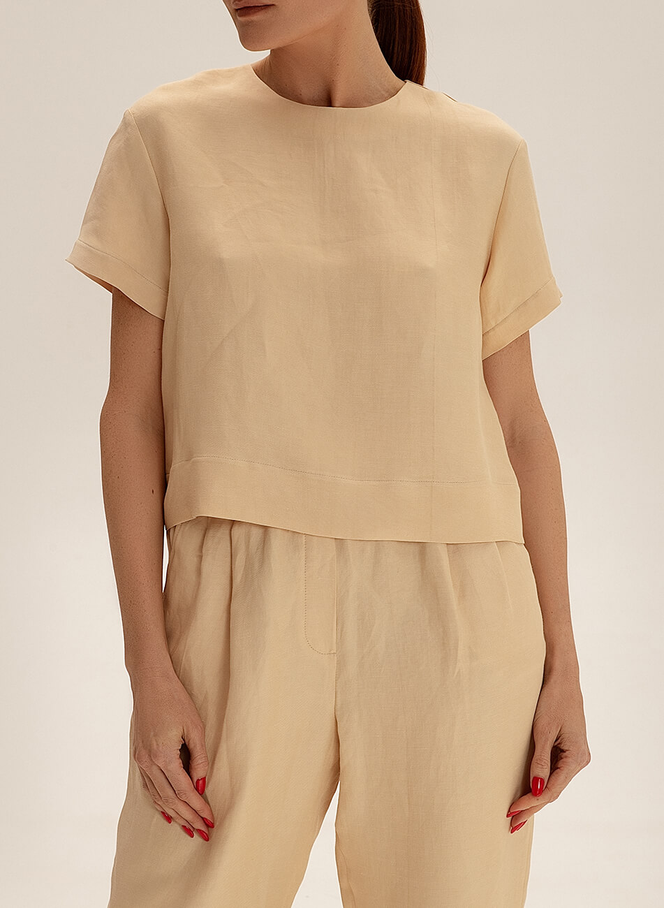 Лляний топ вільного крою з краплеподібним вирізом на спині. Лінія плеча спущена. Топ комплектується з піджаком, штанами і спідницею з колекції SS21.