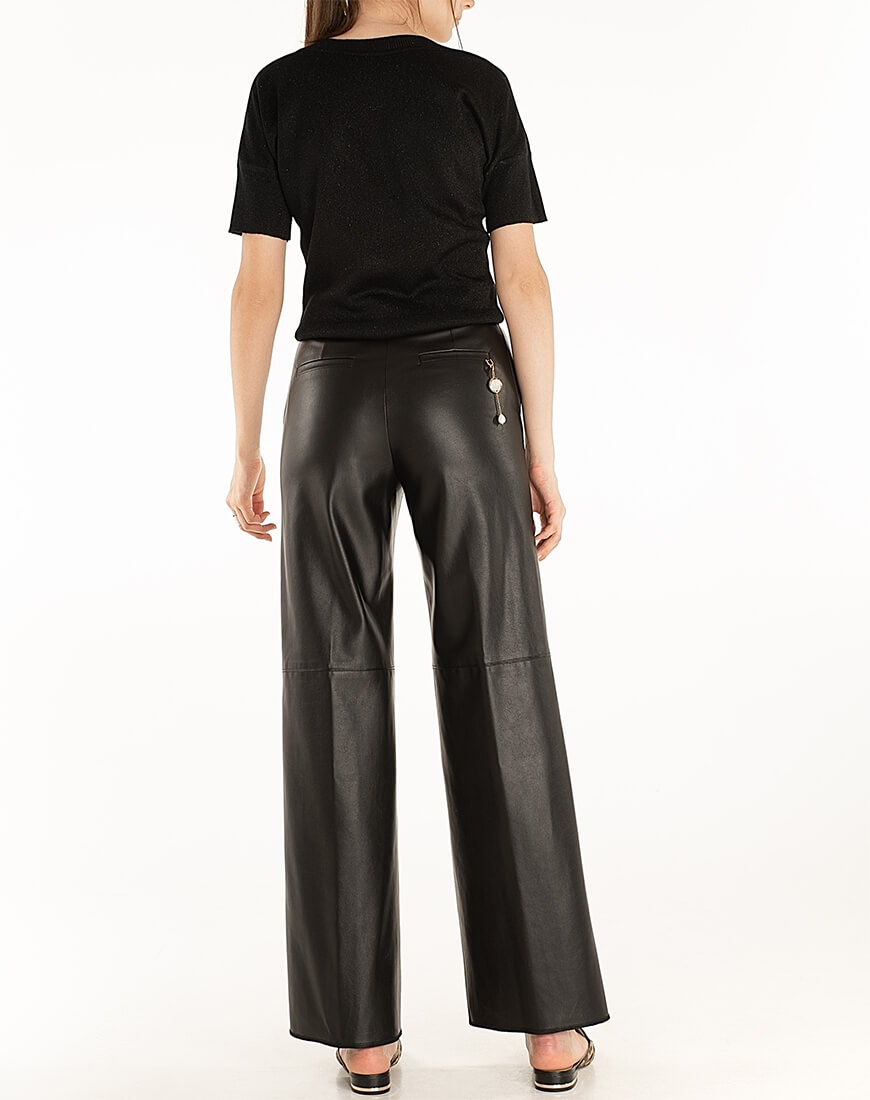 Широкі штани з еко-шкіри. У комплекті зі штанами – пояс. Знімний декор з натуральних перлів не входить до комплекту. Еко-шкіра для виробництва штанів була протестована і показала високі показники зносостійкості та стійкості до впливу зовнішнього середовища. Гарантія на матеріал: до 5 років.