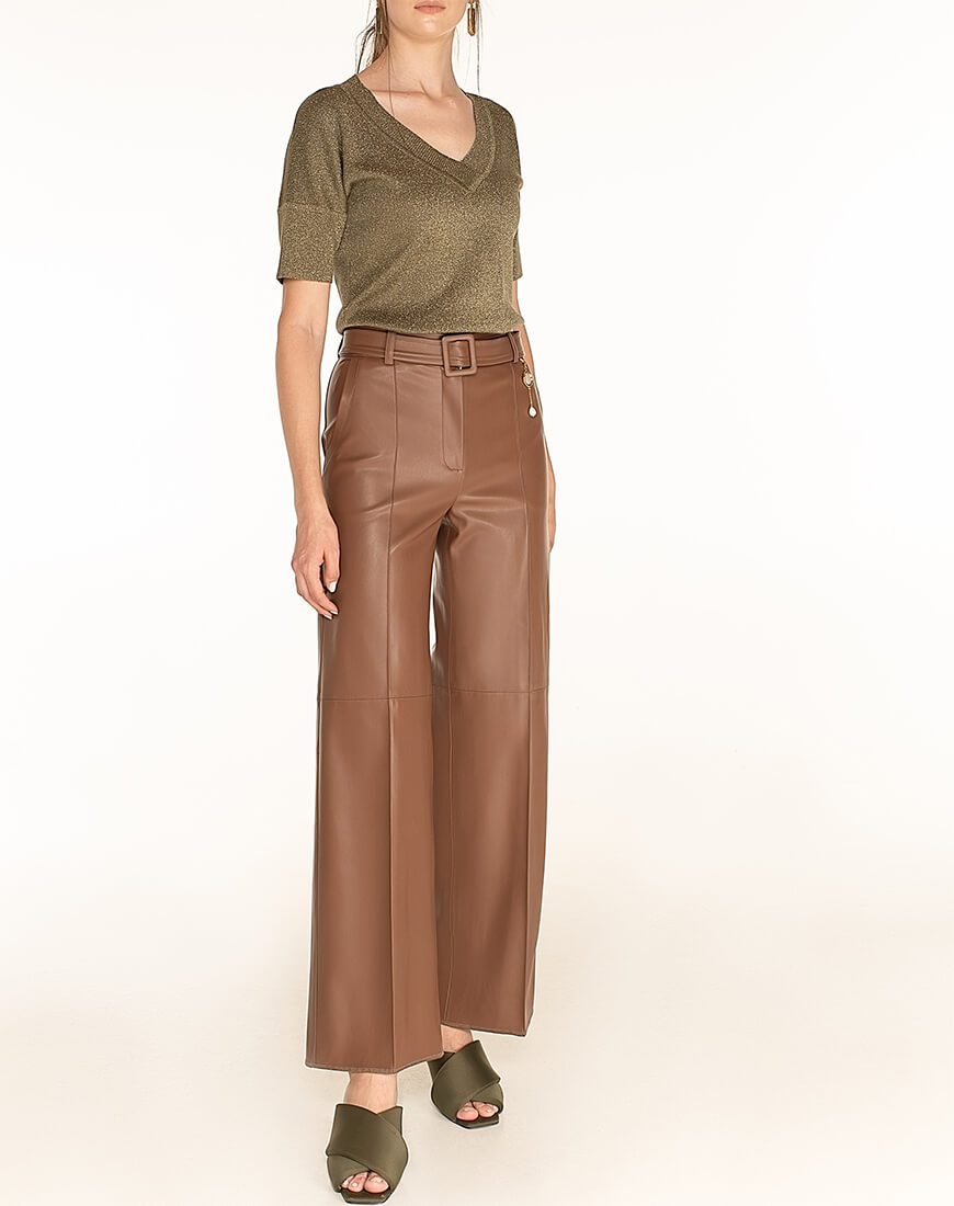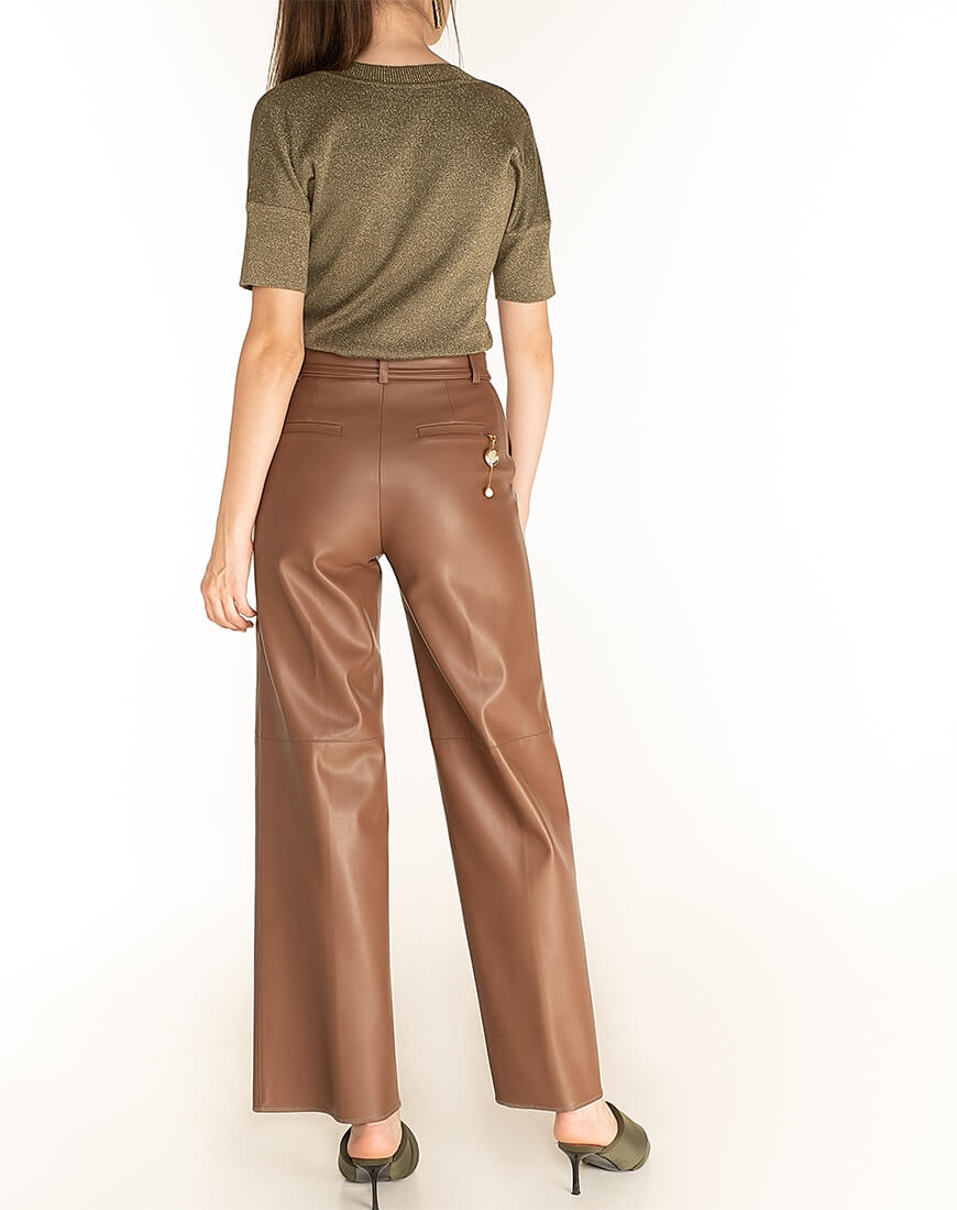 Широкі штани з еко-шкіри. У комплекті зі штанами – пояс. Знімний декор з натуральних перлів не входить до комплекту. Еко-шкіра для виробництва штанів була протестована і показала високі показники зносостійкості та стійкості до впливу зовнішнього середовища. Гарантія на матеріал: до 5 років.