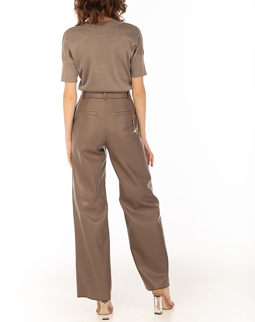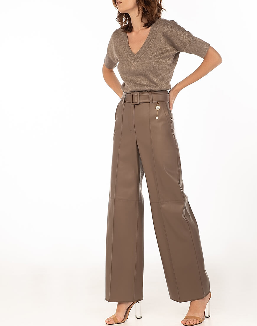 Широкі штани з еко-шкіри. У комплекті зі штанами – пояс. Знімний декор з натуральних перлів не входить до комплекту. Еко-шкіра для виробництва штанів була протестована і показала високі показники зносостійкості та стійкості до впливу зовнішнього середовища. Гарантія на матеріал: до 5 років.