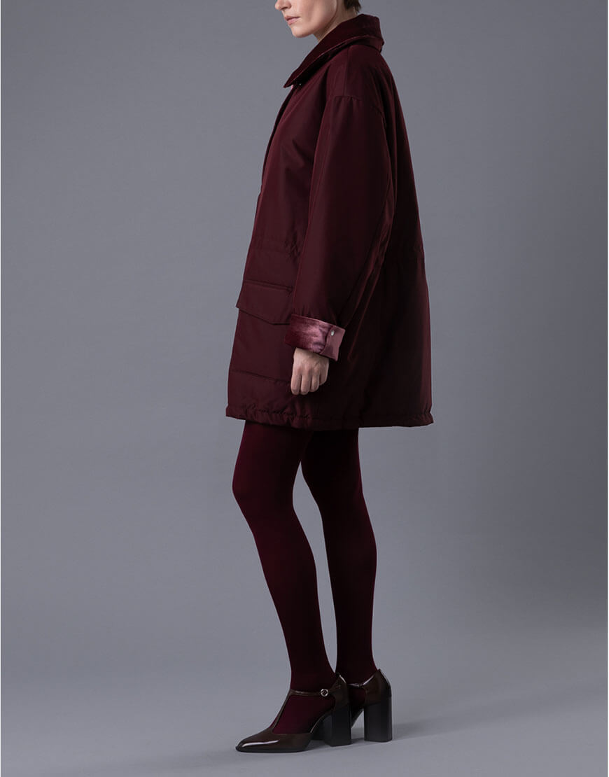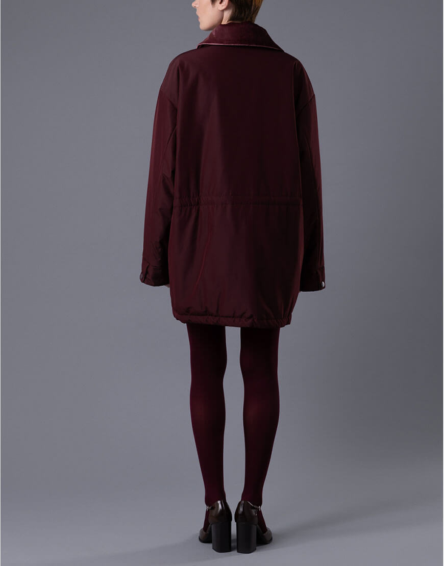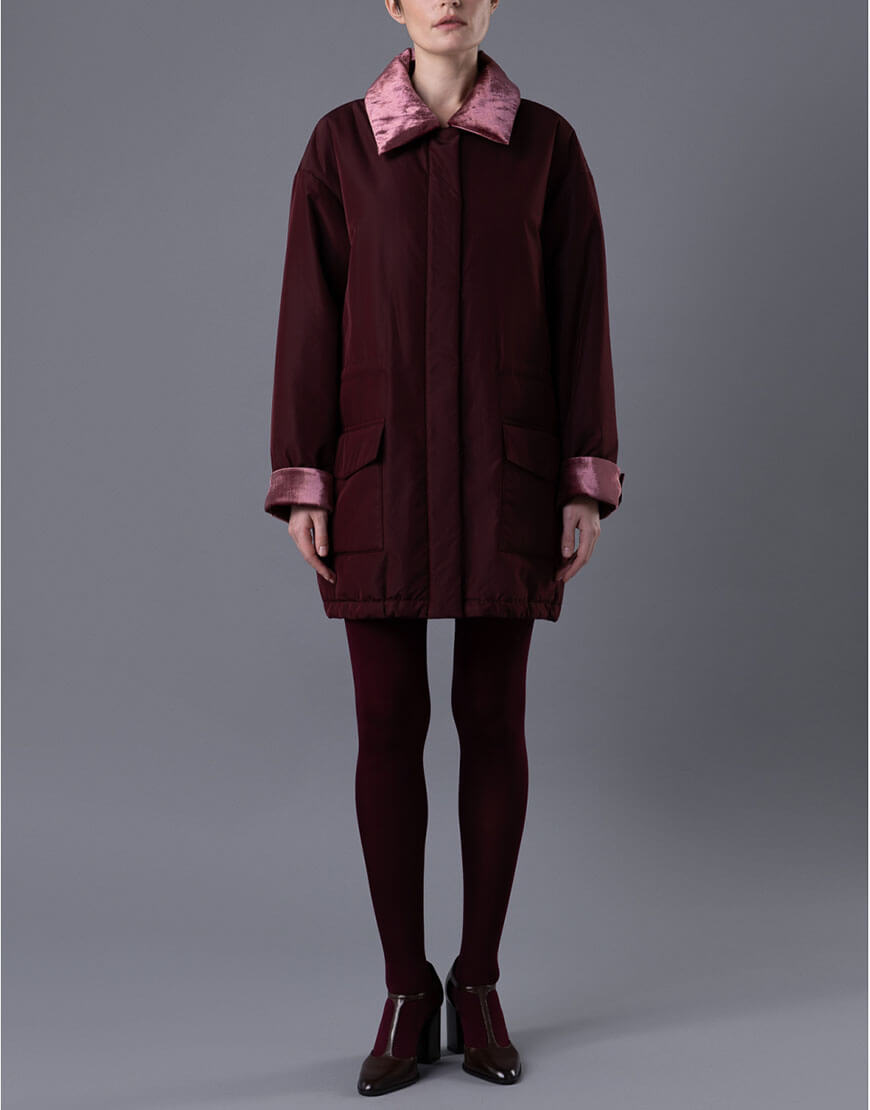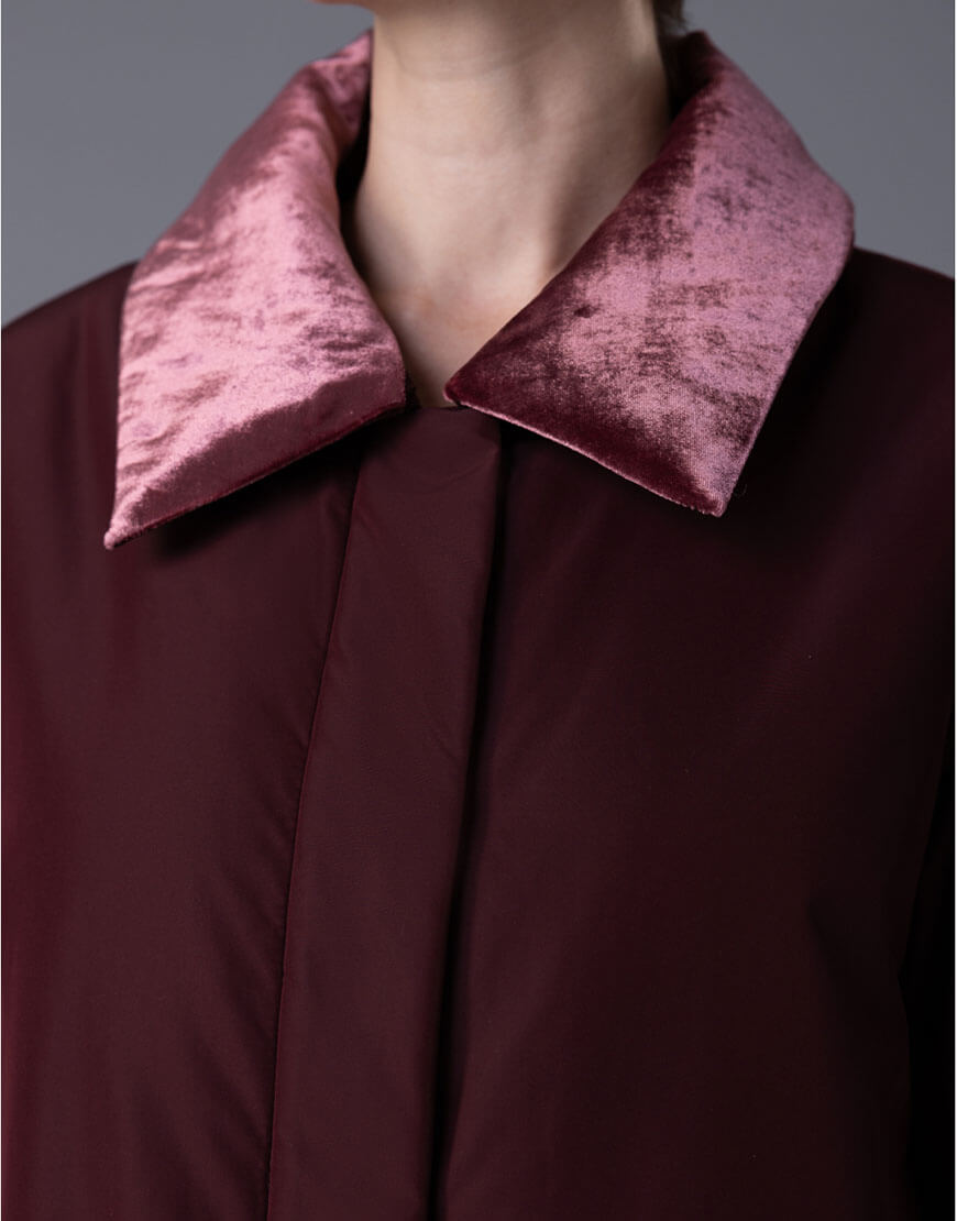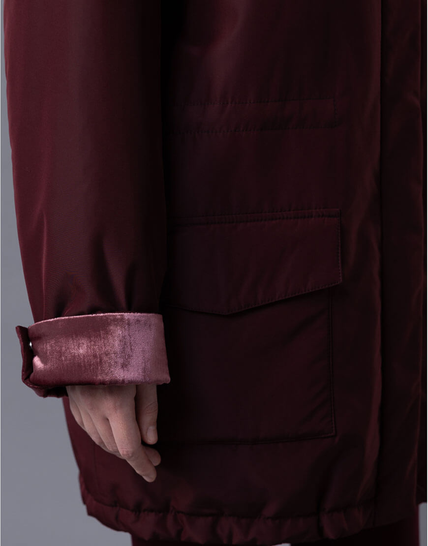 Куртка прямого крою з кишенями. Комірець куртки оздоблений оксамитом, який можна знімати. Внутрішня сторона манжета рукава також оздоблена оксамитом. З одного боку це додасть додаткове приємне тепло, коли куртка буде торкатися шкіри, з іншого боку – манжет можна підкотити.