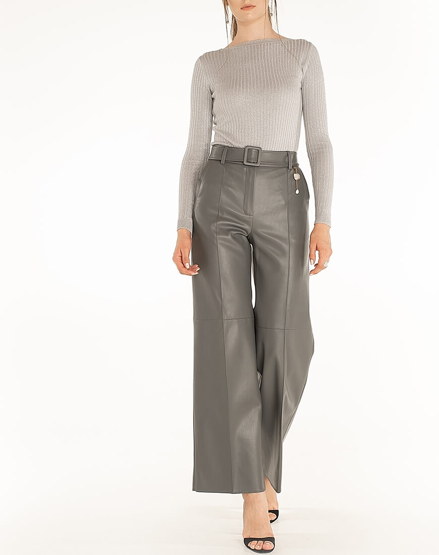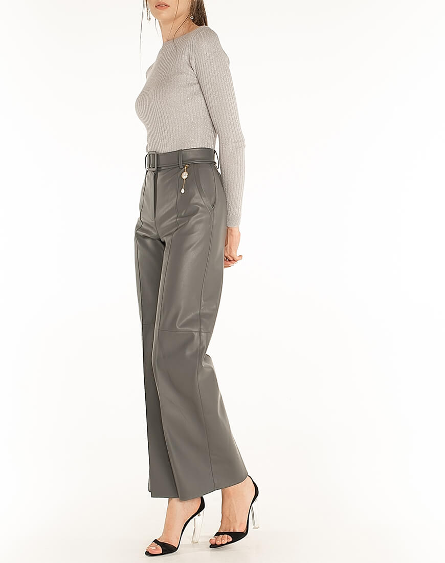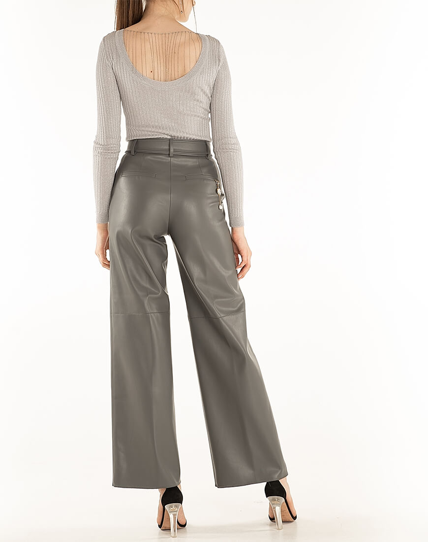 Широкі штани з еко-шкіри. У комплекті зі штанами – пояс. Знімний декор з натуральних перлів не входить до комплекту. Еко-шкіра для виробництва штанів була протестована і показала високі показники зносостійкості та стійкості до впливу зовнішнього середовища. Гарантія на матеріал: до 5 років.