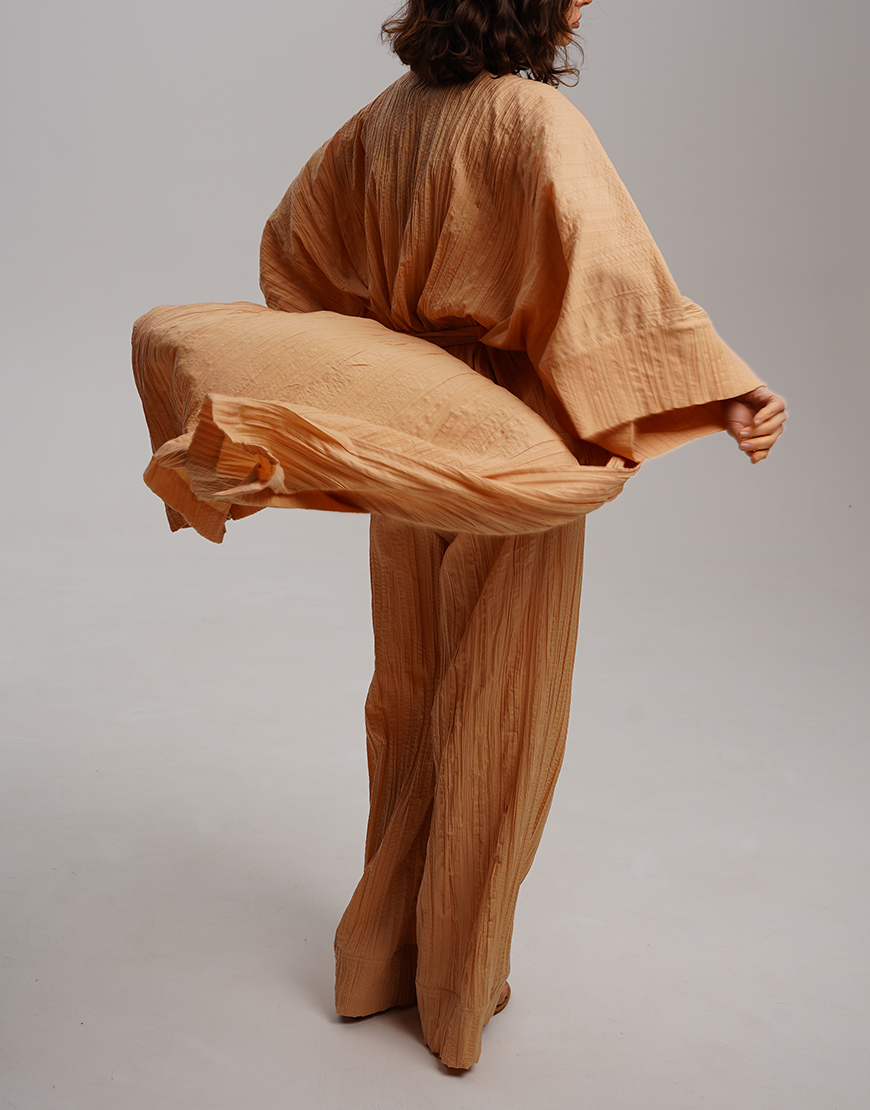 Жаті персикові штани з фактурної бавовни