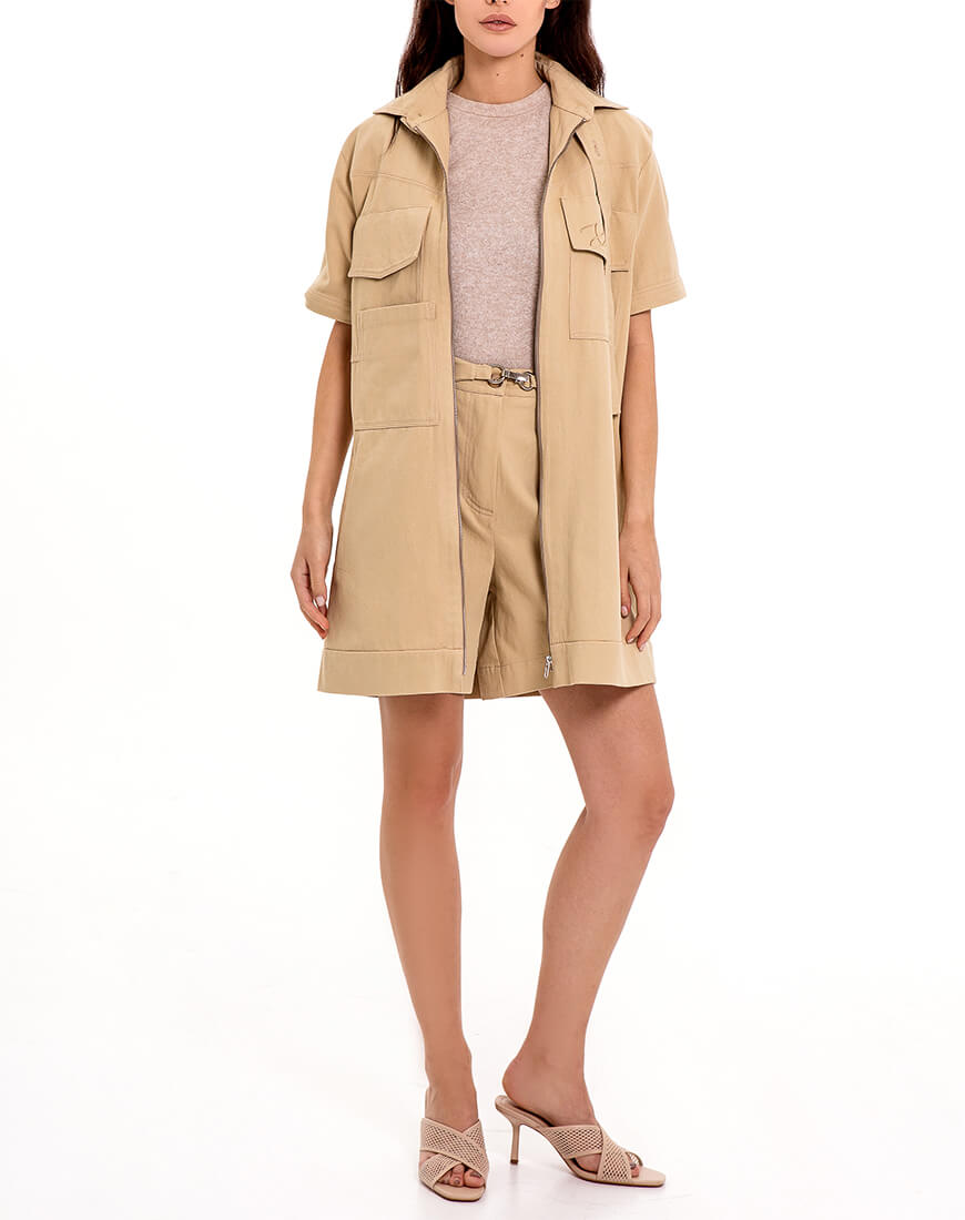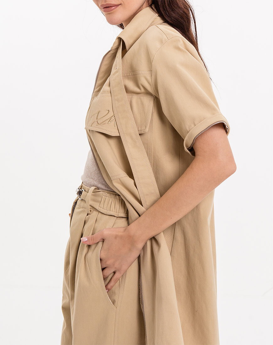 Доставка впродовж 2-5 робочих днівЗверніть увагу, що розмір L-XL доступний тільки для індивідуального пошиття за вашими параметрами. Бавовняна сорочка-сукня трансформер зі знімними рукавами. Застібається на блискавку, на рукавах також дві блискавки, і сорочка перетворюється на подовжений весняно-літній жилет або ж сукню-сорочку. Є пояс-резинка додатково з металевим карабіном. На грудях два накладних кармани, нижче ще один маленький. Чудово поєднується з такими ж брюками або шортами з цієї колекції, формуючи додатково костюм кежуал з двох одиниць у гардеробі.