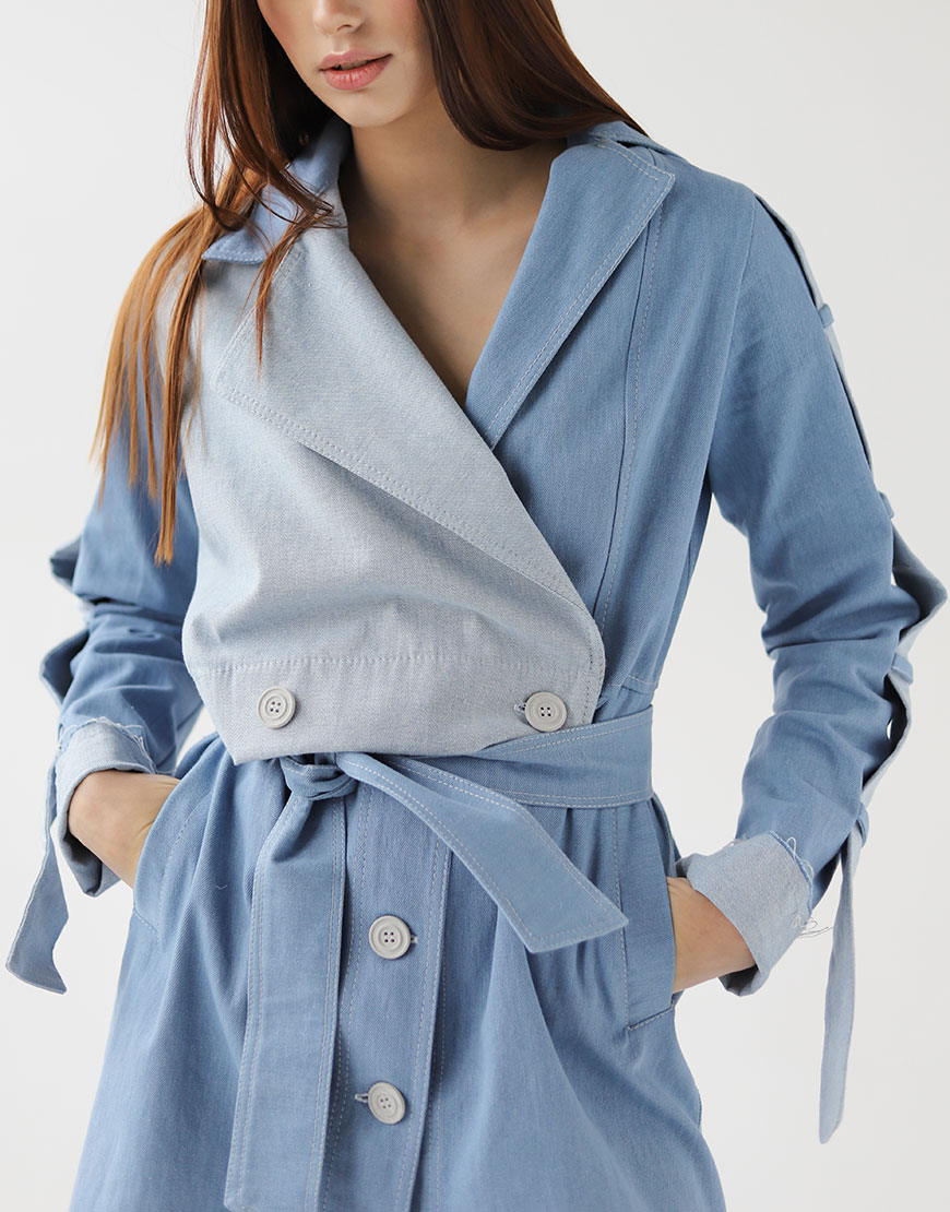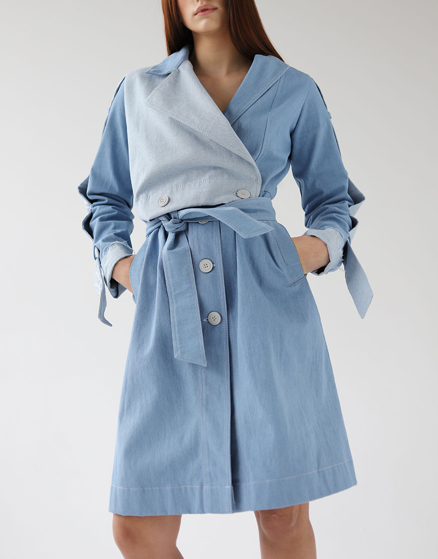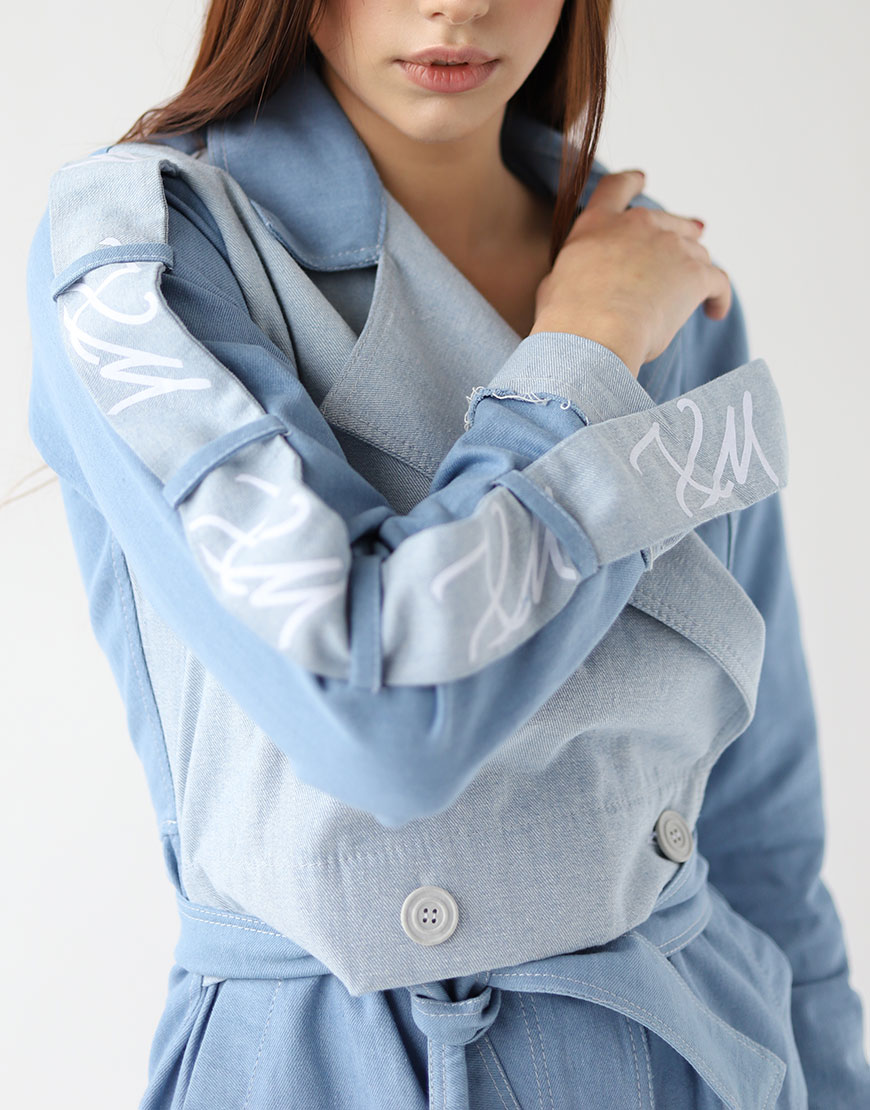 Джинсовий тренч оригінального крою з безліччю декоративних елементів. Рукава декоровані печаткою з логотипом. Тренч на ґудзиках. Джинс середньої щільності, не тягнеться. Тренч можна носити як верхній одяг, так і застебнути повністю як сукню. Є поясок на талії.