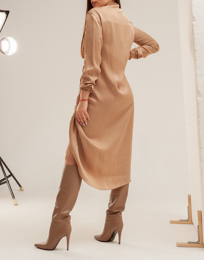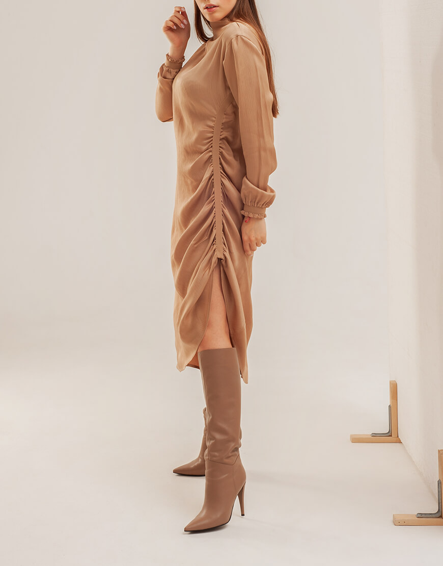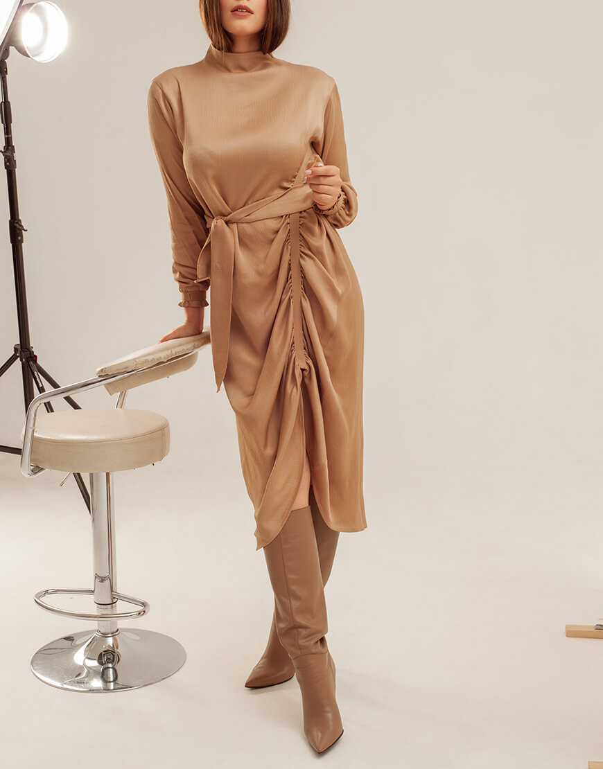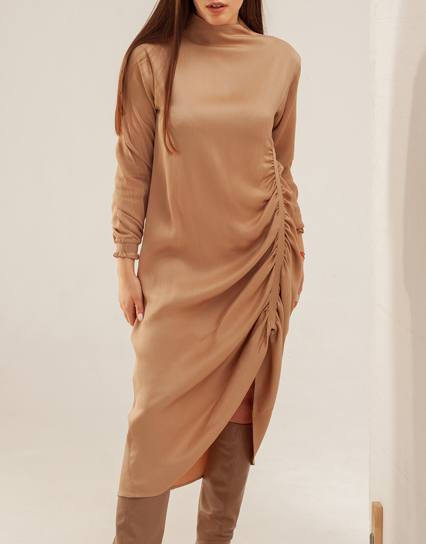 Сукня довжини міді з фактурної віскози вільного силуету.Одна частина сукні стягнута гумкою. На шиї збоку потайна блискавка. Можна носити з поясом, можна без.