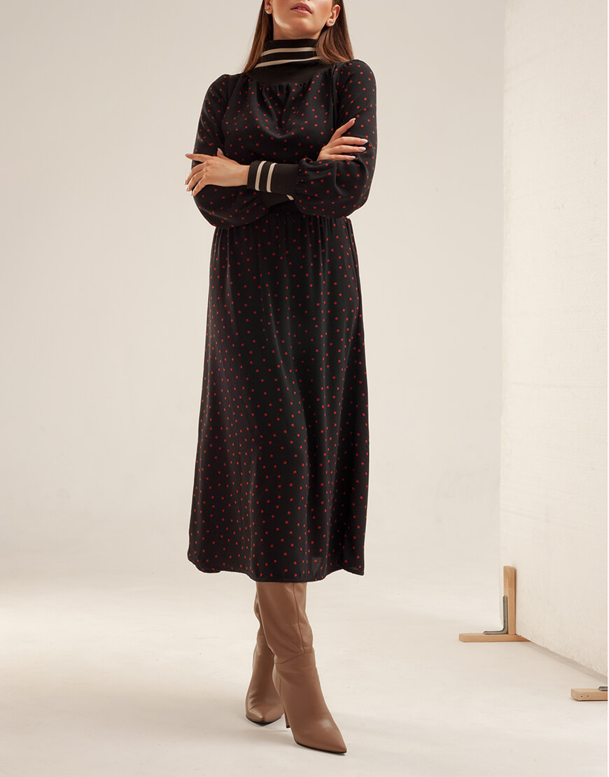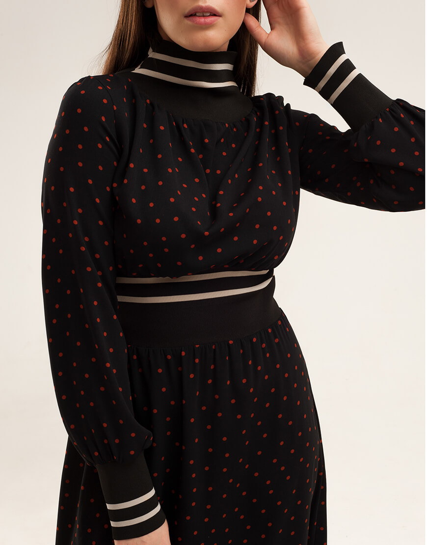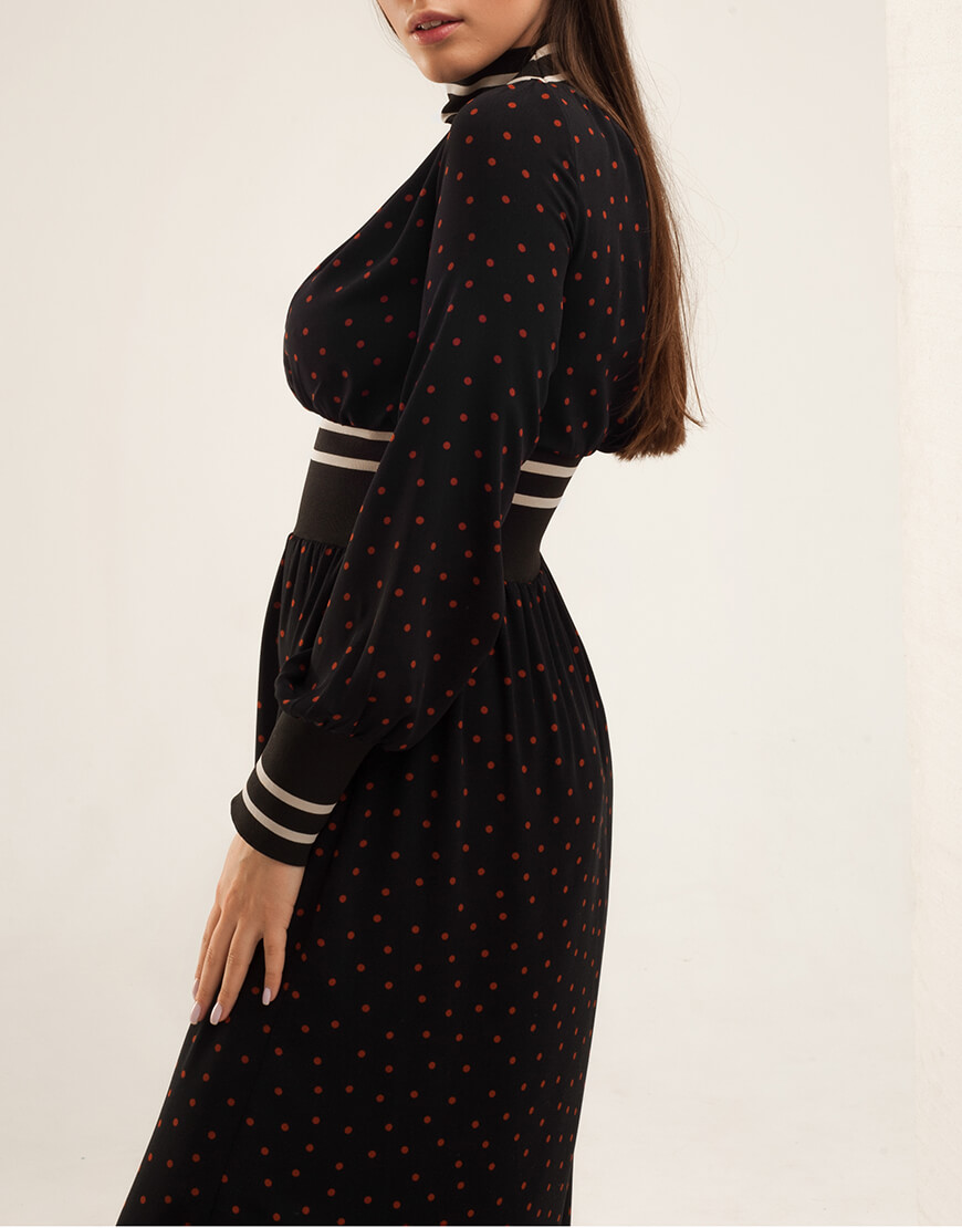 Сукня довжини міді в горох. На грудях збірка що візуально збільшує груди.На шиї, рукавах і талії рибана в смужку.