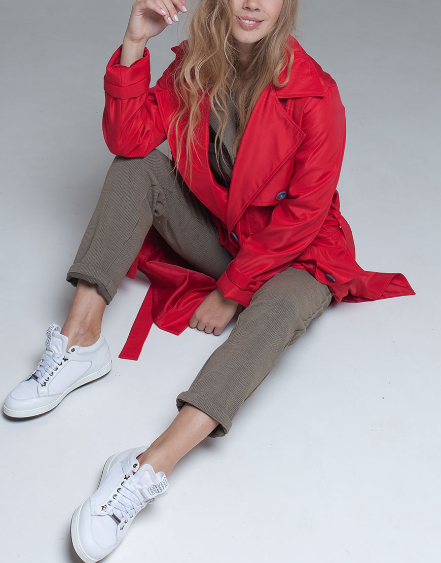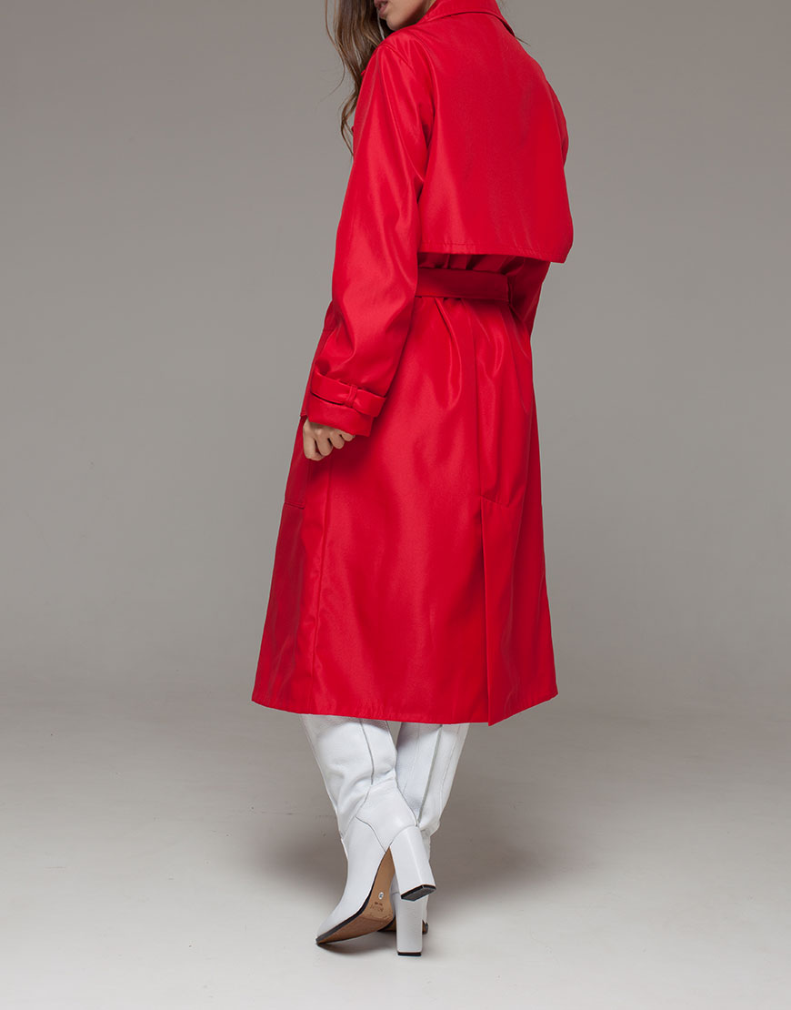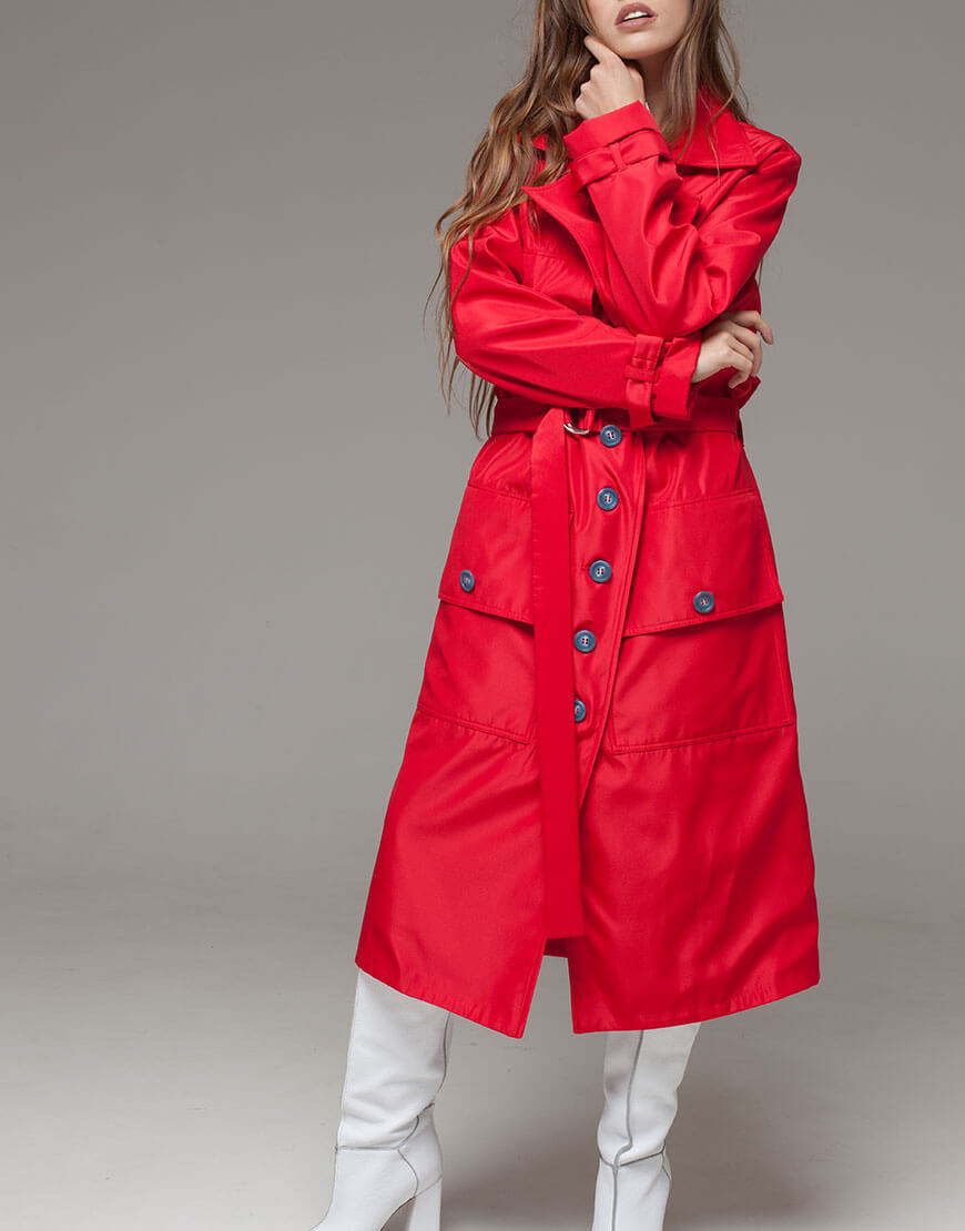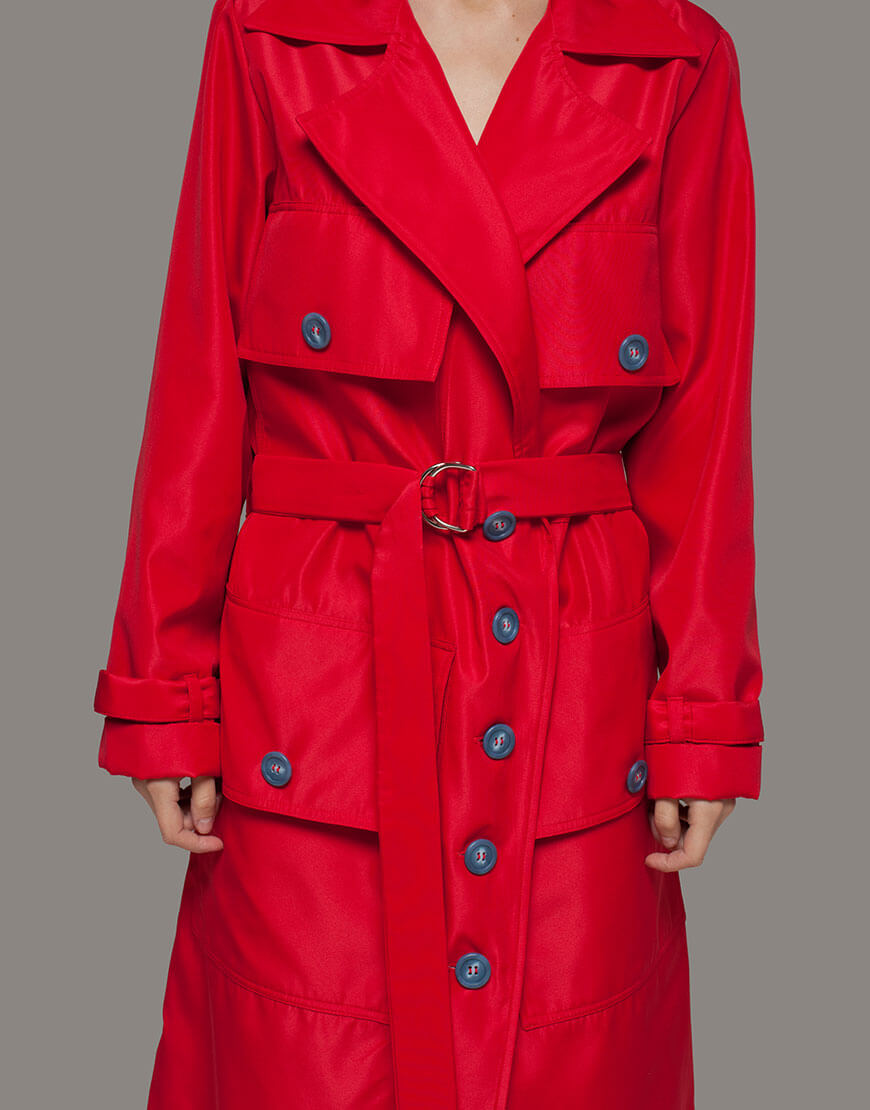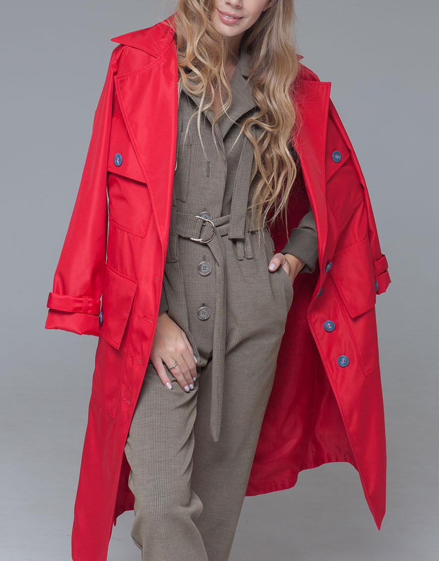 2 200 грнПлащ прямого крою з накладними великими кишенями з клапаном, під пояс. На спині кокетка і знизу шліца. Плащ на віскозній підкладці. Колір червоний, ґудзики сині.