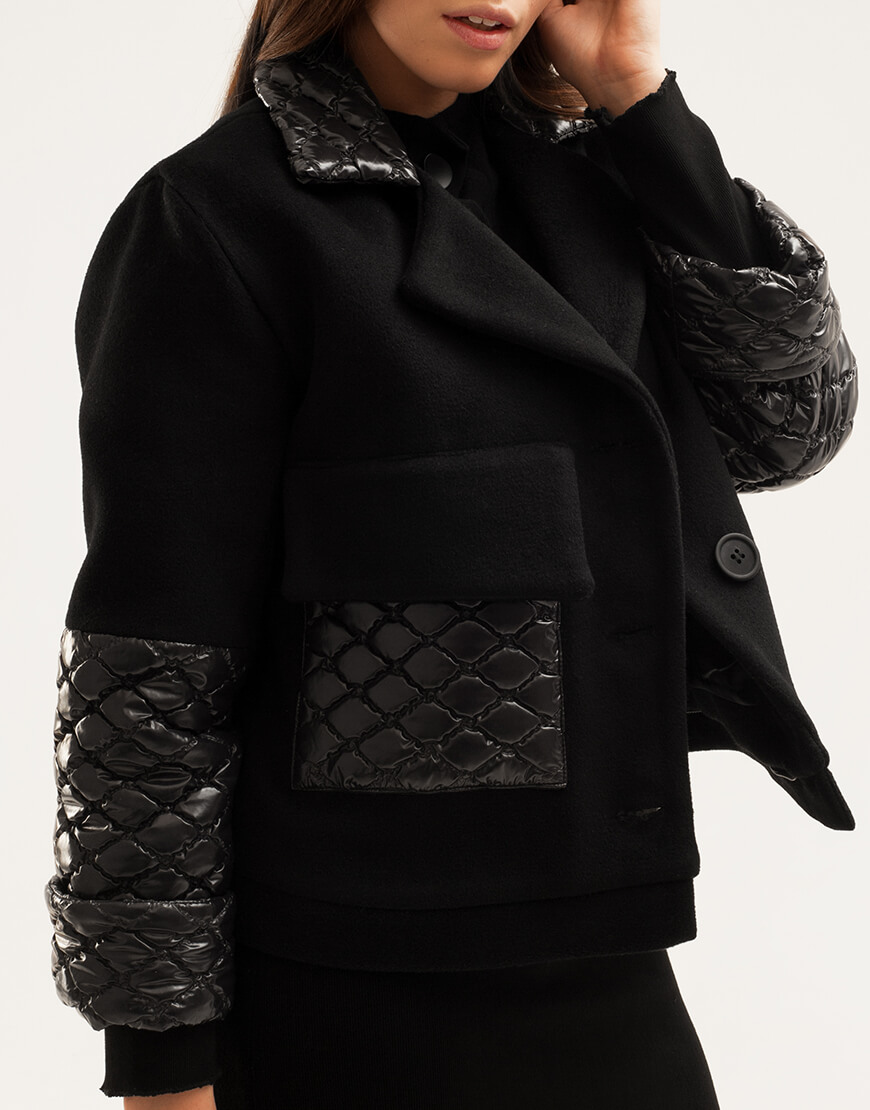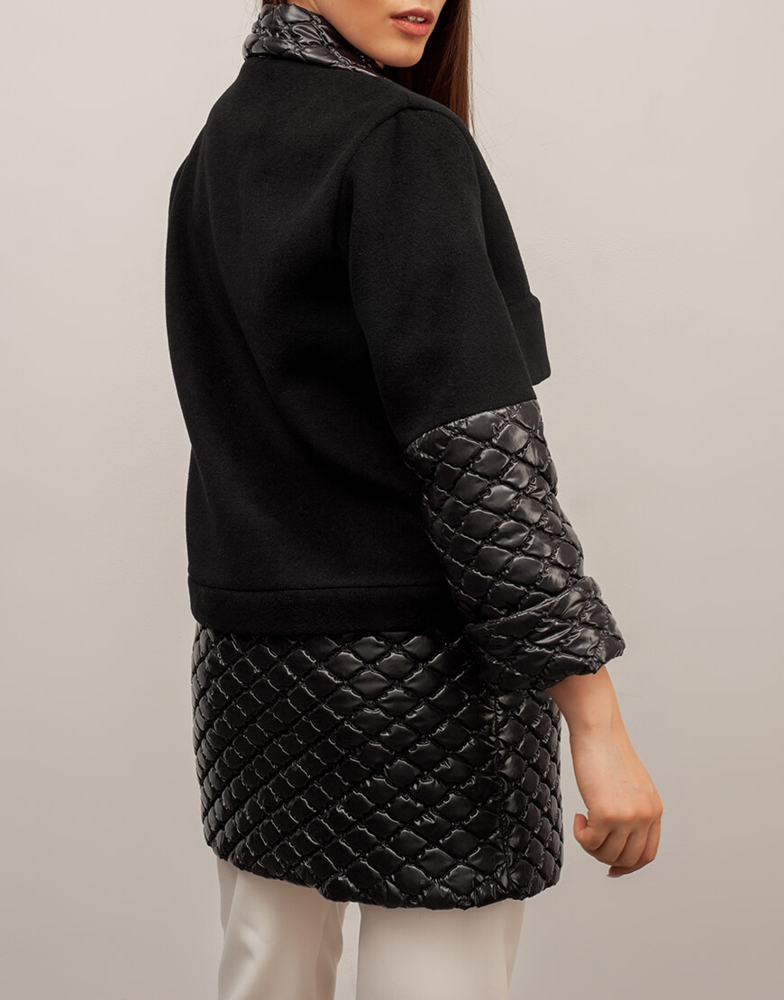Пальто прямого крою з підкладкою з віскози і декоративними елементами на рукавах. Низ зі стьобаної плащової тканини пристібається на блискавці по колу. Накладні кишені.