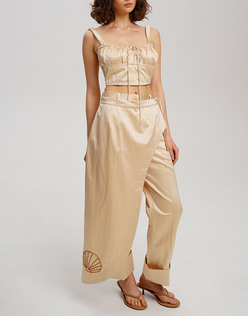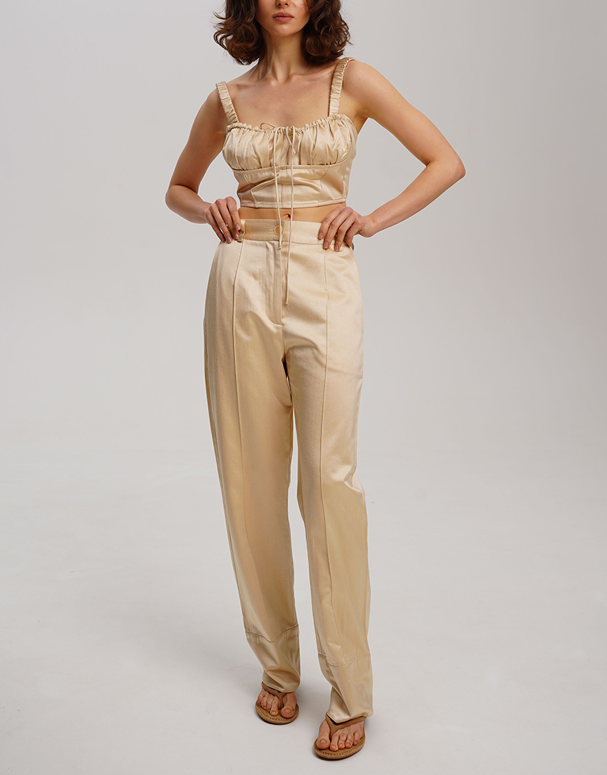 Штани золоті прямого крою з манжетом та стрічкою спереду