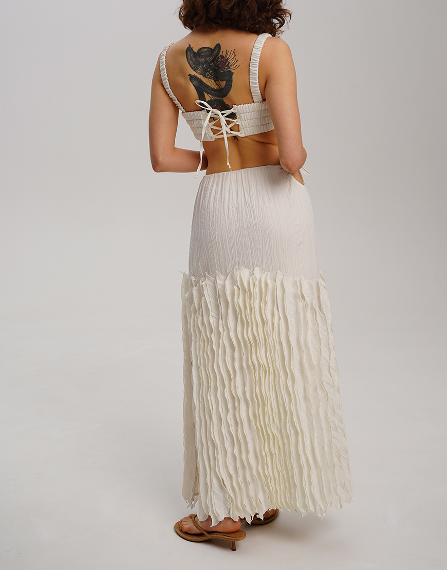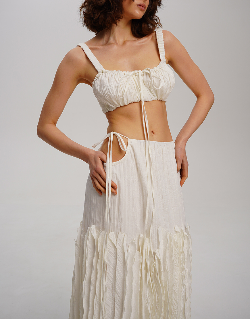 Код товару: 430191Біла фактурна максі спідниця на зав’язках з декором