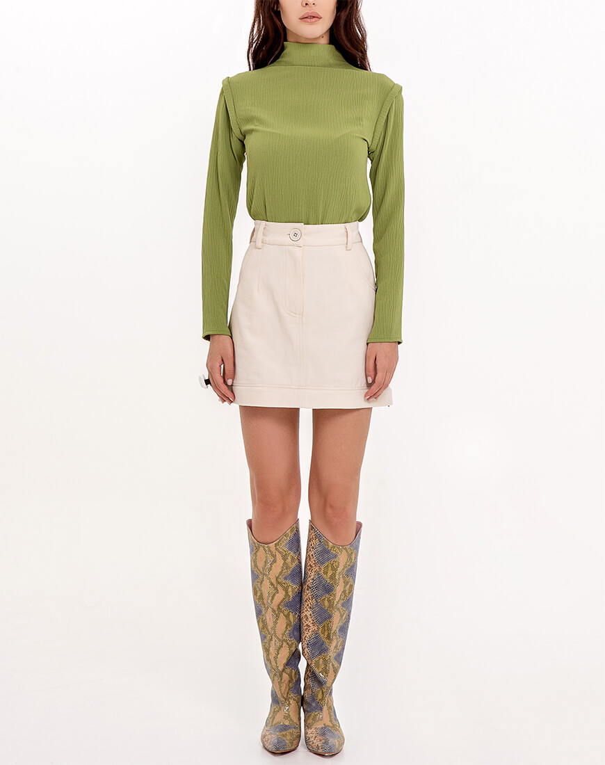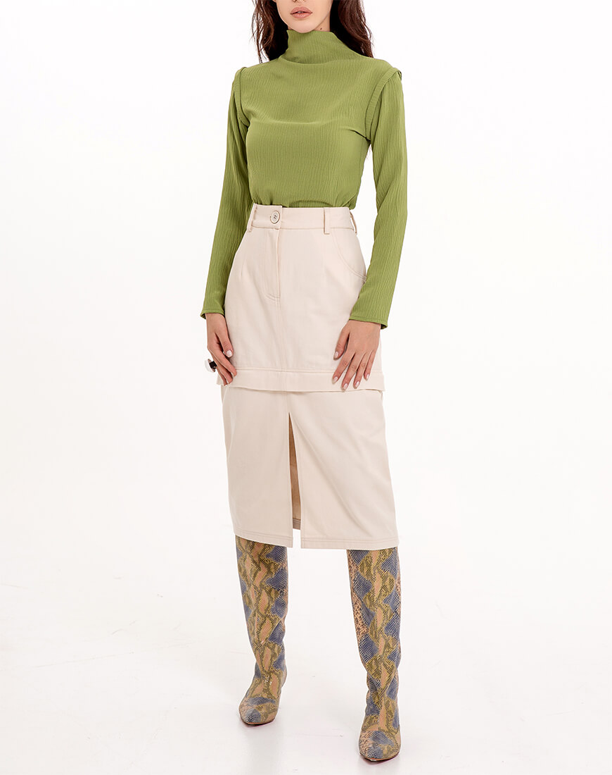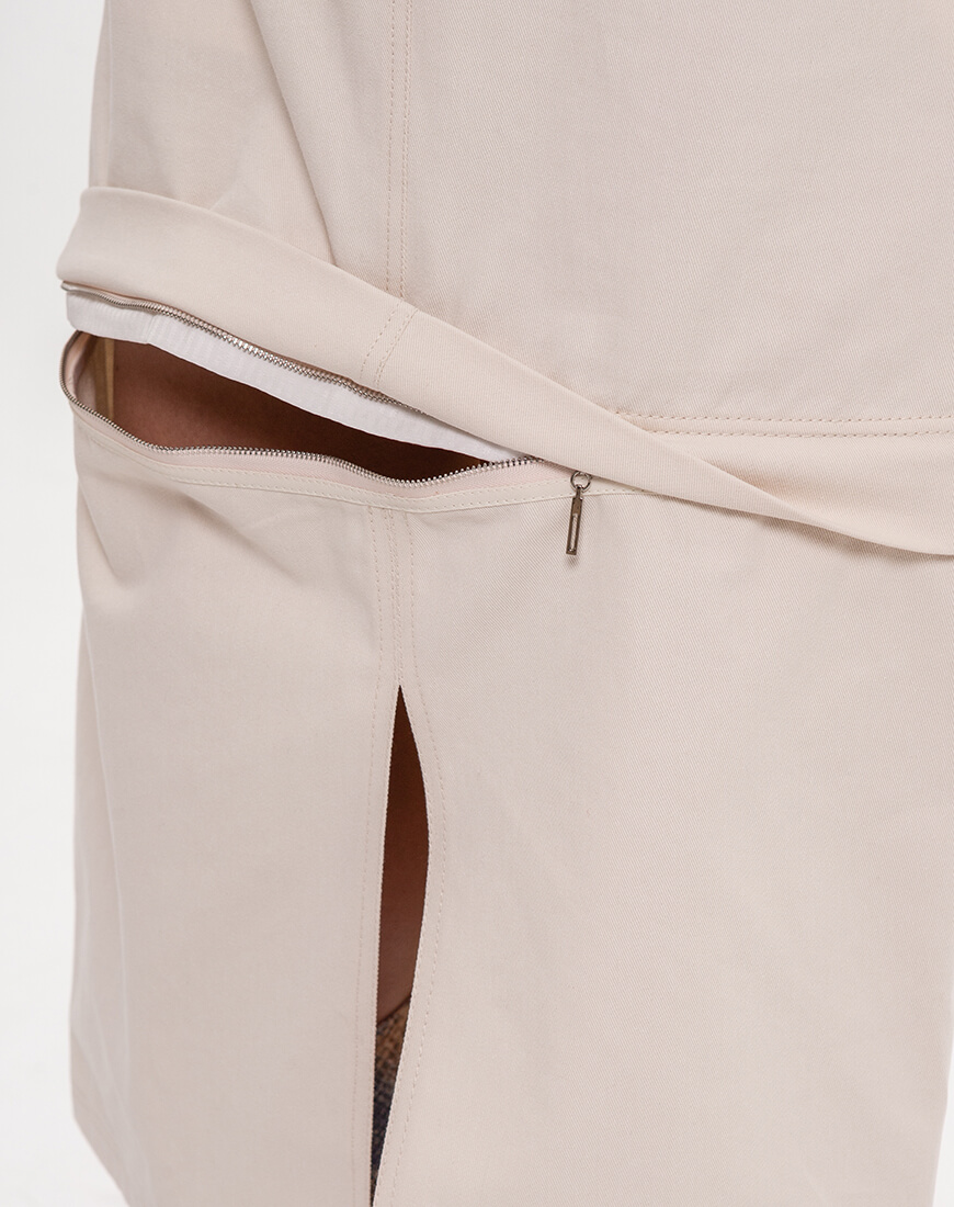 Коттонова спідниця – трансформер має блискавку на рівні міні-спідниці і за допомогою неї міді спідниця перетворюється на міні-спідницю. Є шлевки для пояса. Спереду є дві кишені і ззаду є дві кишені. Коли спідниця в повній довжині у неї спереду є ще розріз по центру. Чудово поєднується з жакетом з такої ж тканини в цій колекції. З міні-спідницею як костюм двійка.