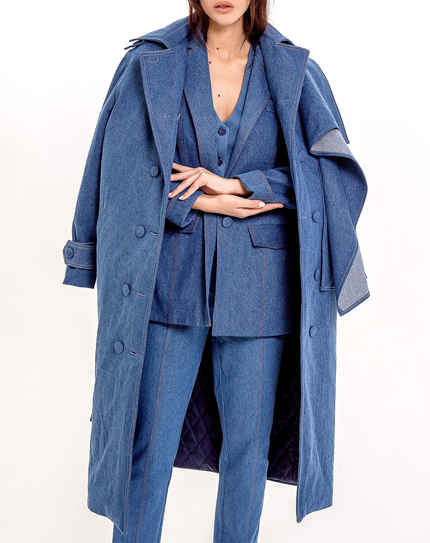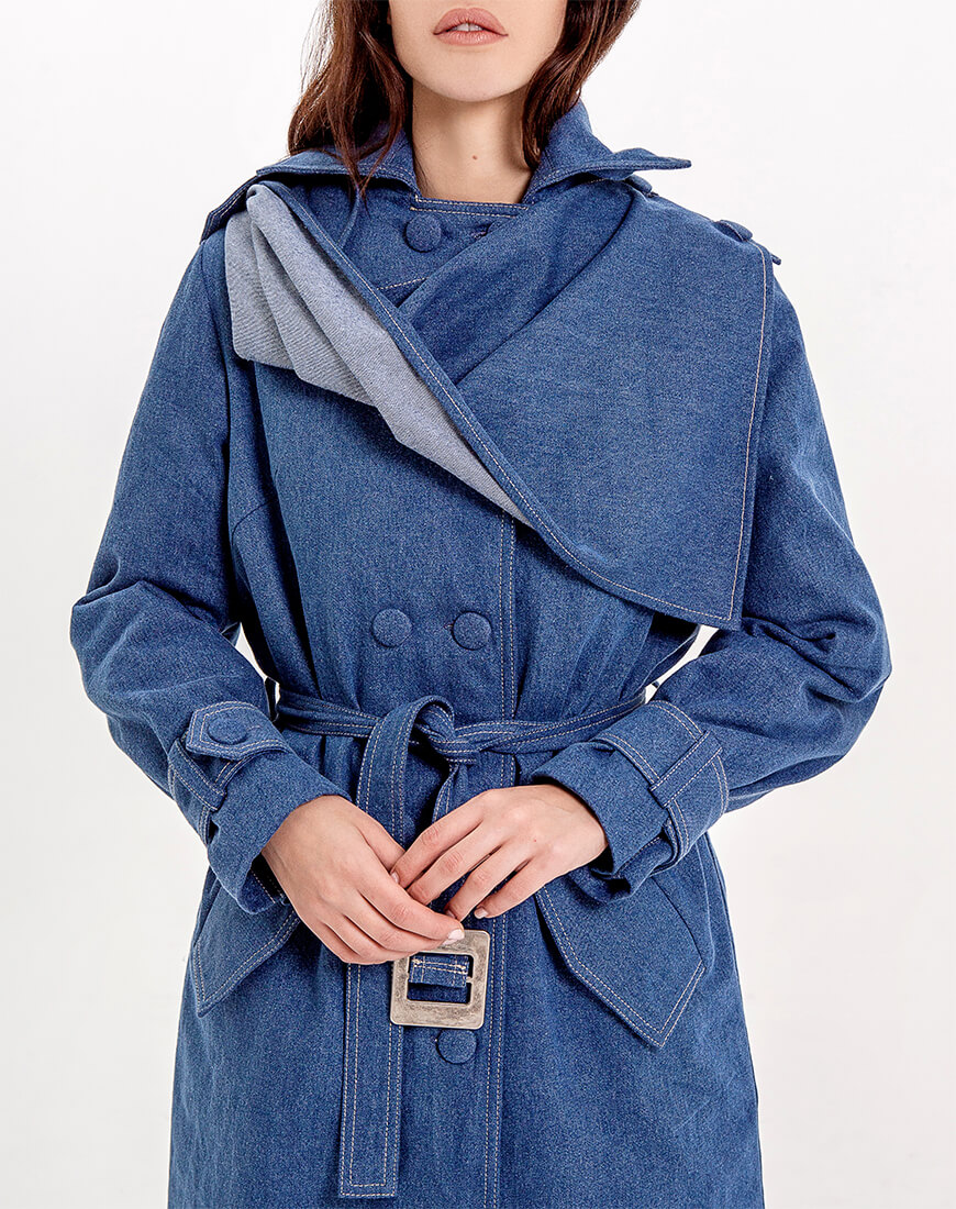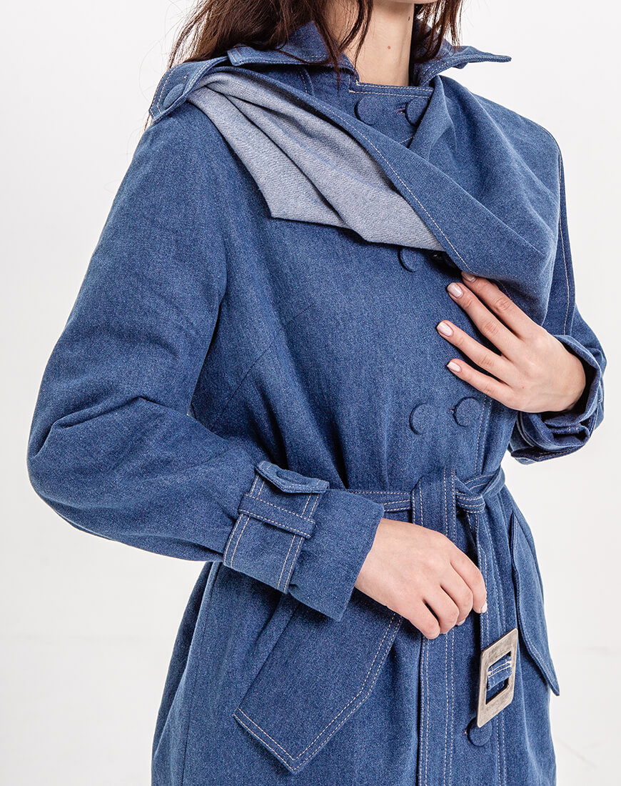 Джинсове двобортне пальто прямого крою на стьобаній утепленій підкладці з шерстипоном. Відкладний комір. На рукавах є пати на ґудзиках під розмір. На плечах є погони знімні на ґудзиках. З одного боку до цих гудзичків на погонах пристібається декоративна джинсова хустка, яку можна просто загнати в пояс по довжині або ж закрити себе як шарфом, простягнувши частину хустки в погон на іншому плечі. Вона знімна. Тому можна експериментувати з образами. По всій довжині ґудзики, ззаду висока шліца. Є пояс із пряжкою.