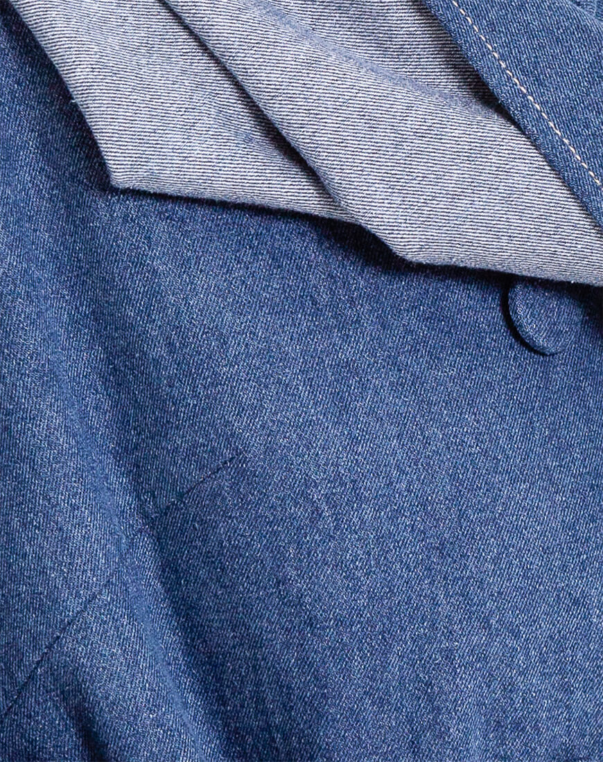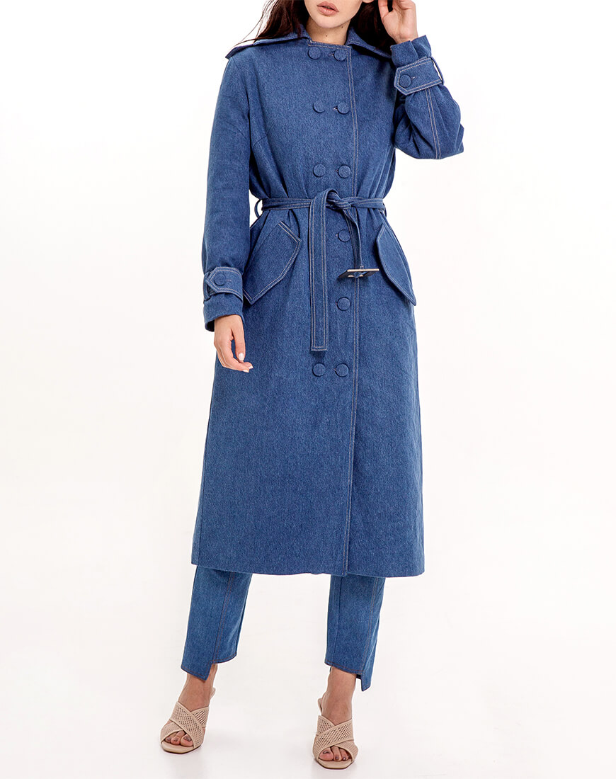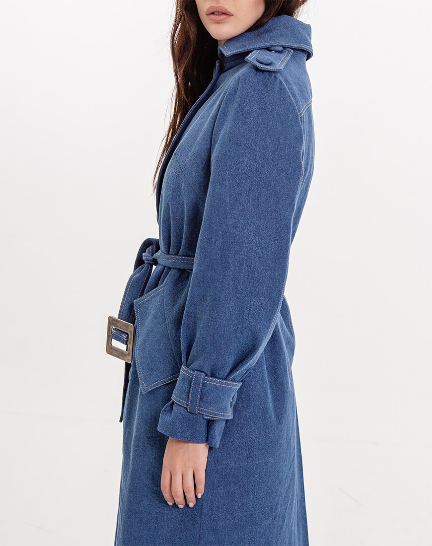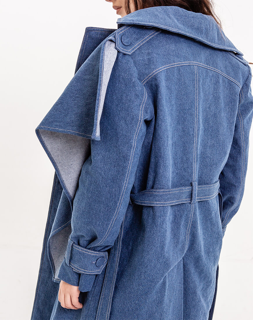 Джинсове двобортне пальто прямого крою на стьобаній утепленій підкладці з шерстипоном. Відкладний комір. На рукавах є пати на ґудзиках під розмір. На плечах є погони знімні на ґудзиках. З одного боку до цих гудзичків на погонах пристібається декоративна джинсова хустка, яку можна просто загнати в пояс по довжині або ж закрити себе як шарфом, простягнувши частину хустки в погон на іншому плечі. Вона знімна. Тому можна експериментувати з образами. По всій довжині ґудзики, ззаду висока шліца. Є пояс із пряжкою.