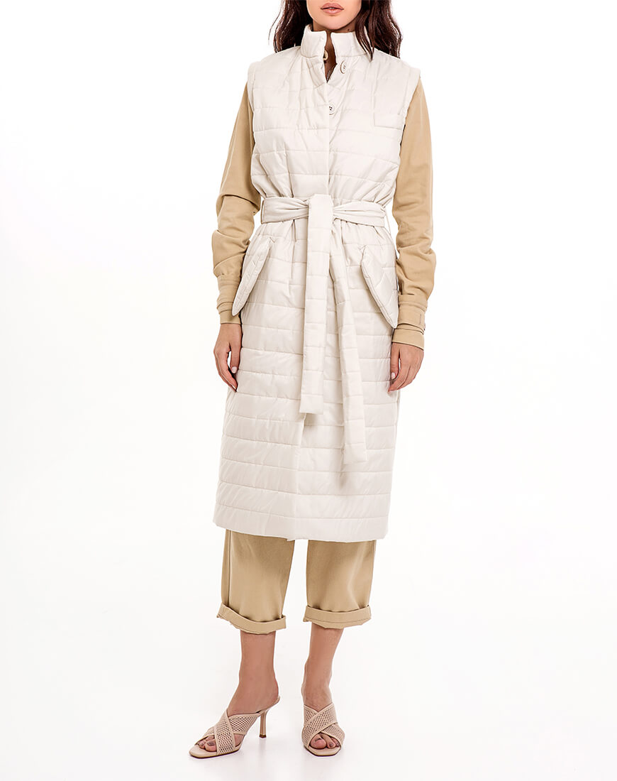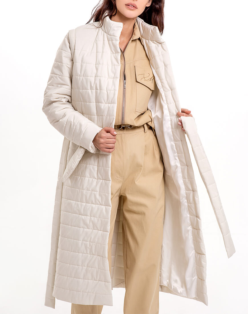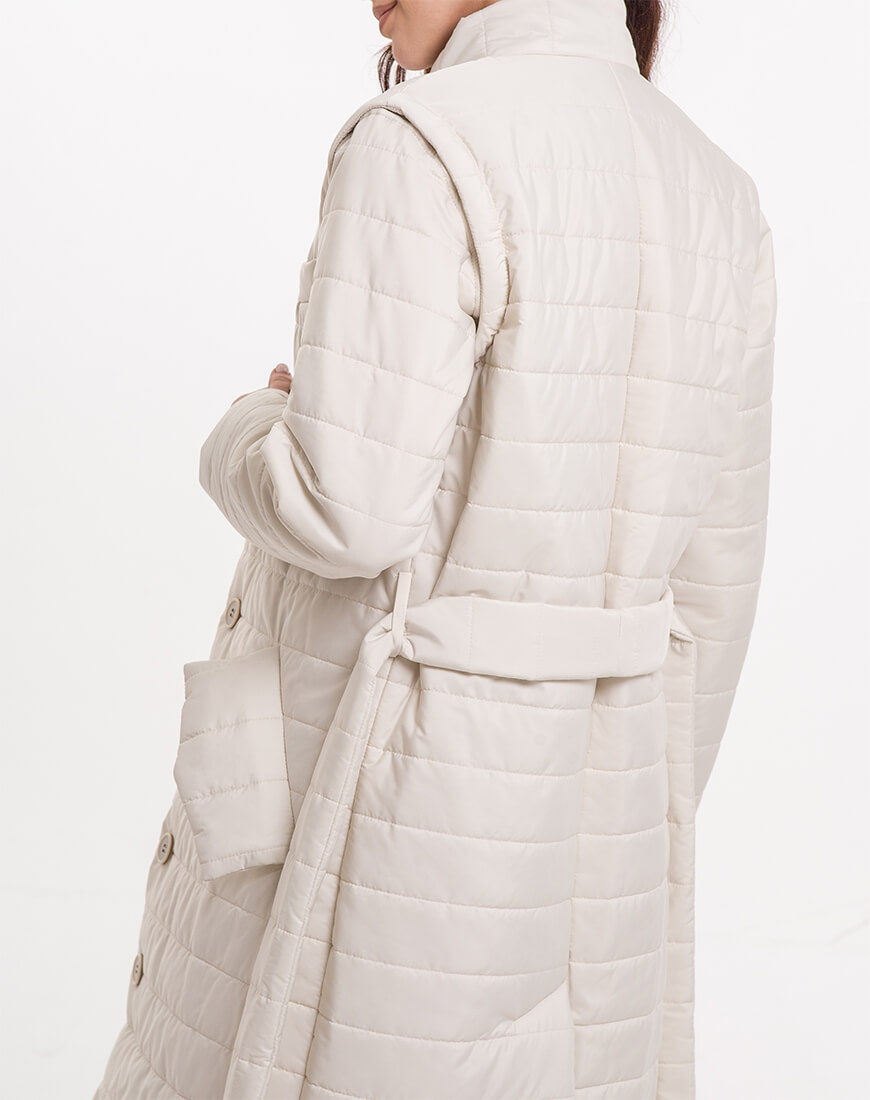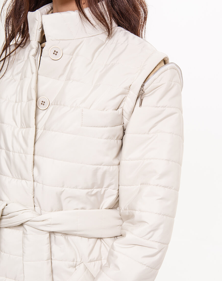 Зверніть увагу, що розмір XL доступний для індивідуального пошиття за вашими параметрами. Стьобане пальто-трансформер з курточної плащової тканини на синтепоні зі знімними рукавами. Рукава знімаються за рахунок блискавок. І пальто перетворюється на подовжений жилет. Дуже красиво навесні або теплою осінню під вовняні светри або на спортивні трикотажні костюми. Є дві кишені, прихована планка з гудзиками.Пояс. Є можливість відстебнувши рукава застосовувати цей жилет під базове біле, сіре, молочне або бежеве пальто як утеплювач додатковий на зиму, буде два в одному, що дуже зручно.