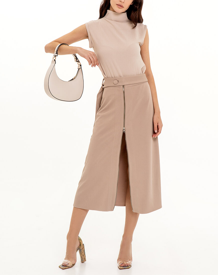 Зверніть увагу, що розмір L-XL доступний тільки для індивідуального пошиття за вашими параметрами. Спідниця міді з джерсі в рубчик на блискавці. На талії є поясок із ґудзиком. Блискавку можна розстебнути високо, зробивши таким чином високий розріз або ж застебнути зовсім.