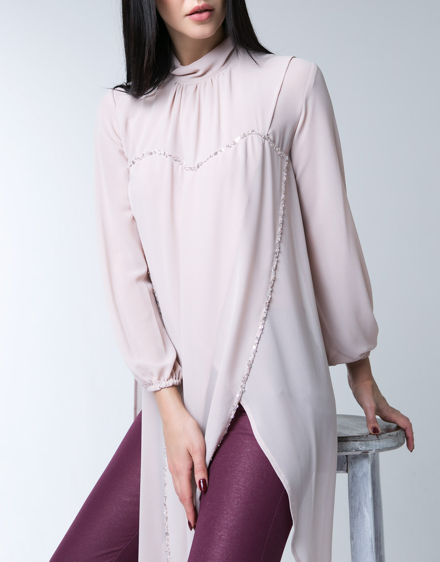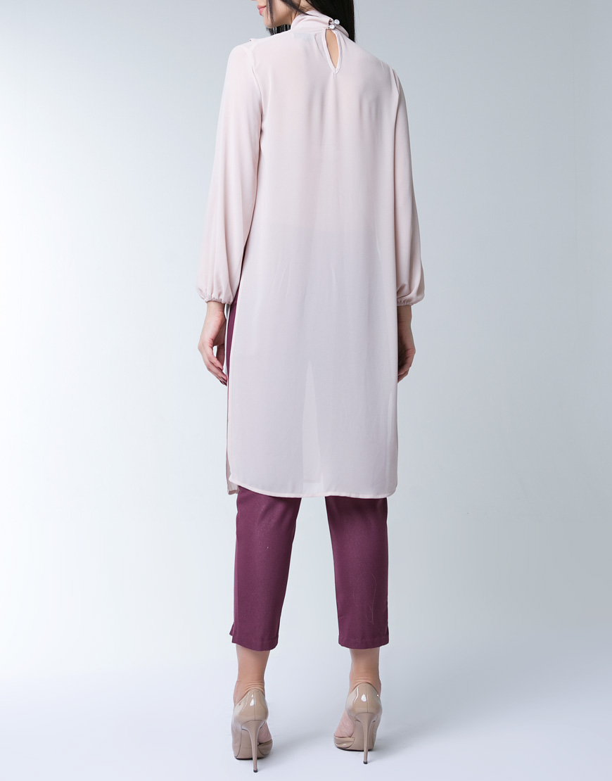 Плащ з рельєфної плащової тканини на підкладці з віскози йде на 4 ґудзики. Напівприталений силует трохи розширений до низу. Ззаду шліца. Декоративно оформлена кокетка рядками і лініями в районі грудей.Рукав прямий зі звичайною проймою з декоративною обробкою по низу у вигляді рюші з невеликим розрізом . Кишені прорізні.