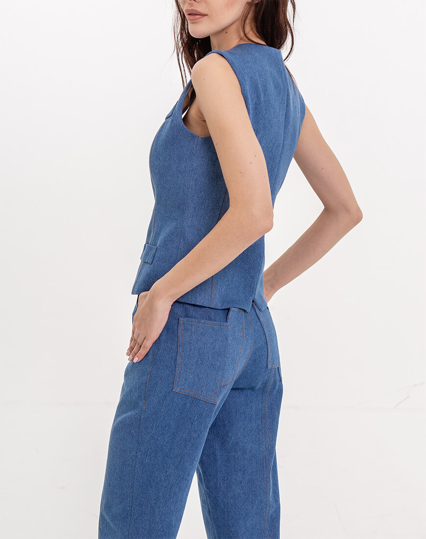 Доставка впродовж 2-5 робочих днівЗверніть увагу, що розмір XL доступний для індивідуального пошиття за вашими параметрами. Жилет з джинса приталеного силуету, підкреслює фігуру. Зроблений на бавовняній підкладці. На ґудзиках, є карман-обманка зверху на грудях і два знизу. Можна носити як на білизну у вигляді топа на літо або під жакет, або ж взяти на розмір більше і носити поверх іншого одягу, футболки, сорочки чи гольфа. Завдяки кольору та фасону чудово поєднується з джинсами, брюками різних фасонів, шортами та спідницями. Доповнивши його такими ж брюками та жакетом з деніму з цієї колекції можна скласти красивий і стильний костюм-трійку.