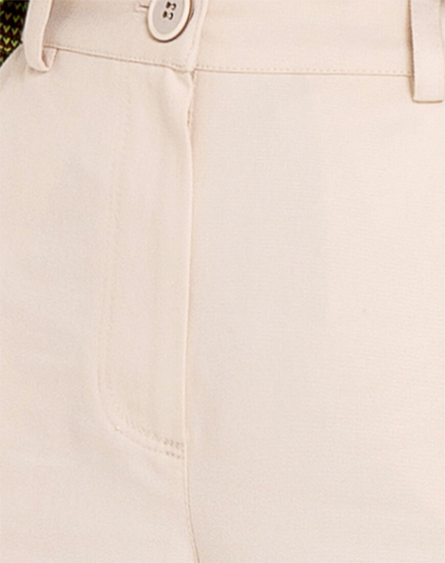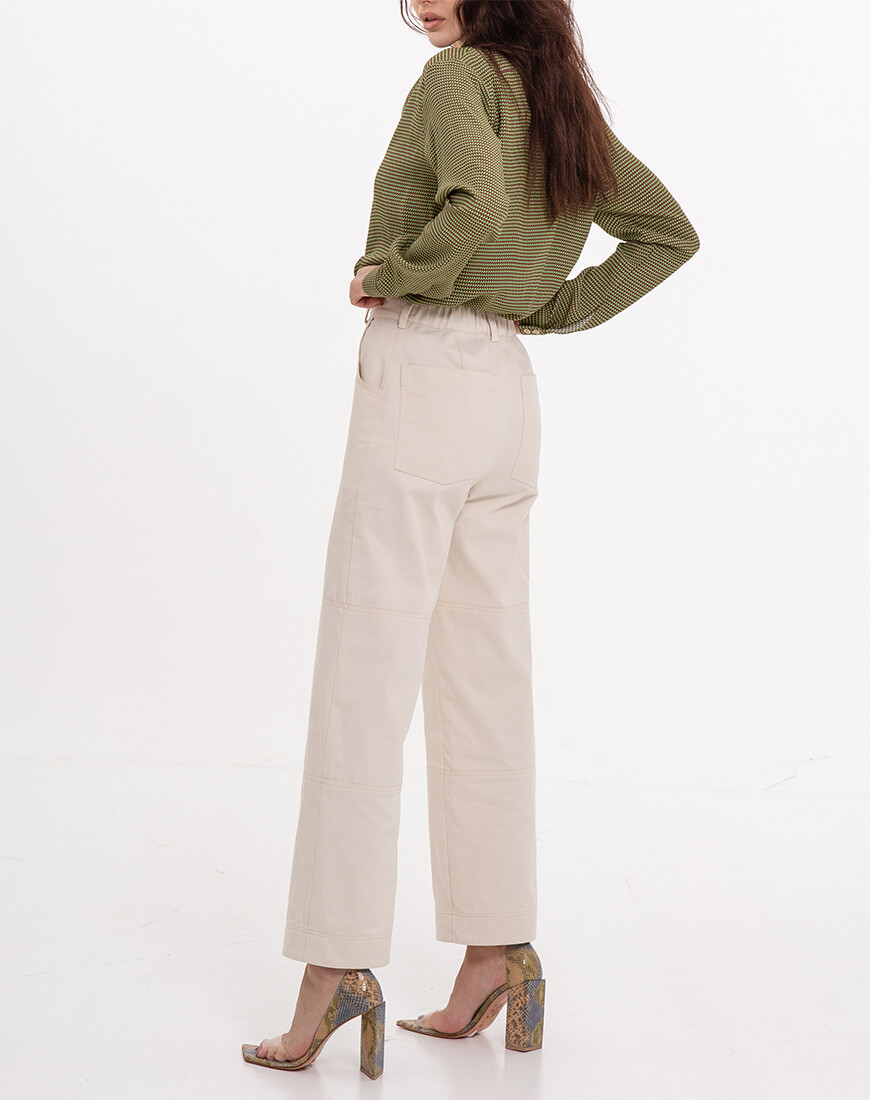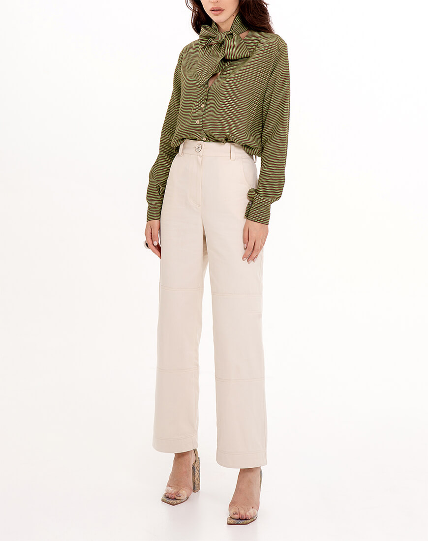 Коттонові штани прямого крою мають шльовки для пояса, низ штанів можна підвертати, тоді вони мають більш кежуал вигляд. Над коліном і нижче коліна є декоративні строчки по колу. Гарний вигляд мають з різними видами поясів. Чудово поєднуються з жакетом із цієї ж тканини. Виглядає, як костюм. І з тренчем із такої ж тканини.