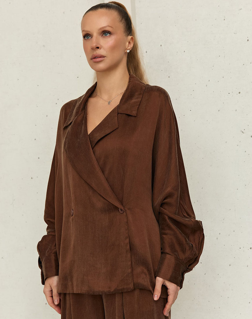 Жакет на запах із чітким зібраним силуетом. Глибокий V-подібний виріз підкреслює лінію декольте та додає образу виразності.