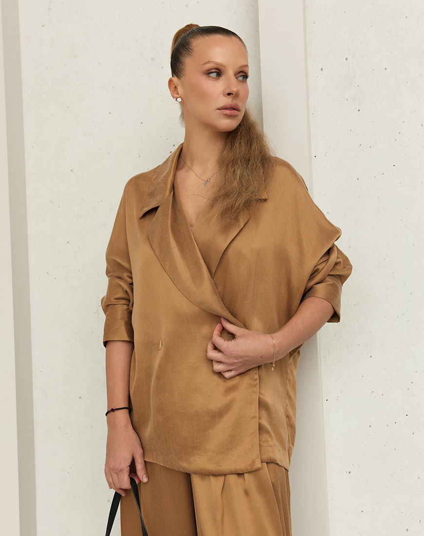 Жакет на запах із чітким зібраним силуетом. Глибокий V-подібний виріз підкреслює лінію декольте та додає образу виразності.