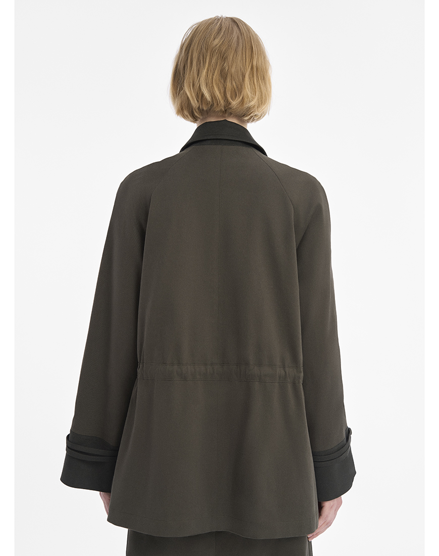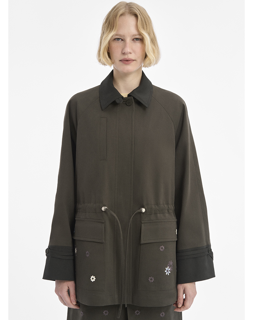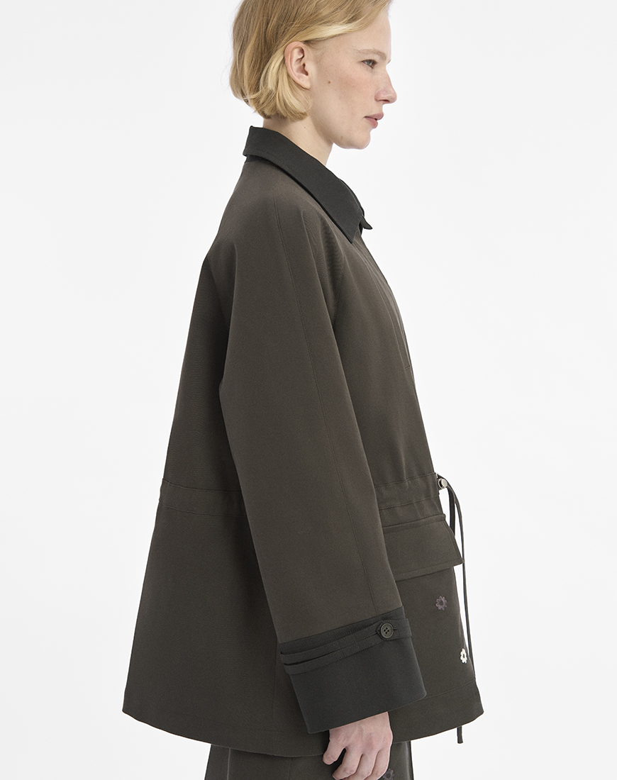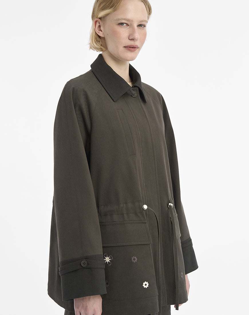 Цей виріб варіативний у носінні. Куліска з фіксаторами дає змогу змінювати силует — від вільного до приталеного. Викладчастий комір за потреби підіймається та застібається на ґудзик, а на манжетах передбачені регулятори ширини.