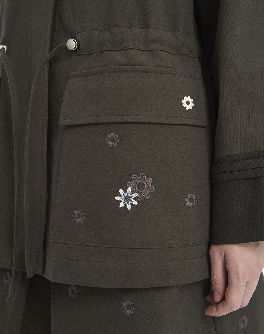 Куртка зі щільного котону виконана на підкладці. Застібається на ґудзики. Місткі накладні кишені прикрашені квітковою вишивкою в тон коміра та манжетів.
