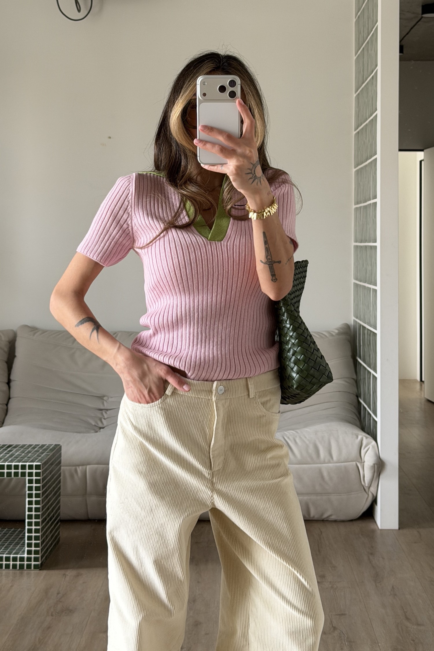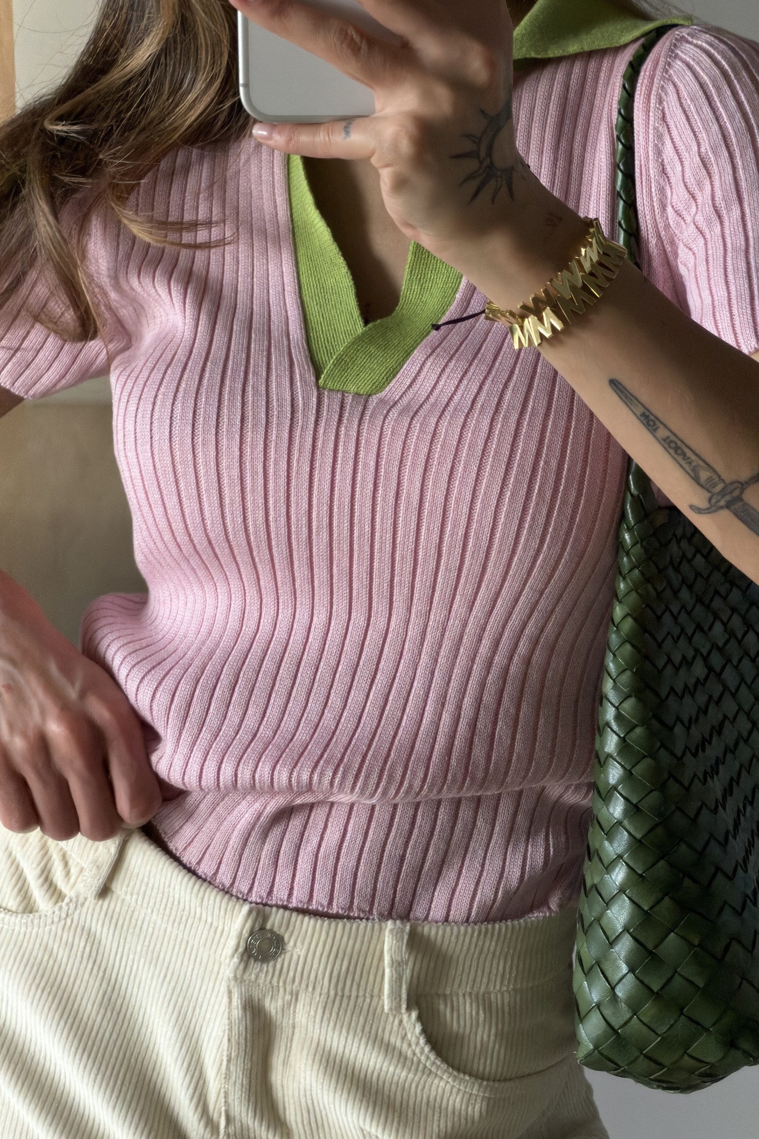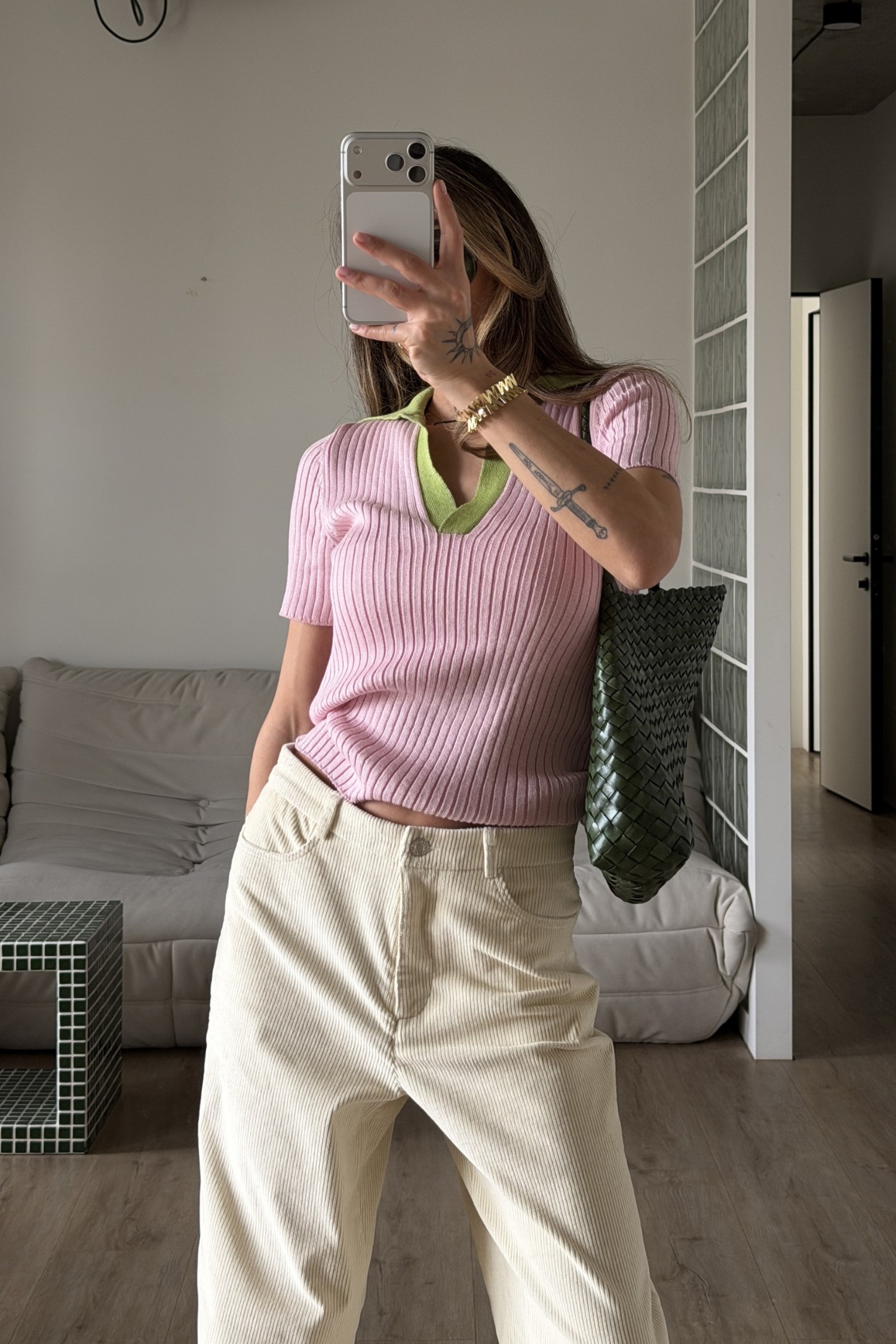 ДоставкаДжемпер поло з трикотажу рожевого відтінку, комір оформлено салатовою вставкою. Виготовлений з 100% бавовняної пряжі.