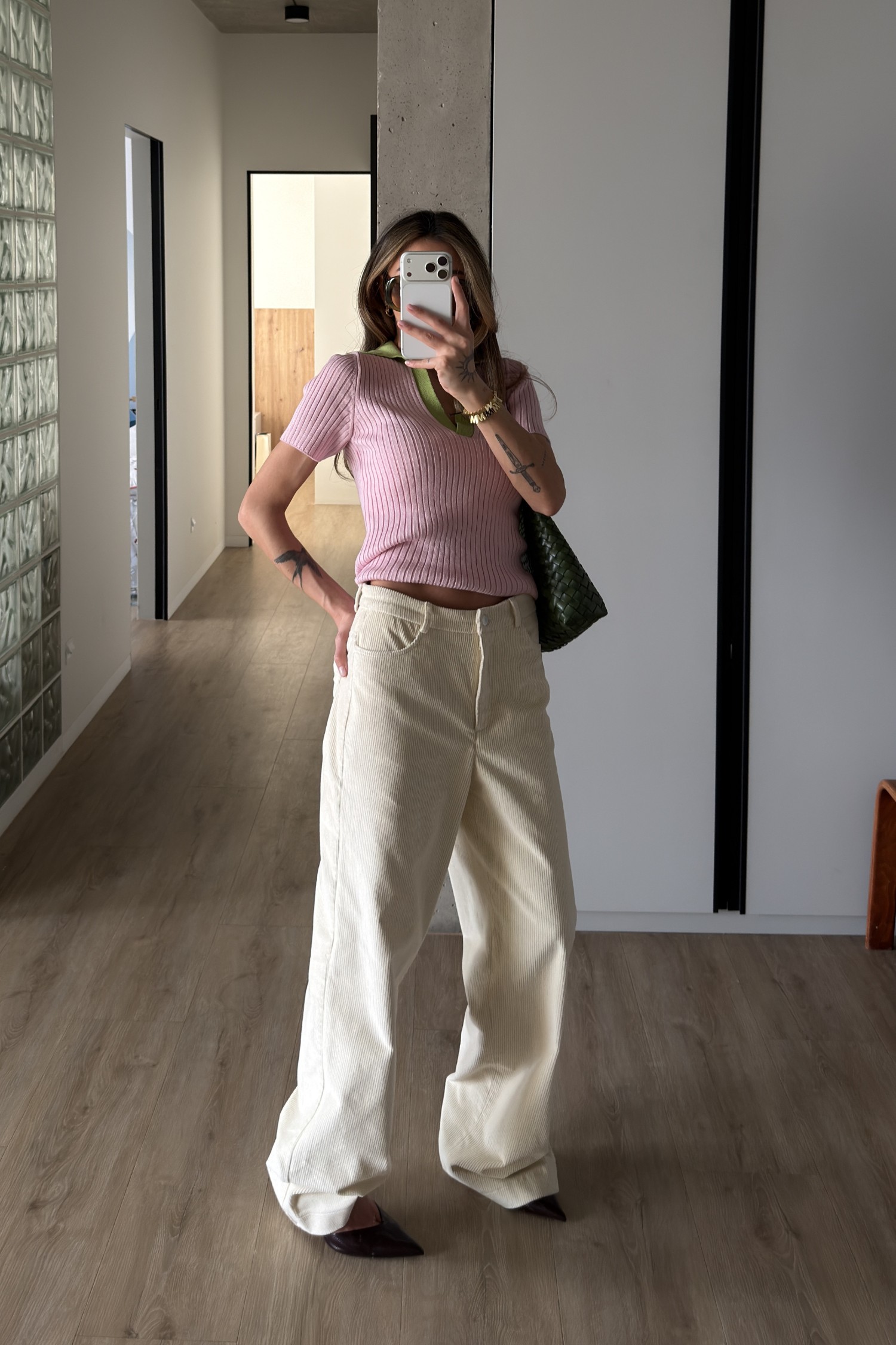 Підходить для повсякденного носіння завдяки натуральній тканині і приємній на дотик фактурі. Добре поєднується з молочними вельветовими брюками вільного крою.