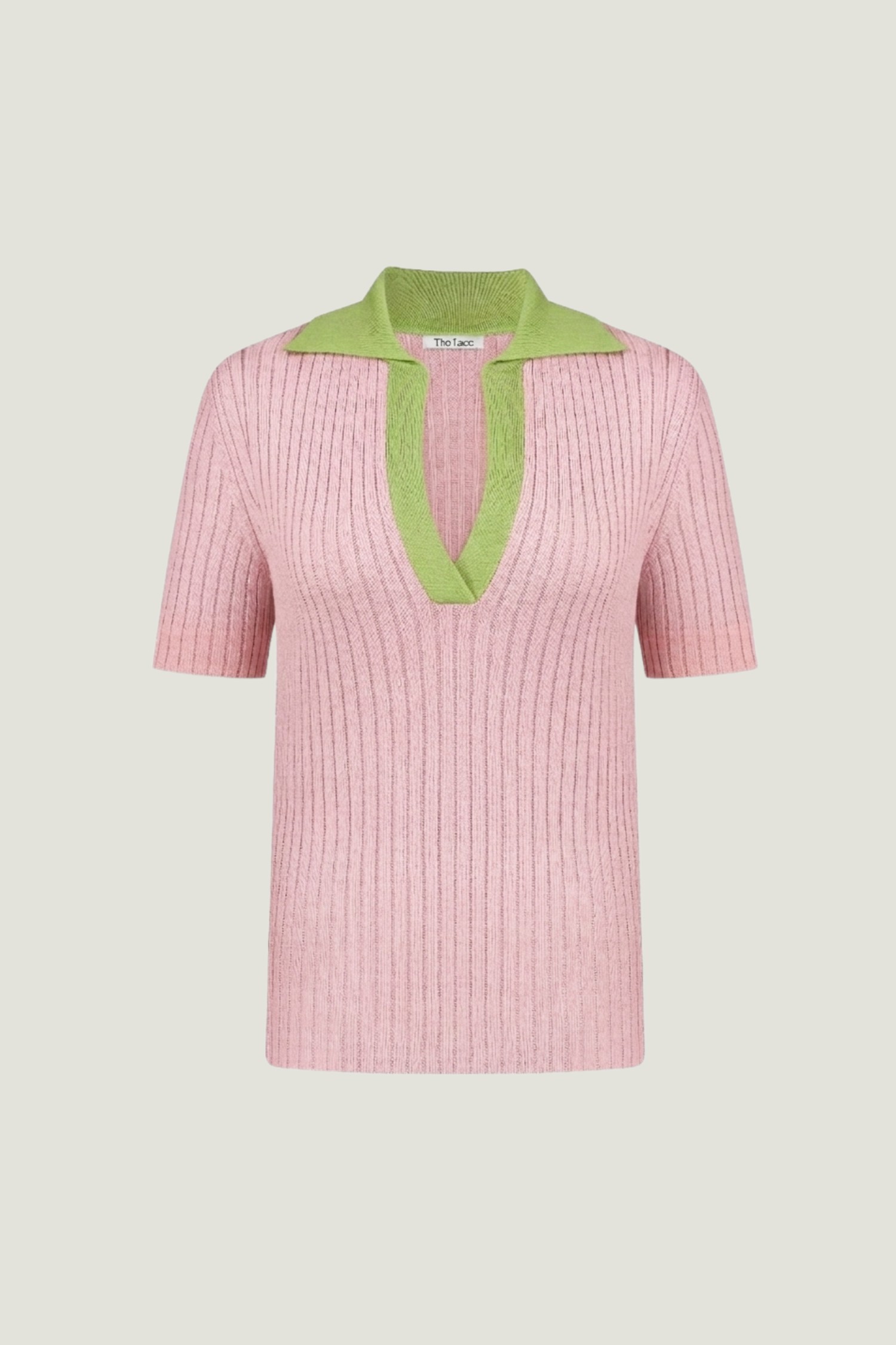 Жiночий джемпер поло рожевий з салатовою вставкою