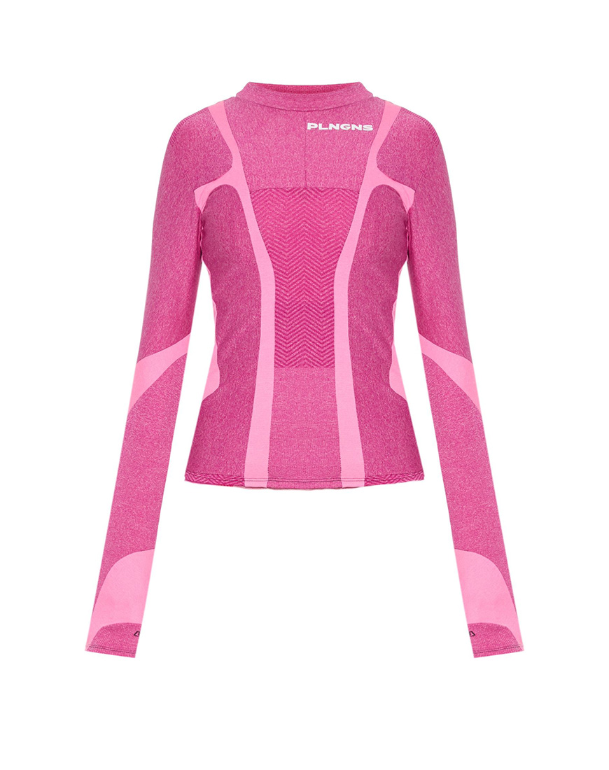 Унікальний жіночий лонгслив PLNGNS, виготовлений з використаних компресійних футболок та рашгардів, повторно зібраних у фірмовому стилі бренду. Приталений жіночий силует підкреслює фігуру, а яскравий принт робить річ акцентною частиною образу. Ця модель брала участь у дебютному шоу колекції “Ain’t it different” в рамках Berlin Fashion Week, де PLNGNS представив повноцінну подіумну колекцію.