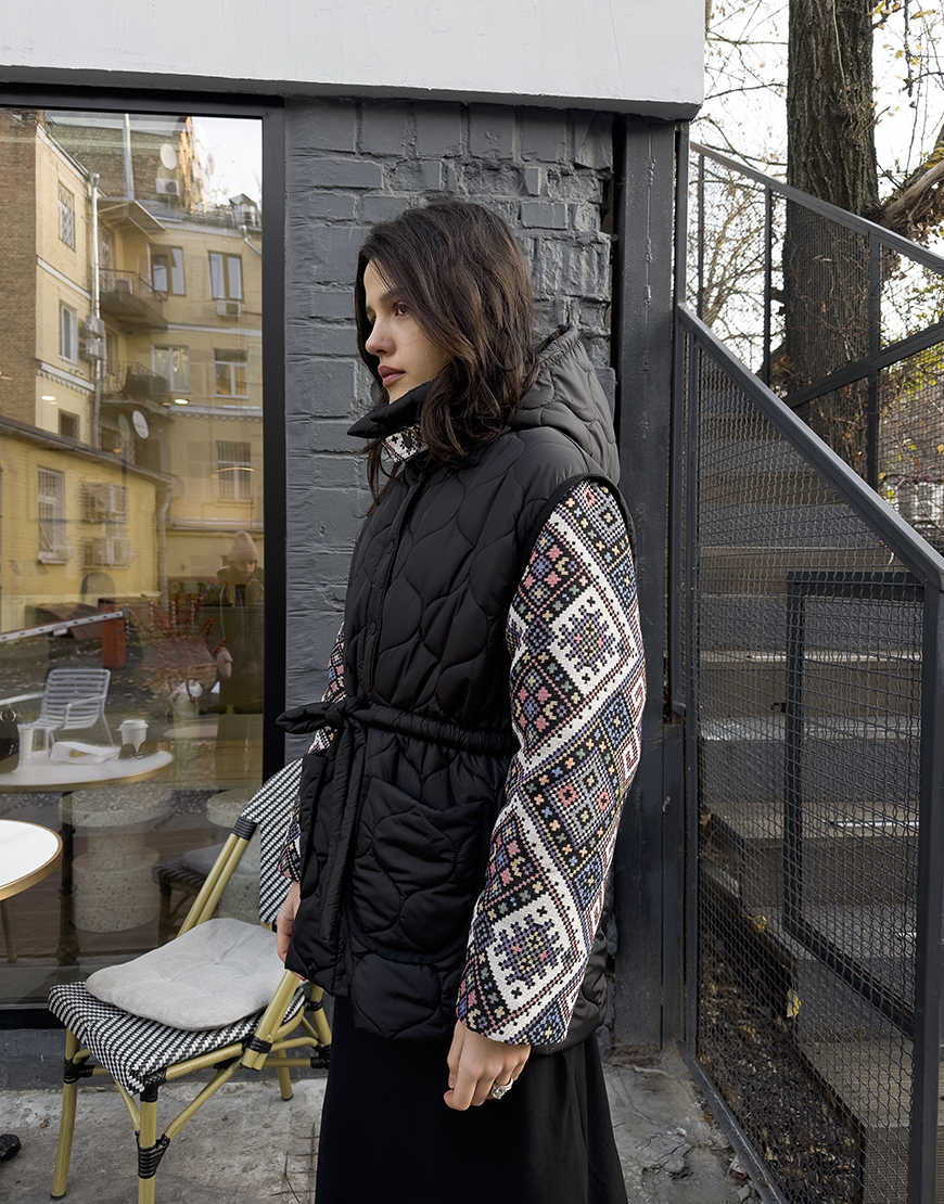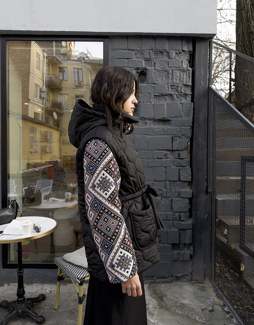 Доставка впродовж 2-5 робочих днівСтьобаний пуховик прямого силуету, застібка на кнопки. Рукава оздоблені українським традиційним орнаментом – вишиванка. Наявний капюшон, який відстібається. На талії є куліска, за допомогою якої можна підкреслити талію. Наповнювач спресований еко пух, легкий і дуже теплий, витримує до -10 градусів.