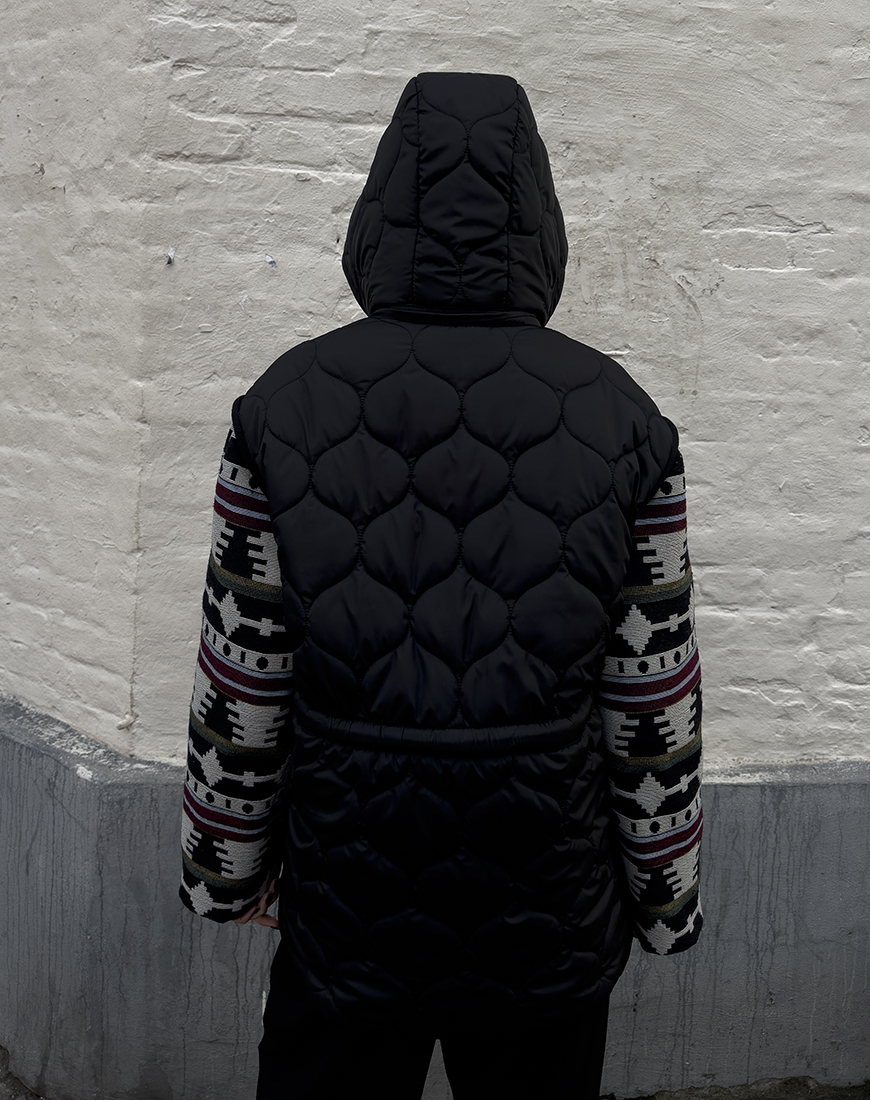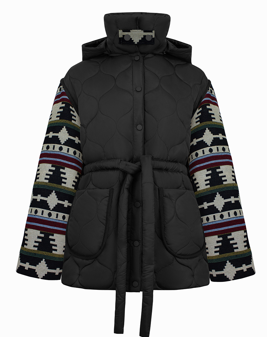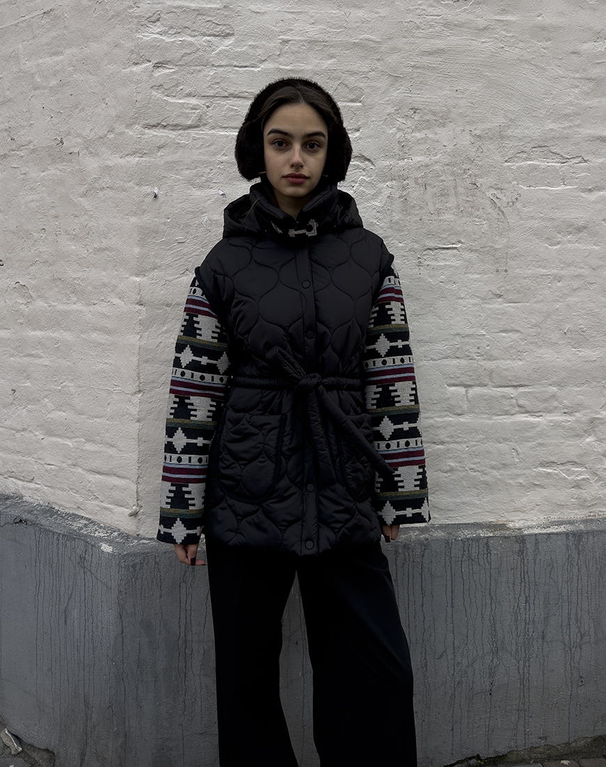 Стьобаний пуховик прямого силуету, застібка на кнопки. Рукава оздоблені традиційним гуцульським орнаментом. Наявний капюшон, який відстібається. На талії є куліска, за допомогою якої можна підкреслити талію. Наповнювач спресований еко пух, легкий і дуже теплий, витримує до -10 градусів.