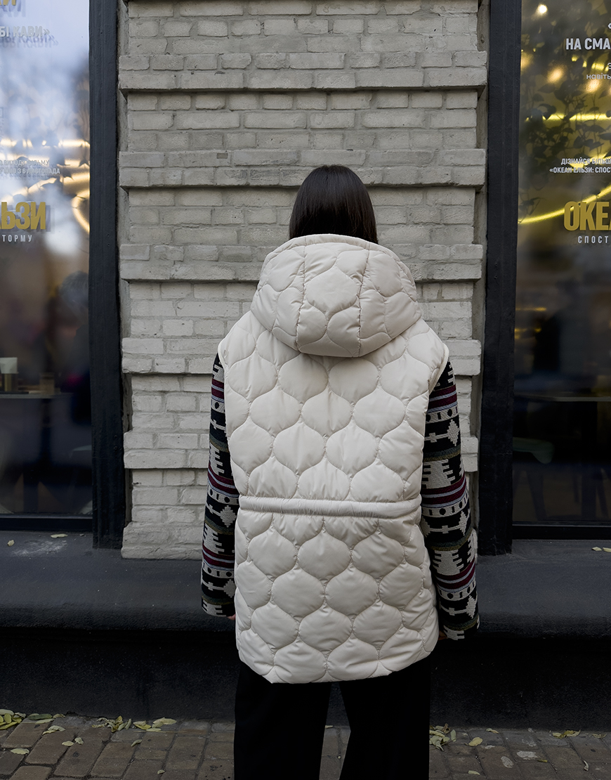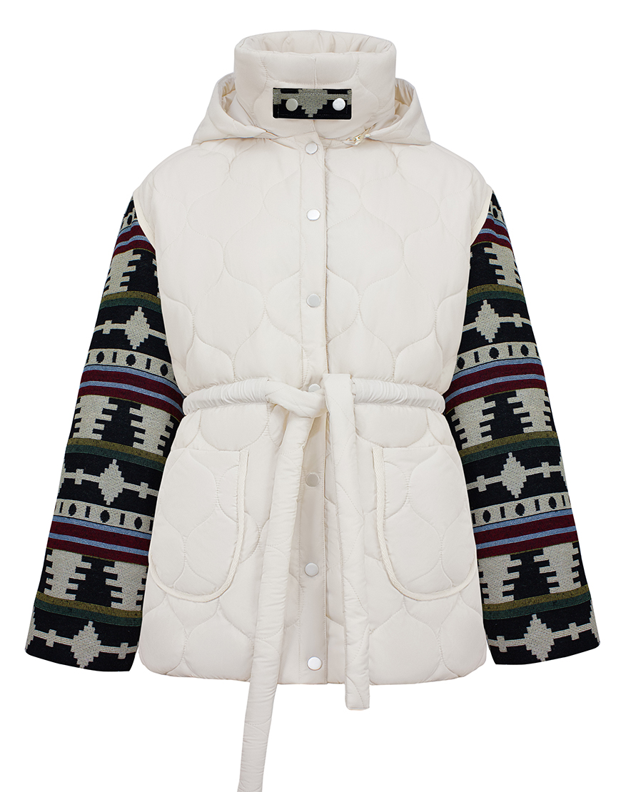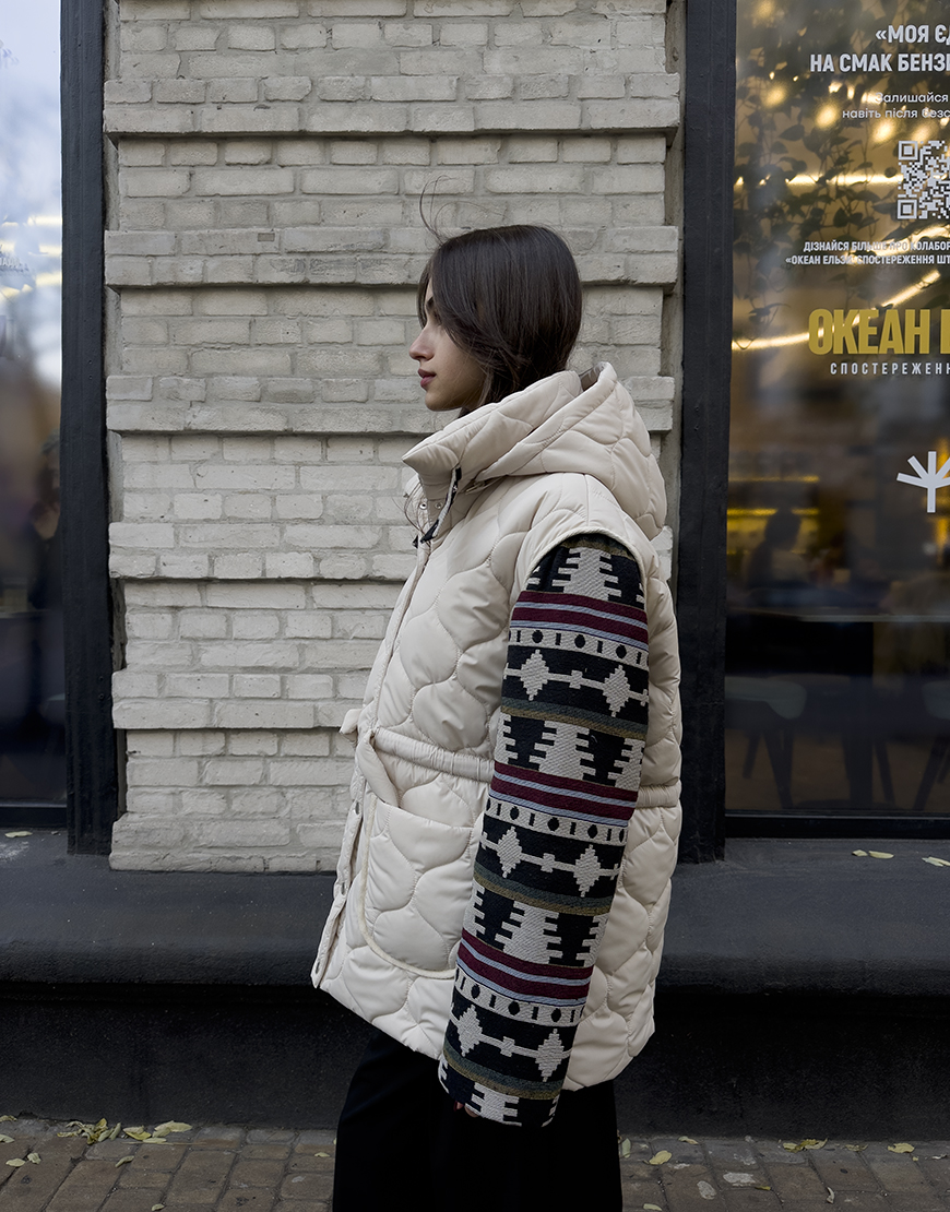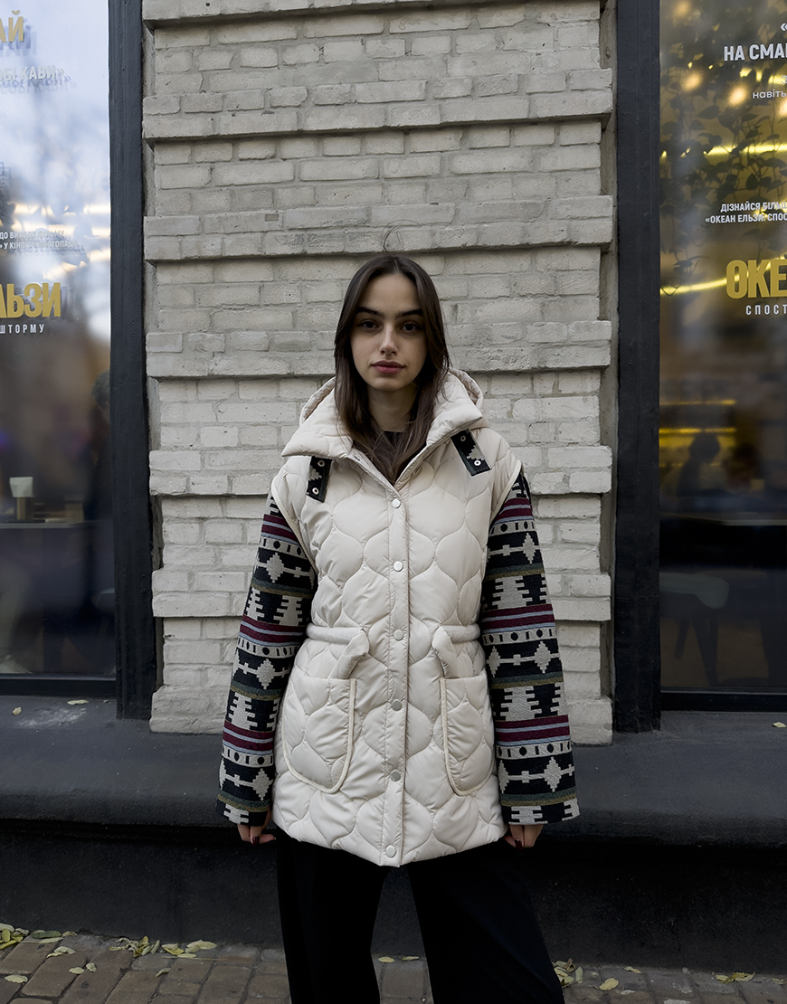 Доставка впродовж 2-5 робочих днівСтьобаний пуховик прямого силуету, застібка на кнопки. Рукава оздоблені традиційним гуцульським орнаментом. Наявний капюшон, який відстібається. На талії є куліска, за допомогою якої можна підкреслити талію. Наповнювач спресований еко пух, легкий і дуже теплий, витримує до -10 градусів.