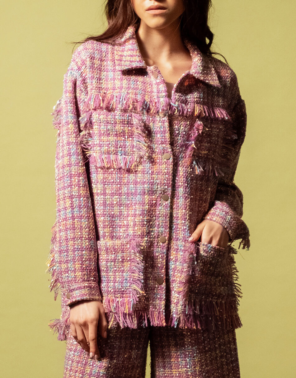 Доставка впродовж 2-5 робочих днівЖакет подовжений з твідової тканини. Жакет over size крою, застібка на кнопках. Є чотири кишені. Обробка – бахрома по низу, на кишенях, на кокетці та вздовж рукава.