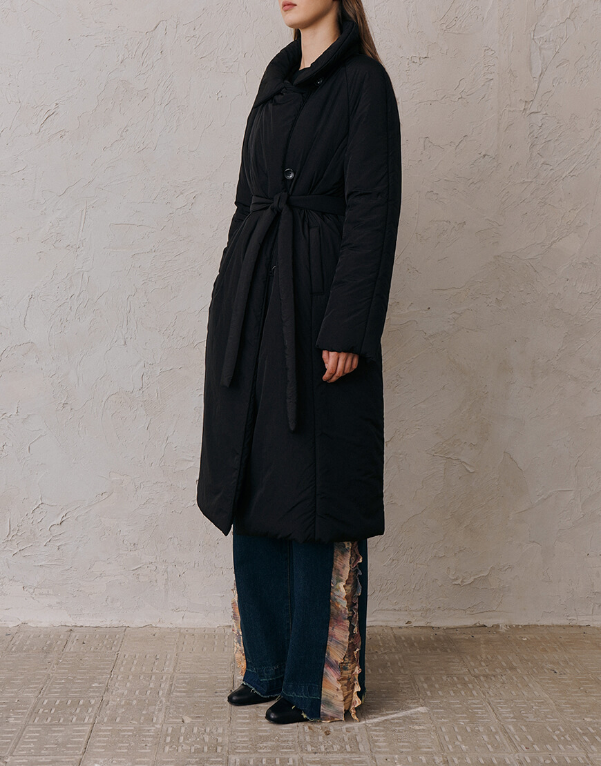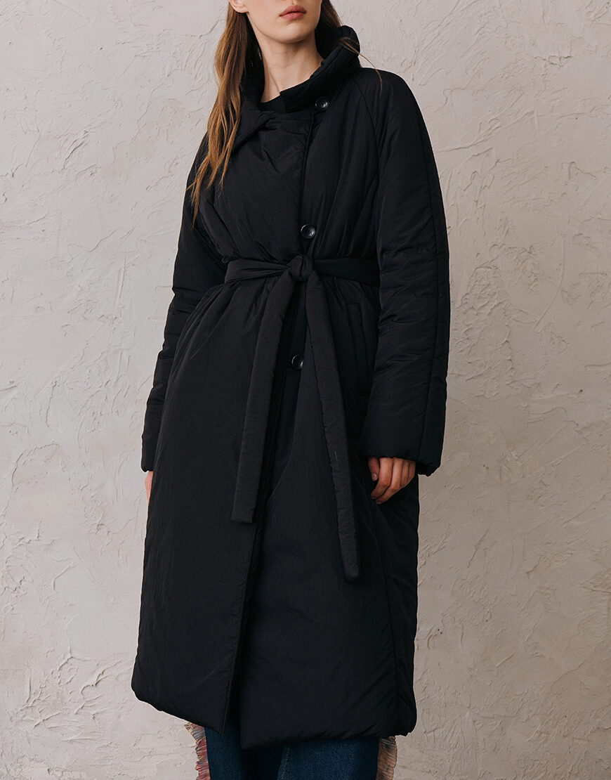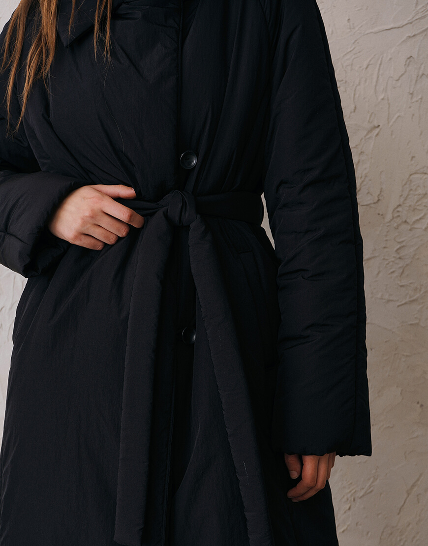 Пуховик прямого силуету, застібка на ґудзики, наявний пояс, рукав-реглан. Комір-стійка закриває шию. Наповнювач, синтетичний пух, витримує до -10-12 градусів морозу.