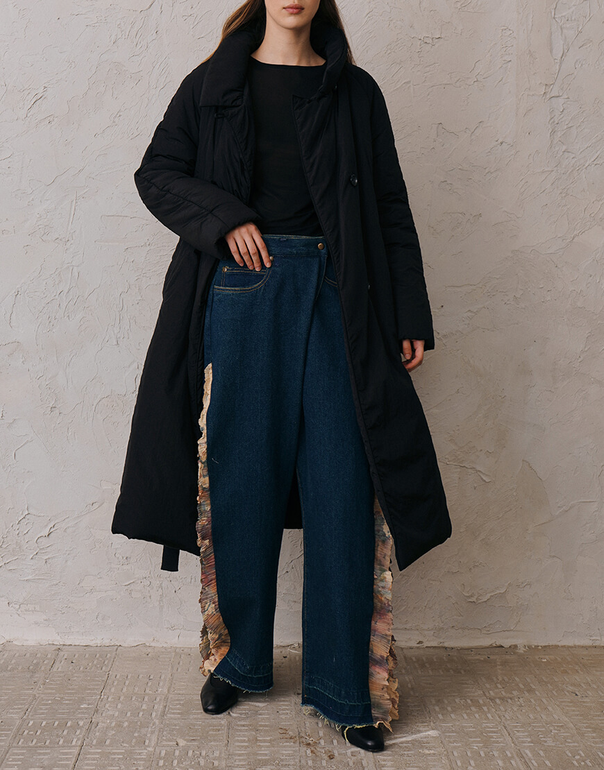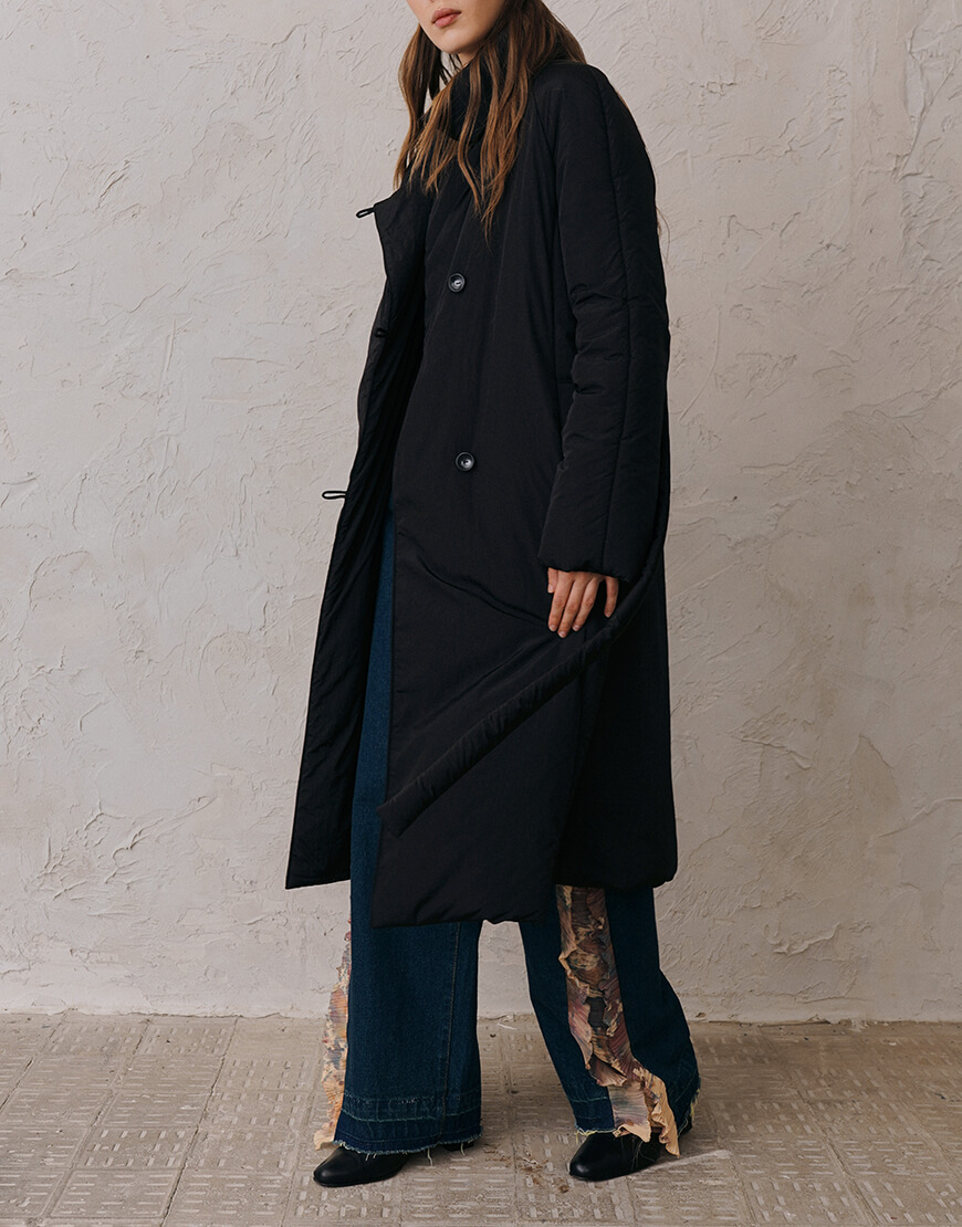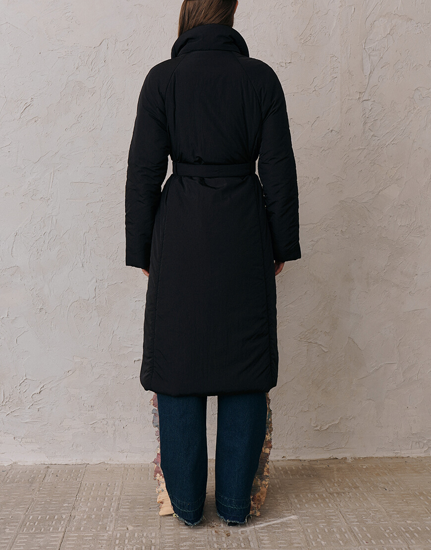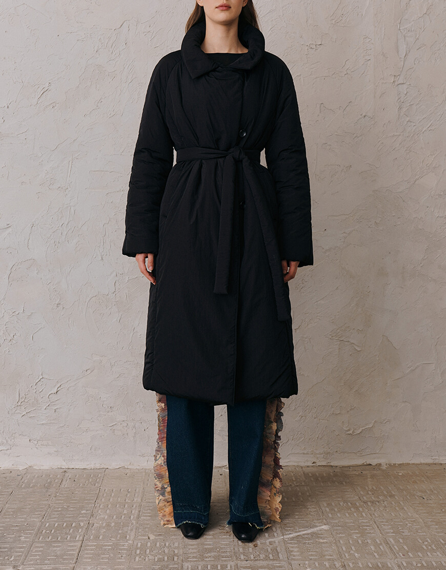 Пуховик прямого силуету, застібка на ґудзики, наявний пояс, рукав-реглан. Комір-стійка закриває шию. Наповнювач, синтетичний пух, витримує до -10-12 градусів морозу.