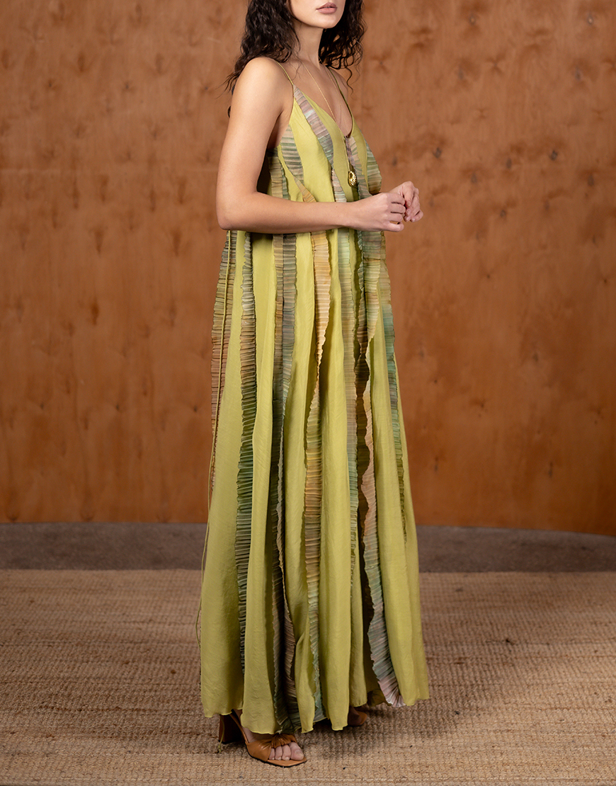 Доставка впродовж 2-5 робочих днівСукня максі з декоративними вставками. Вставки ручної роботи, виконані з тканини плісе, повністю розмальовані дизайнером. Кольорова палітра нагадує дику природу, шелест вітру, гори та безкраї поля. Бретелі сукні тонкі, регулюються по довжині. Сукня повністю двошарова, не світиться, виконана з легкого шовкового батисту. Кожна сукня йде унікальною, малюнок не повторюється.