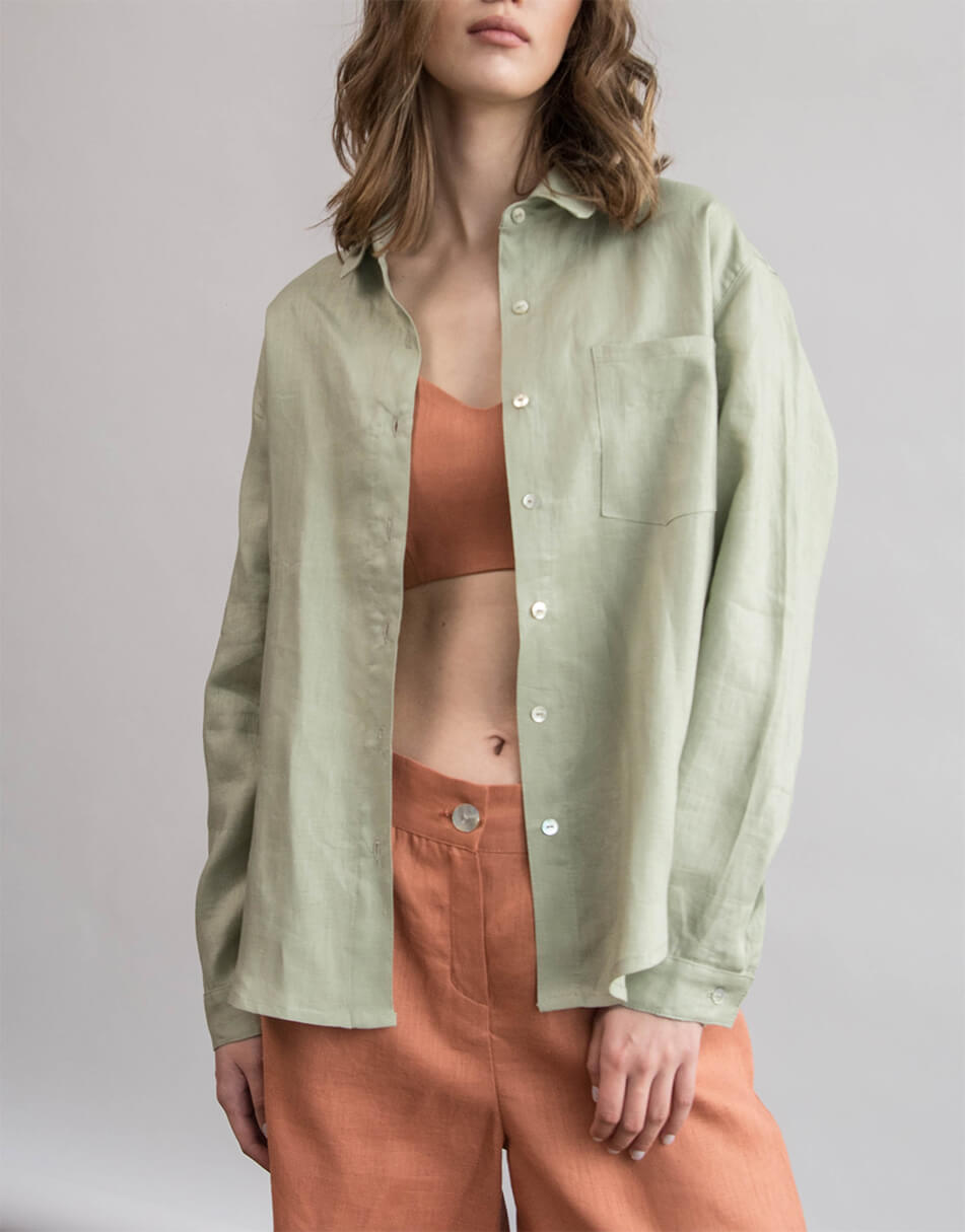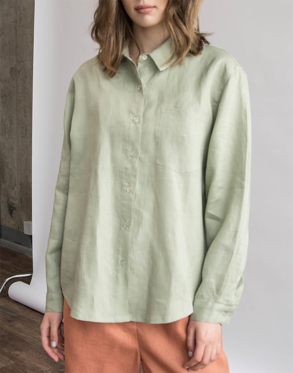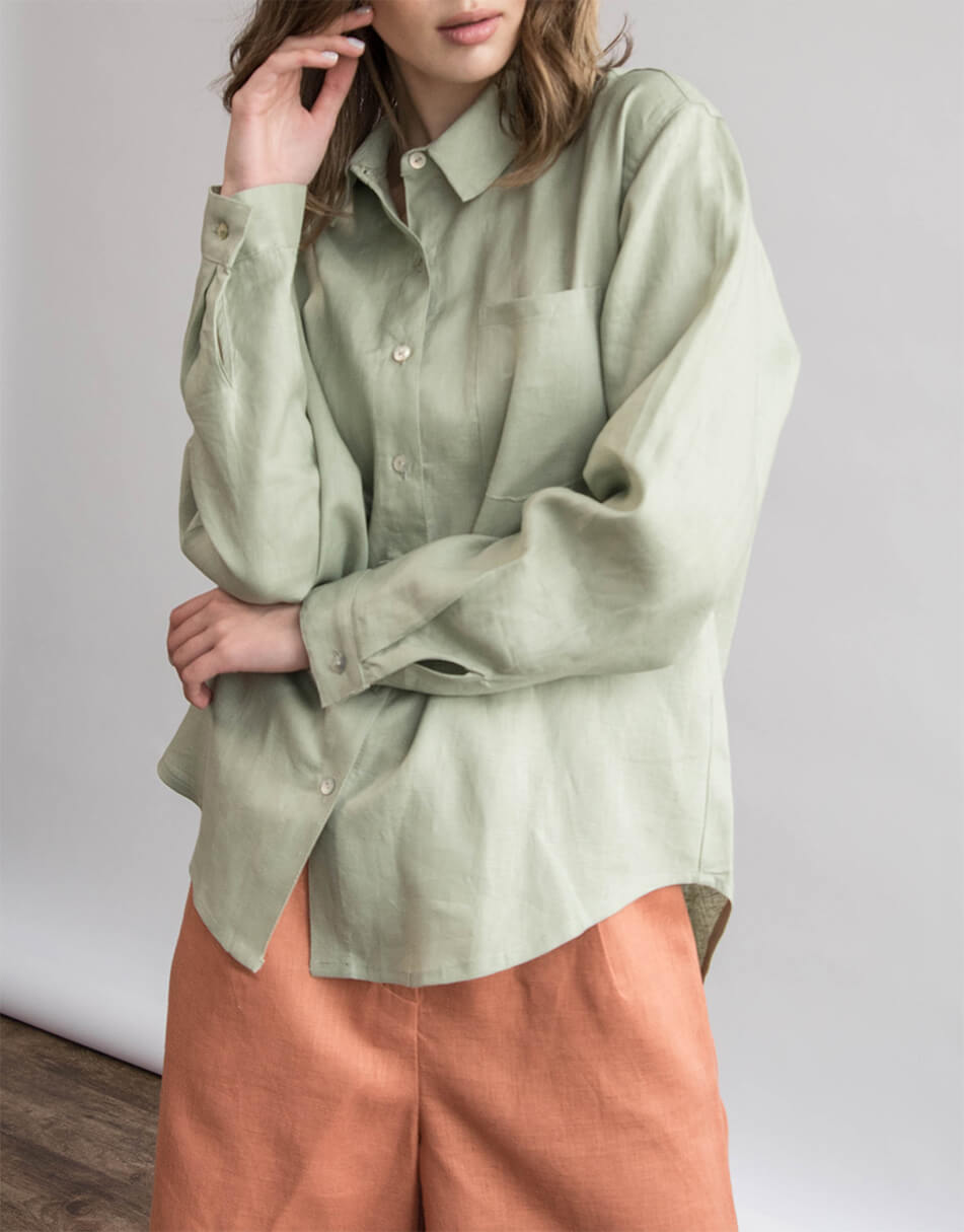 Сорочка лляна, oversize крою. Рукав вільного крою, довжина повна. Ґудзики виконані з натурального перламутру. Довжина сорочки по спинці трохи довша ніж спереду.