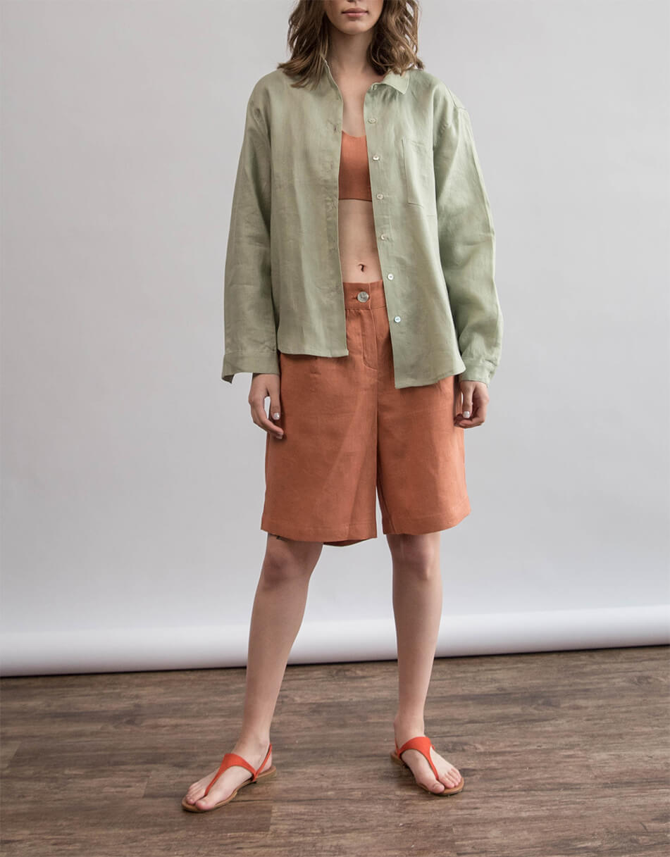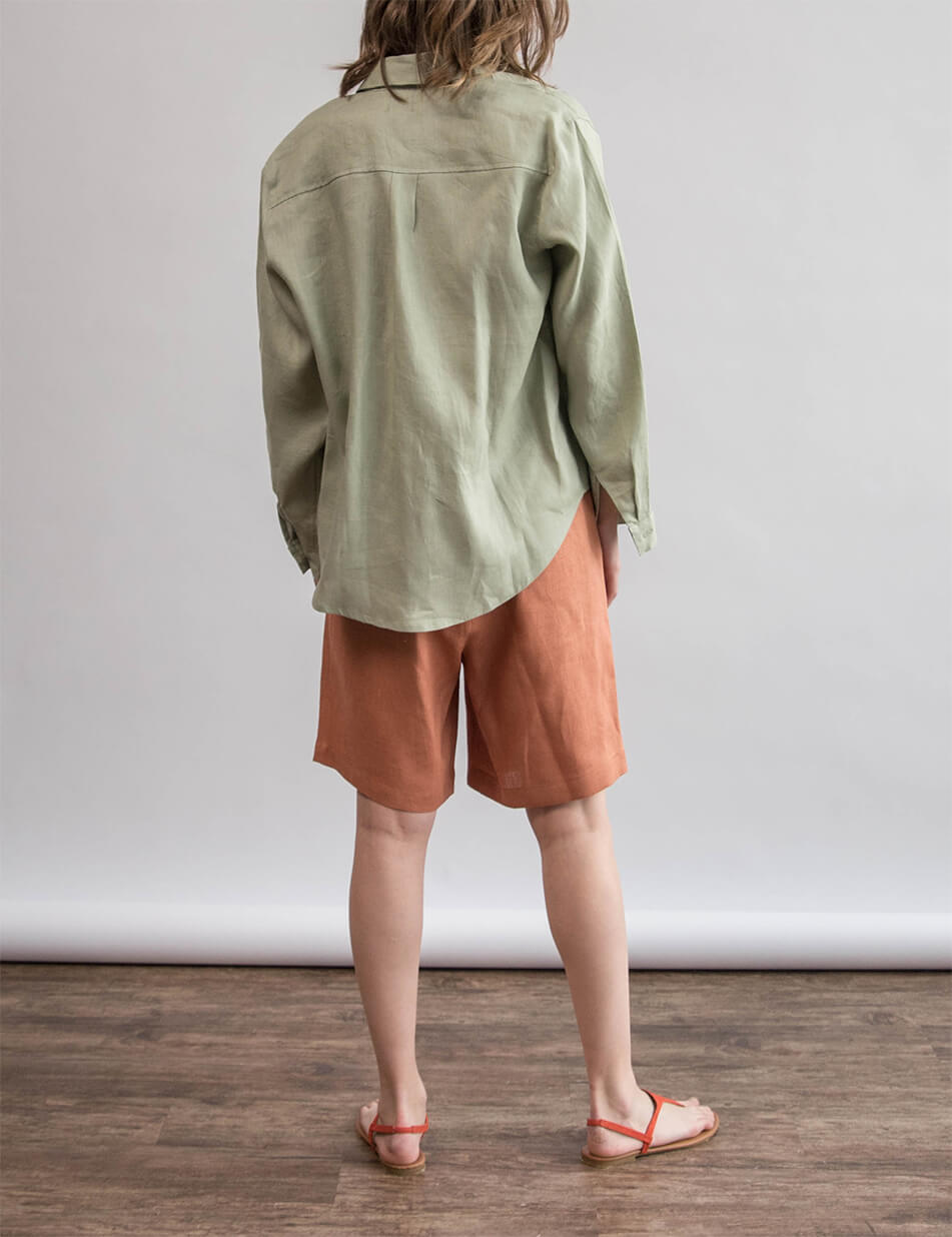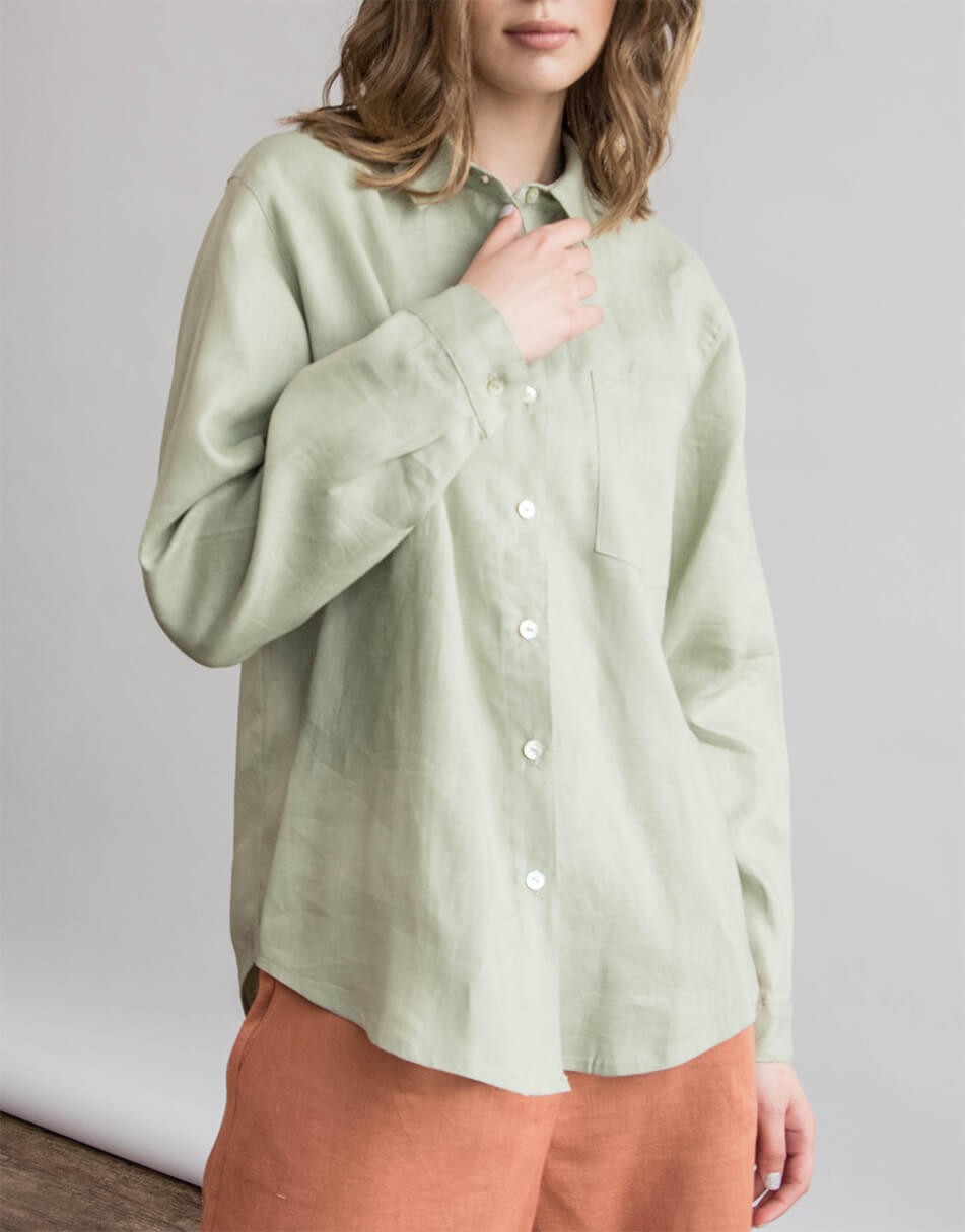 Сорочка лляна, oversize крою. Рукав вільного крою, довжина повна. Ґудзики виконані з натурального перламутру. Довжина сорочки по спинці трохи довша ніж спереду.