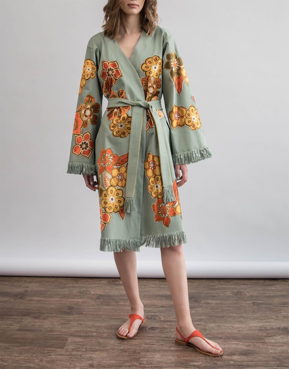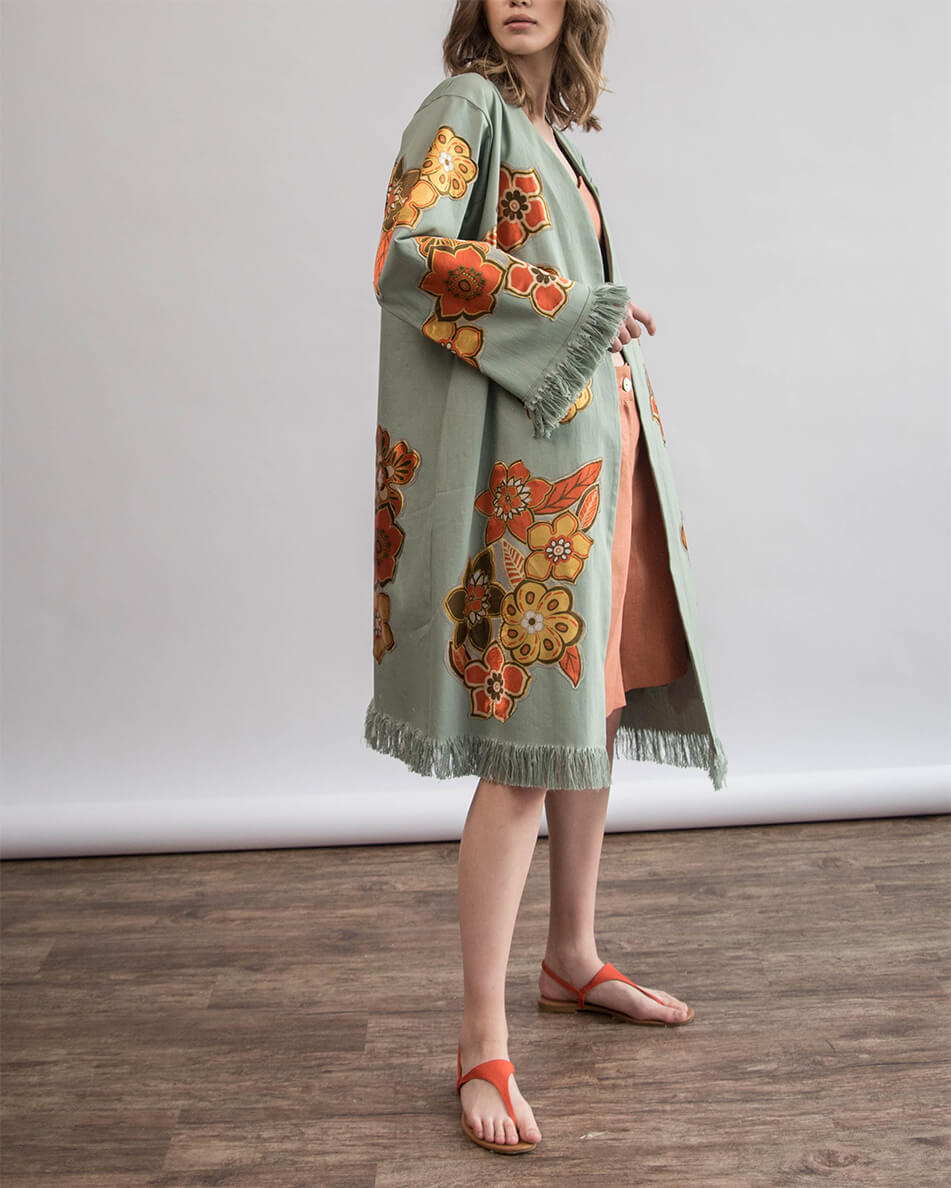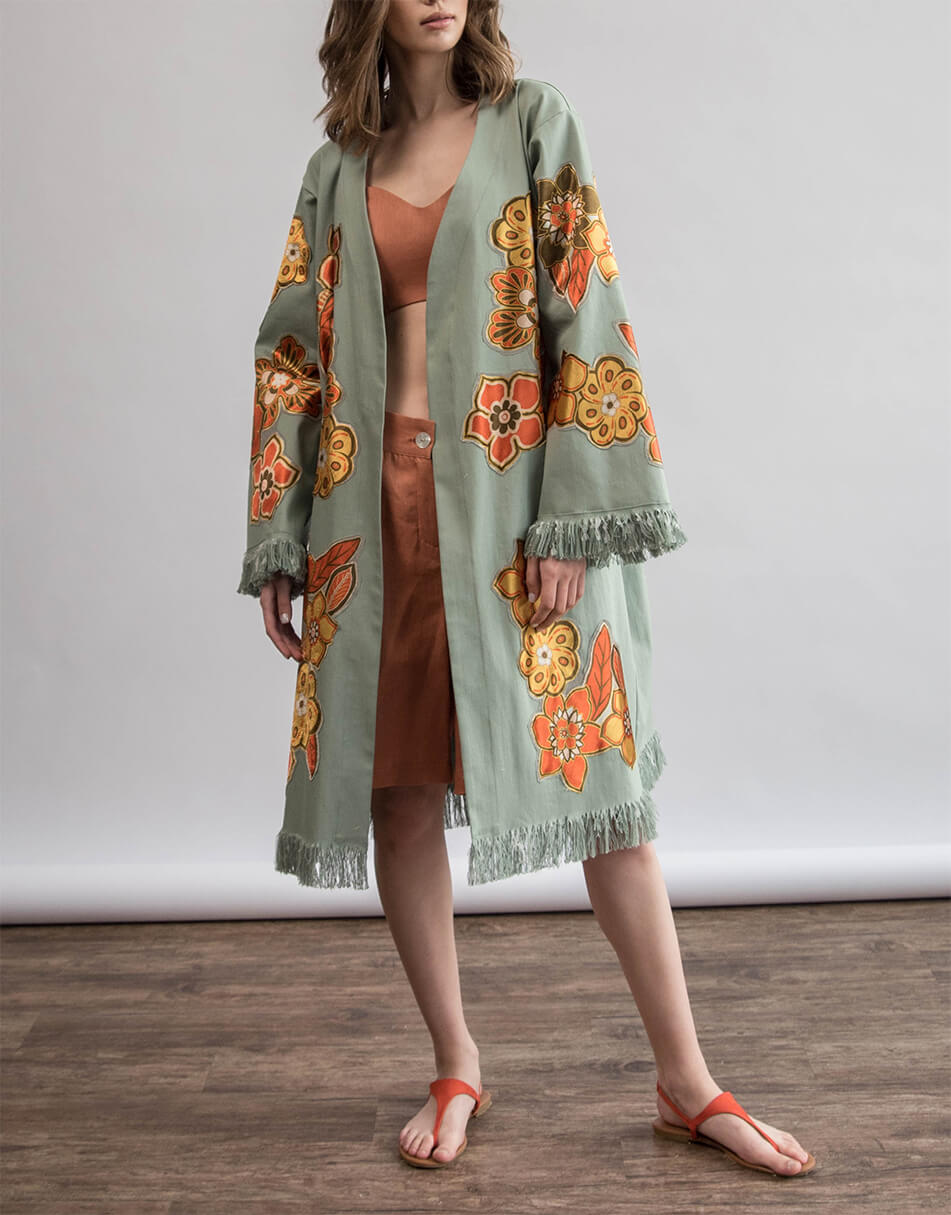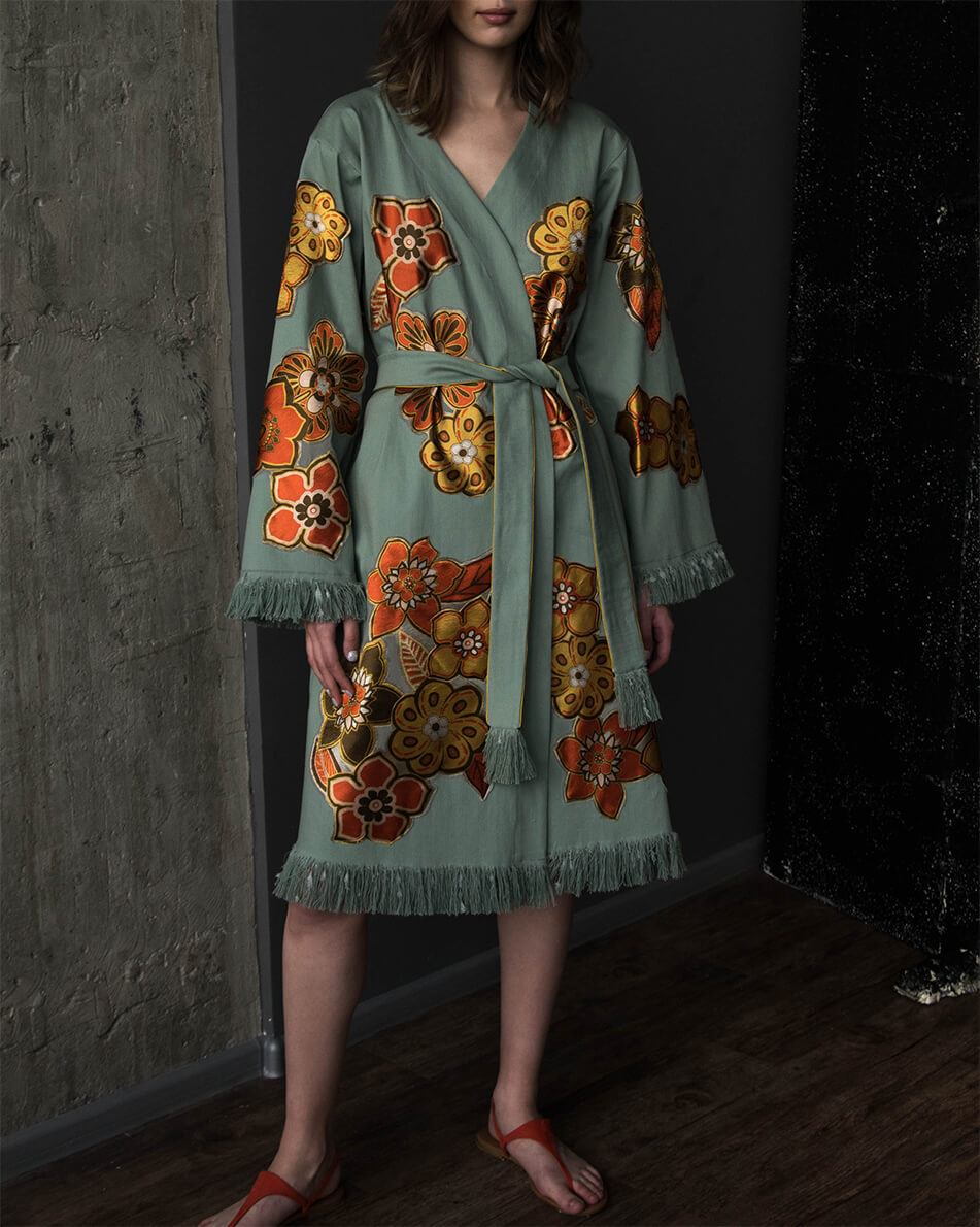 Кімоно з вишитими вручну квітами. Вільного крою з широким рукавом. Кімоно декороване бахромою на рукавах і по лінії низу. Дві кишені в бічних швах. Є пояс із бахромою.